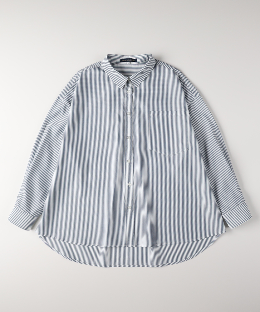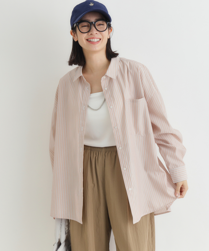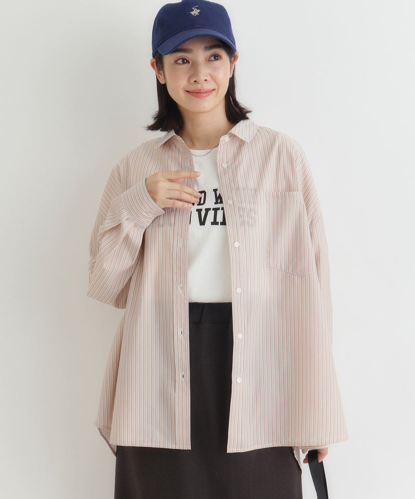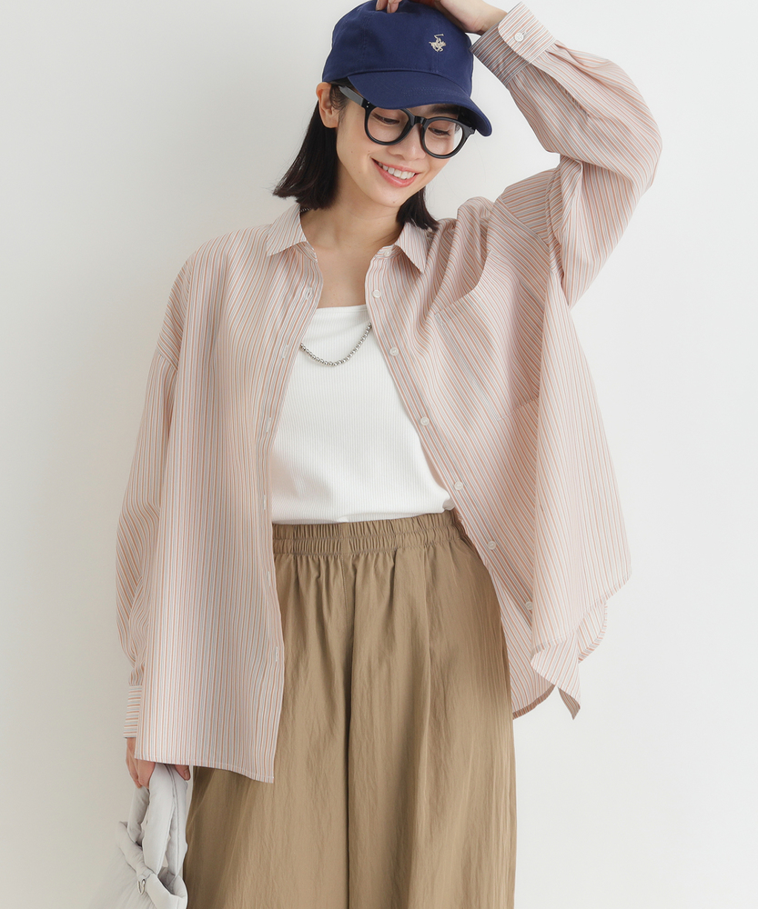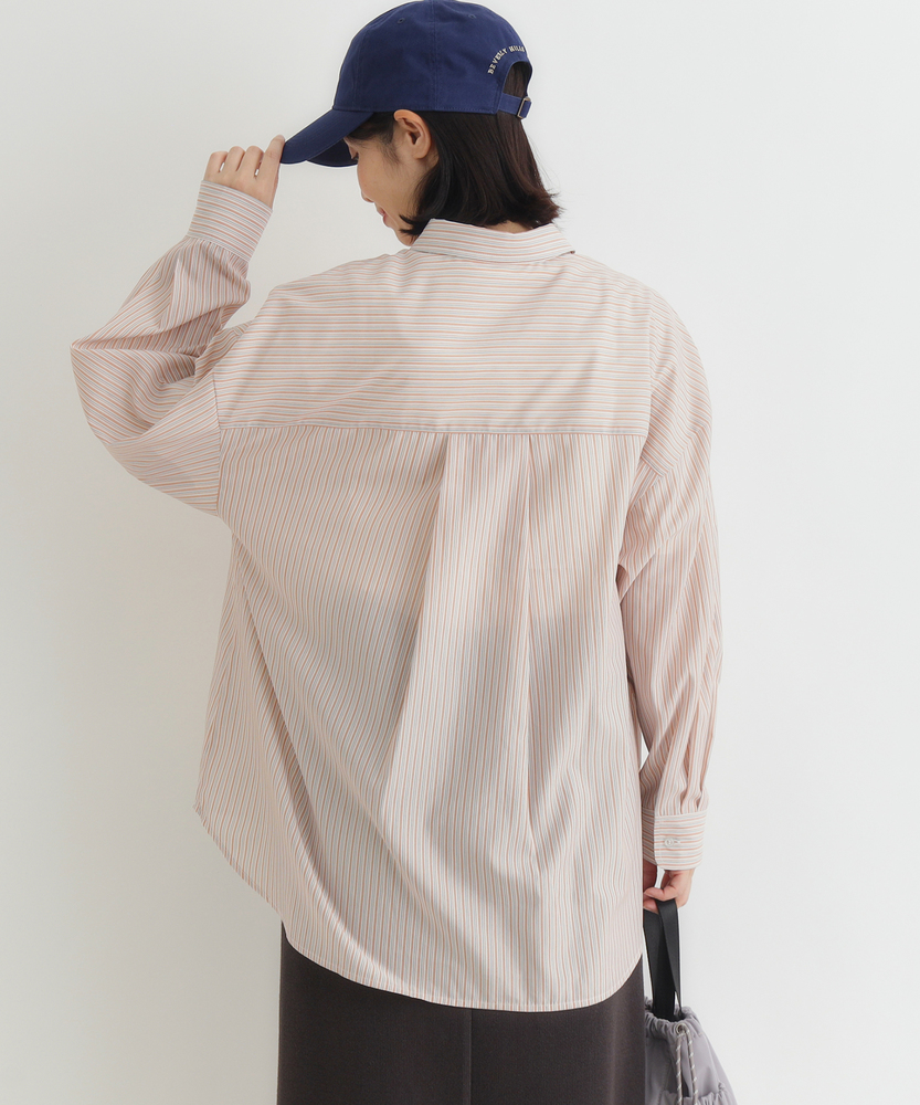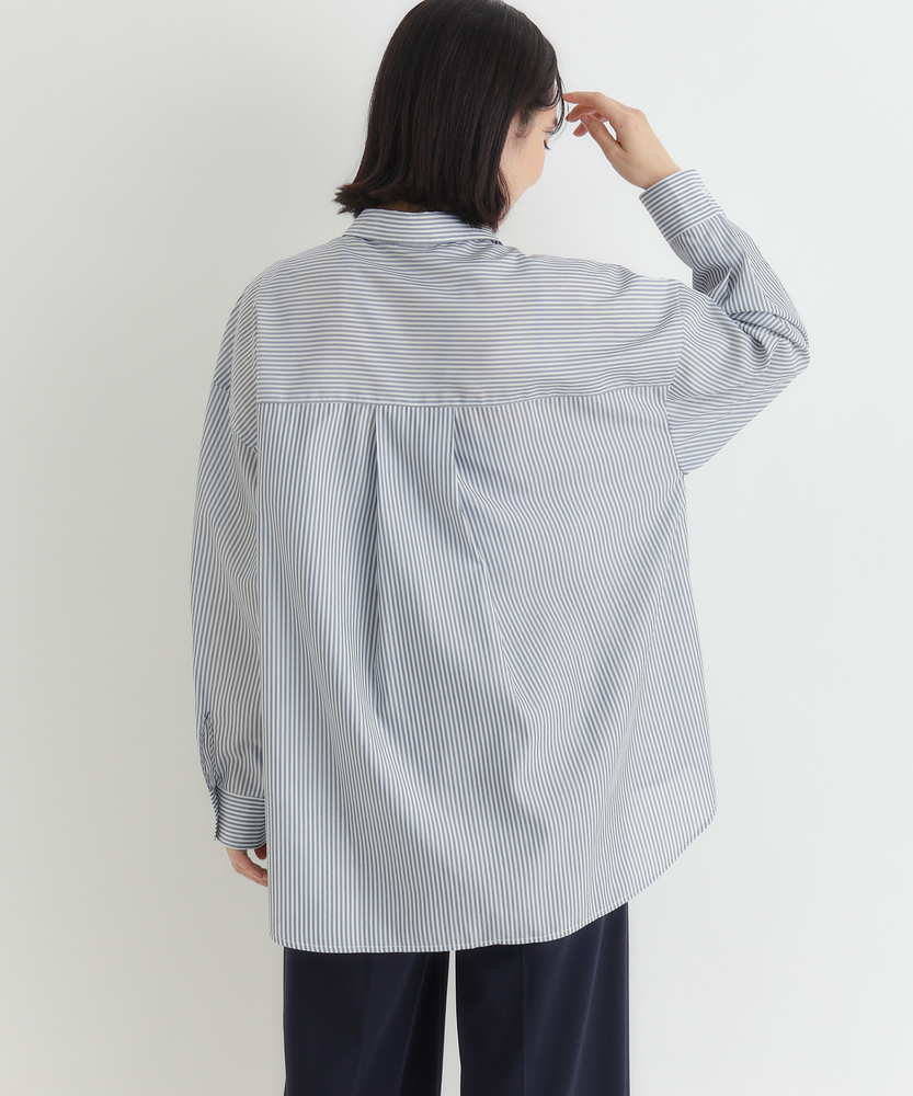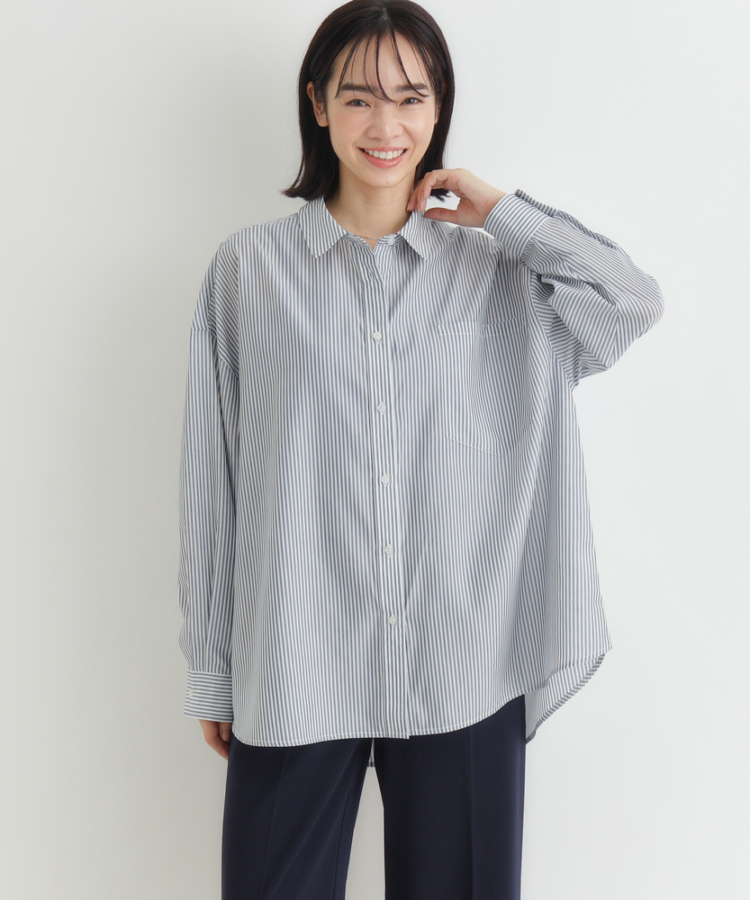 羽織るだけで決まる、大人の抜け感。「楽してキレイ」が叶う一枚。縦ラインですっきり魅せる、旬のシルエット。■Point・トレンドの「ビッグシルエット」身体のラインを拾わない。ゆったりとした着心地。大人のリラックス感を演出。・すっきり見え「ストライプ柄」縦のラインを強調する柄。視覚効果でスタイルアップ。知的で清潔感のある印象に。・華奢見せ「ドロップショルダー」肩のラインを落とした設計。丸みのある女性らしいフォルム。肩周りの窮屈感も解消。・着回し自在「ラウンドヘム」前後差のある裾デザイン。腰回りを自然にカバー。インでもアウトでも様になる。・後ろ姿も完璧「バックタック」背中に施されたタック仕様。立体的なシルエットを作る。動きやすさと洒落感を両立。・季節を問わない「万能アイテム」一枚着としても羽織りとしても。ロングシーズン活躍する一着。日々のコーデの強い味方に。【デザイン】ゆとりを持たせたオーバーサイズな作りが、今どきの抜け感を演出するシャツです。肩を落としたドロップショルダーと、背中に施したタックが立体的で女性らしいフォルムを作り出します。前後差のあるラウンドヘムは、気になる腰回りを自然にカバーしつつ、ボトムスとのバランスを取りやすく設計されています。シンプルながらも計算されたディティールが光る一枚です。【素材】清潔感があり、さらりとした肌触りのシャツ生地を使用しています。程よいハリ感がありながらも身体に馴染みやすく、快適な着心地を実現しました。カジュアル過ぎず上品な風合いで、オンオフ問わずに幅広いシーンで活躍します。ロングシーズン着回せるのも嬉しいポイントです。【スタイリング】ボタンを少し開けて抜き襟気味に着ると、こなれた大人の雰囲気に仕上がります。細身のパンツと合わせてメリハリをつけたり、ワイドパンツでリラックススタイルを楽しんだりと着回し力抜群です。肌寒い時期にはニットやスウェットのインナーとして、暖かい時期にはTシャツの上の羽織りとして、一年を通してコーディネートの主役になります。