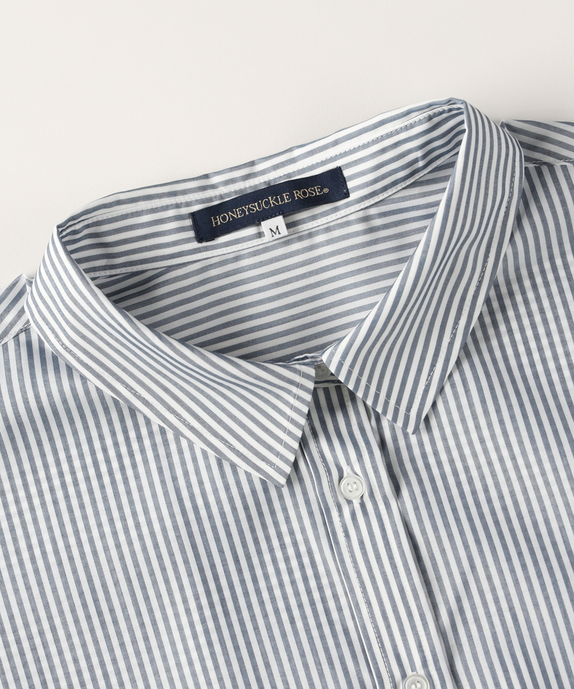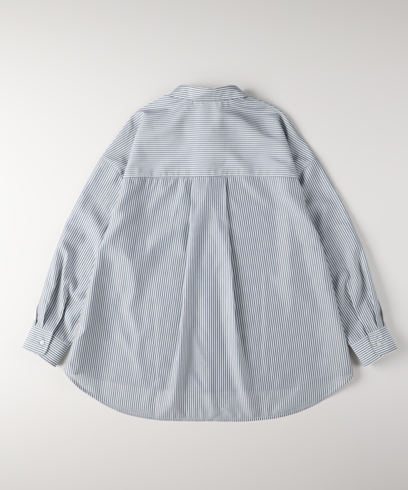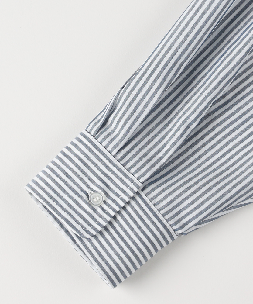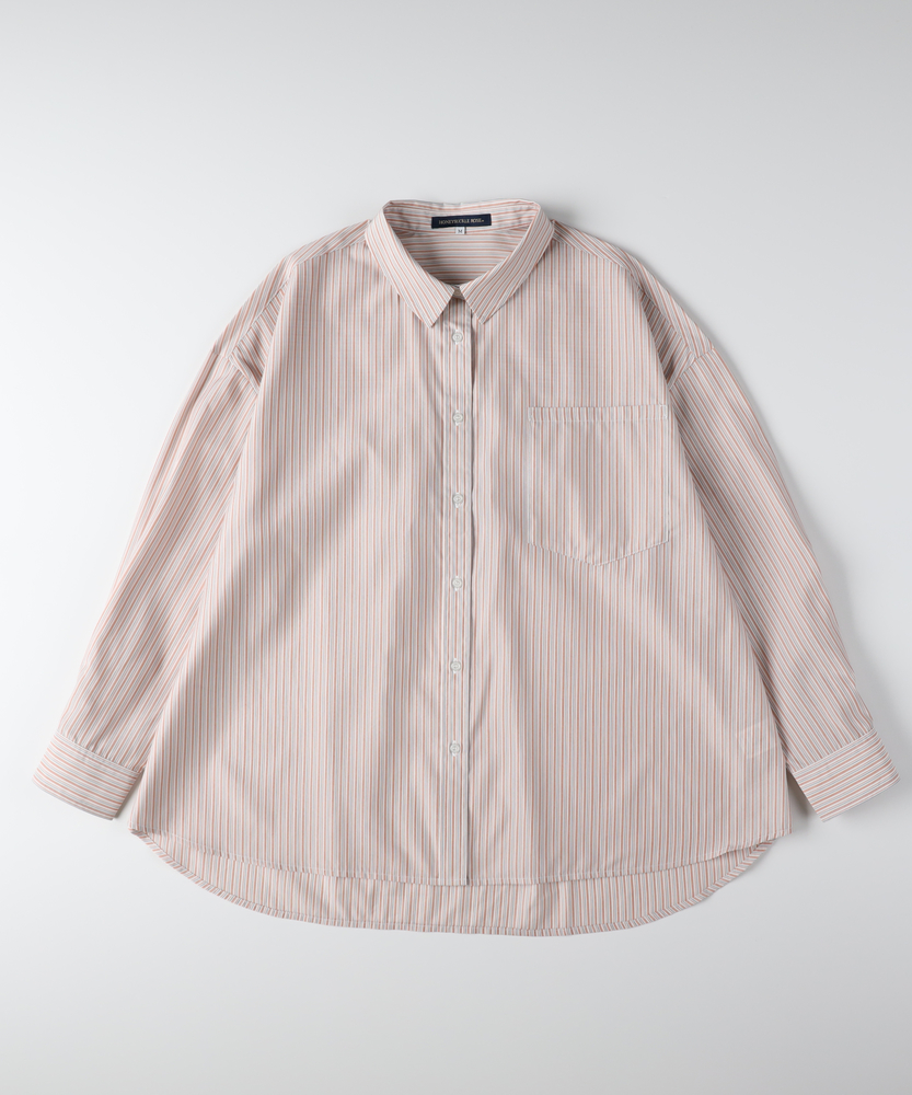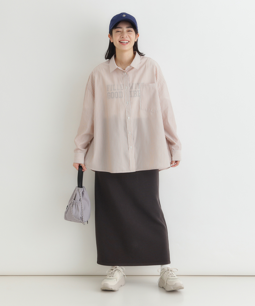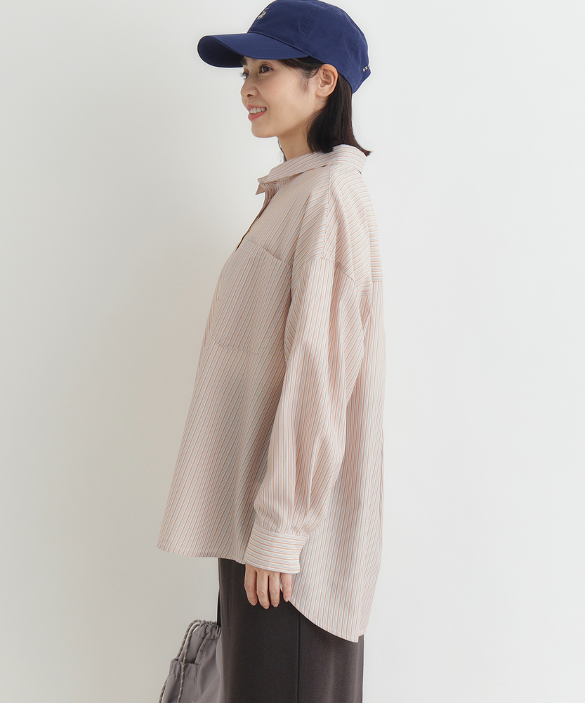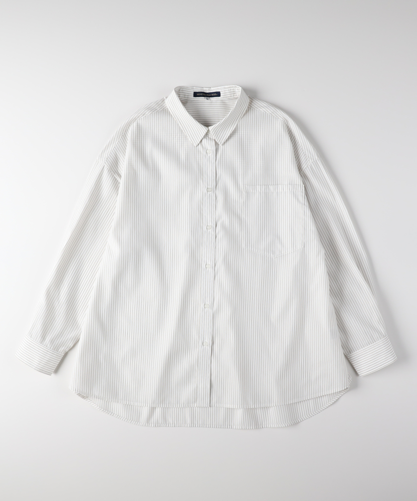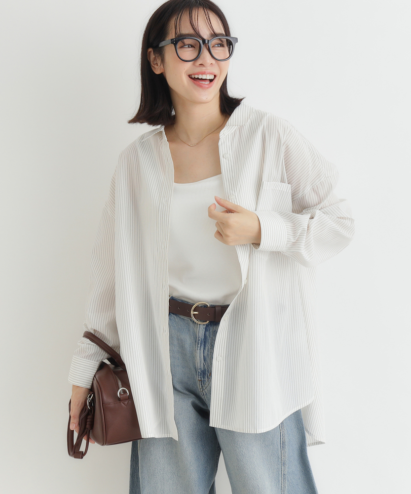羽織るだけで決まる、大人の抜け感。「楽してキレイ」が叶う一枚。縦ラインですっきり魅せる、旬のシルエット。■Point・トレンドの「ビッグシルエット」身体のラインを拾わない。ゆったりとした着心地。大人のリラックス感を演出。・すっきり見え「ストライプ柄」縦のラインを強調する柄。視覚効果でスタイルアップ。知的で清潔感のある印象に。・華奢見せ「ドロップショルダー」肩のラインを落とした設計。丸みのある女性らしいフォルム。肩周りの窮屈感も解消。・着回し自在「ラウンドヘム」前後差のある裾デザイン。腰回りを自然にカバー。インでもアウトでも様になる。・後ろ姿も完璧「バックタック」背中に施されたタック仕様。立体的なシルエットを作る。動きやすさと洒落感を両立。・季節を問わない「万能アイテム」一枚着としても羽織りとしても。ロングシーズン活躍する一着。日々のコーデの強い味方に。【デザイン】ゆとりを持たせたオーバーサイズな作りが、今どきの抜け感を演出するシャツです。肩を落としたドロップショルダーと、背中に施したタックが立体的で女性らしいフォルムを作り出します。前後差のあるラウンドヘムは、気になる腰回りを自然にカバーしつつ、ボトムスとのバランスを取りやすく設計されています。シンプルながらも計算されたディティールが光る一枚です。【素材】清潔感があり、さらりとした肌触りのシャツ生地を使用しています。程よいハリ感がありながらも身体に馴染みやすく、快適な着心地を実現しました。カジュアル過ぎず上品な風合いで、オンオフ問わずに幅広いシーンで活躍します。ロングシーズン着回せるのも嬉しいポイントです。【スタイリング】ボタンを少し開けて抜き襟気味に着ると、こなれた大人の雰囲気に仕上がります。細身のパンツと合わせてメリハリをつけたり、ワイドパンツでリラックススタイルを楽しんだりと着回し力抜群です。肌寒い時期にはニットやスウェットのインナーとして、暖かい時期にはTシャツの上の羽織りとして、一年を通してコーディネートの主役になります。