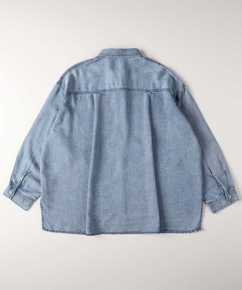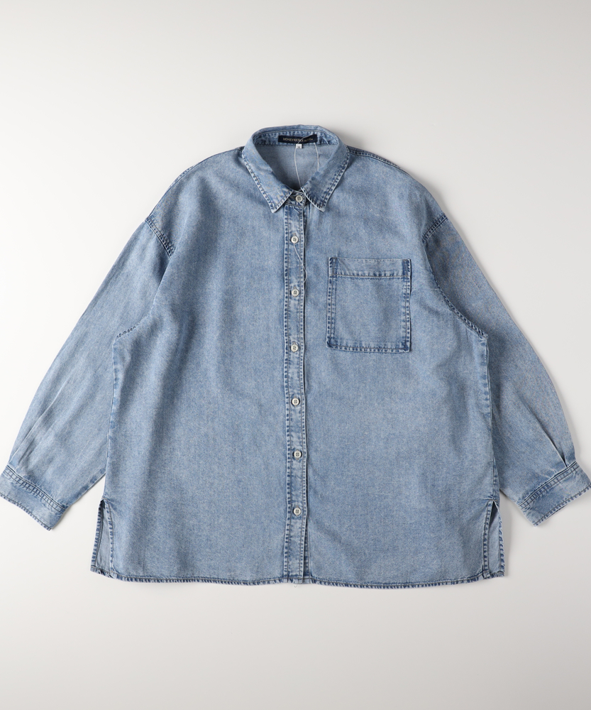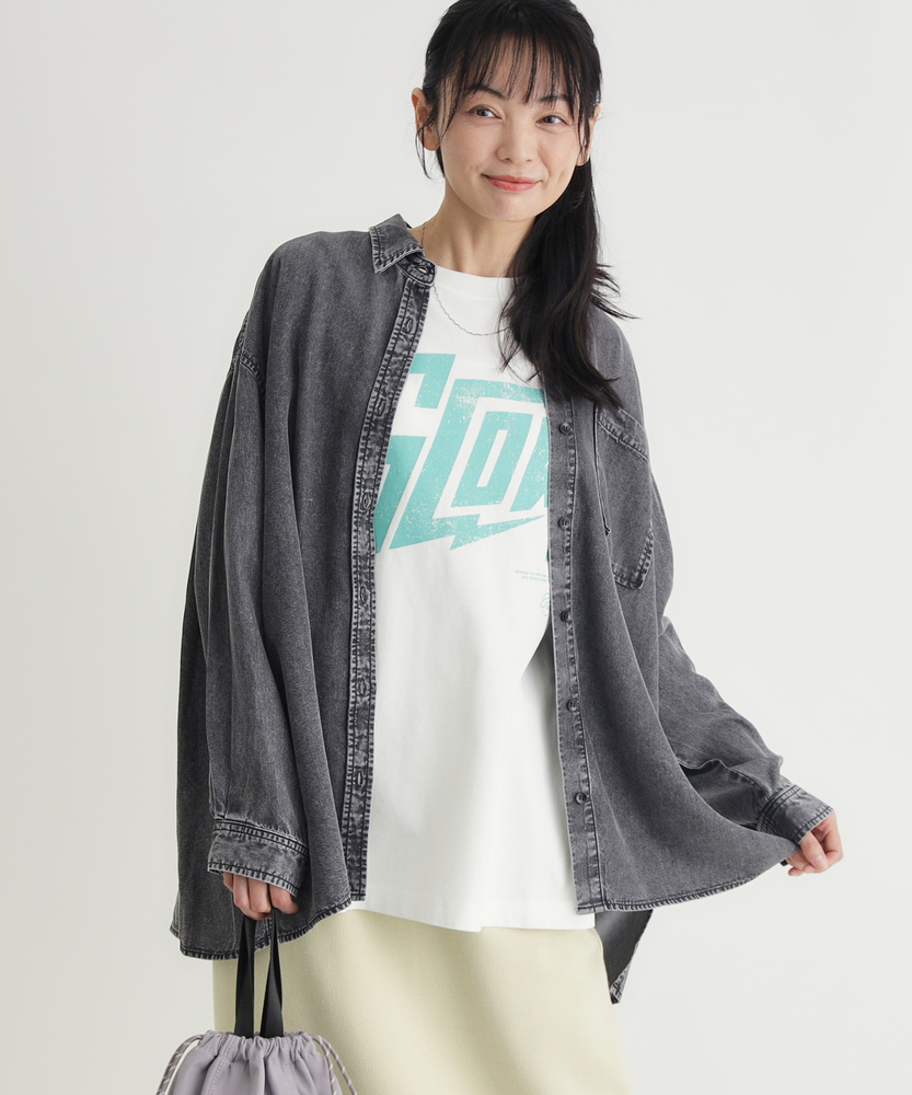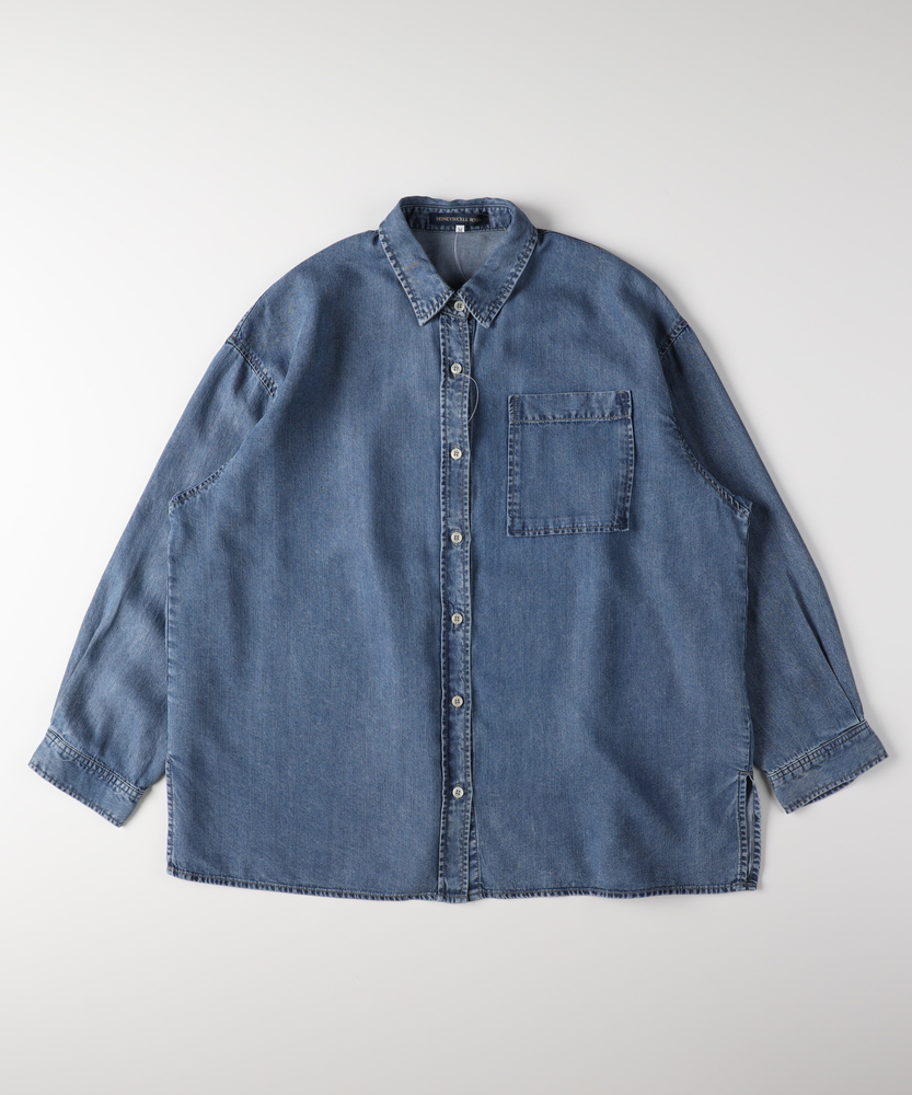 さっと羽織って、即サマになる。大人のための「ゆとり」シャツ。愛着が湧く、デニムの表情。ラフに着崩すのが今の気分。体型カバーも、おしゃれも。毎日頼れるワードローブの主役。■Point・「華奢見え」叶えるビッグシルエット身体が泳ぐようなゆったりとしたサイズ感。ドロップショルダーが肩の力を抜いた印象に。気になる二の腕や背中のラインを自然にカバー。・季節を繋ぐ「羽織り」としてTシャツやタンクトップの上にさっと羽織れる。季節の変わり目の体温調節にも最適。一枚あるだけでコーデの幅がグッと広がります。・ヒップまで隠れる「安心の丈感」腰回りをすっぽりと覆う長めの着丈。細身のパンツと合わせても後ろ姿が気にならない。体型を気にせず、リラックスして過ごせます。・顔周りをすっきり見せる「襟元」ベーシックなレギュラーカラーが知的な印象。ボタンを少し開けて、デコルテを見せれば抜け感も。顔周りをシャープに引き締めてくれます。・着回し力抜群の「スタンダード」トレンドに左右されないベーシックなデザイン。メインのトップスとしても、インナーとしても。腰巻きや肩掛けのアクセント使いにも便利です。【仕様】メンズライクなオーバーサイズを、女性が可愛く着られるバランスに落とし込んだデニムシャツです。肩の落ちたドロップショルダーと広めの身幅が、リラックス感のあるシルエットを構築。左胸の大きめなパッチポケットがワークテイストなアクセントを加えつつ、シンプルながらも存在感のある一枚に仕上がっています。【素材】程よい厚みのデニム生地を使用しており、しっかりとした質感がありながらも、着込むほどに身体に馴染んでいく柔らかさが魅力です。季節を問わず着用できる素材感で、春や秋はライトアウターとして、冬はニットやスウェットのインナーとして、オールシーズン活躍します。【スタイリング】ボタンを開けてロゴTシャツの上に羽織り、キャップを合わせれば王道のアメカジスタイルに。袖をラフに捲り上げて手首を見せると、女性らしい華奢さが際立ちます。あえてフェミニンなロングスカートやワンピースと合わせて、カジュアルダウンさせるミックスコーデもおすすめです。