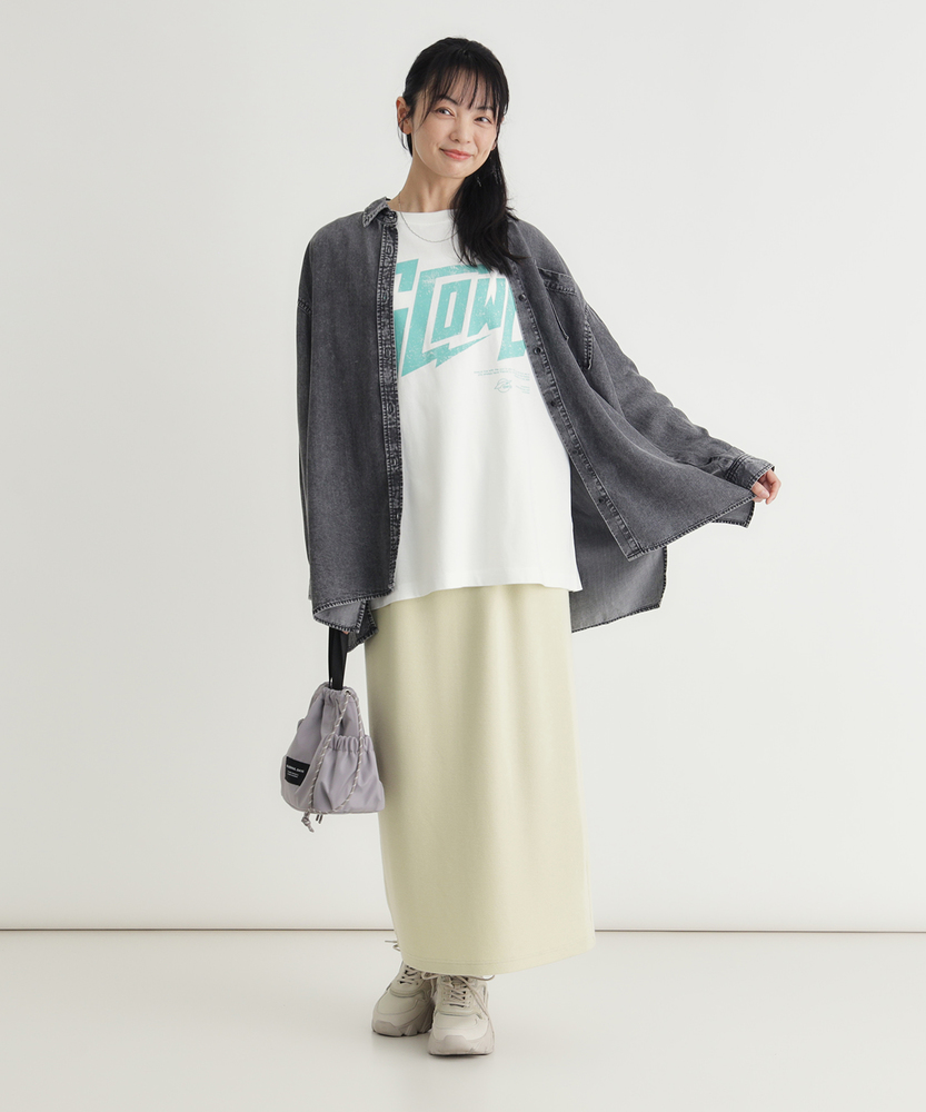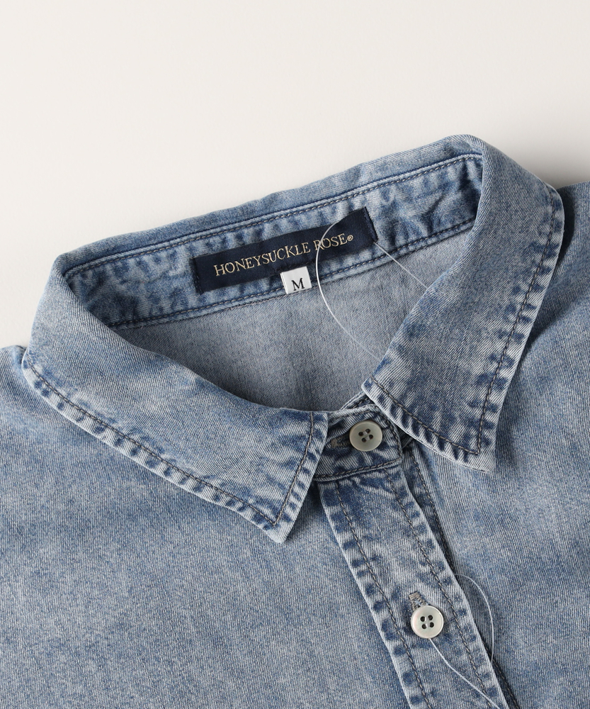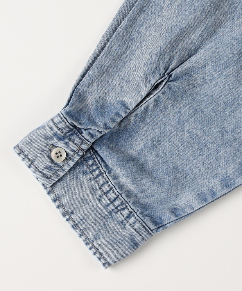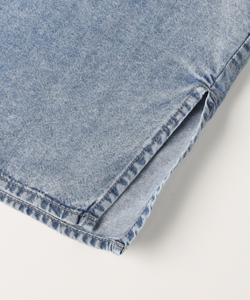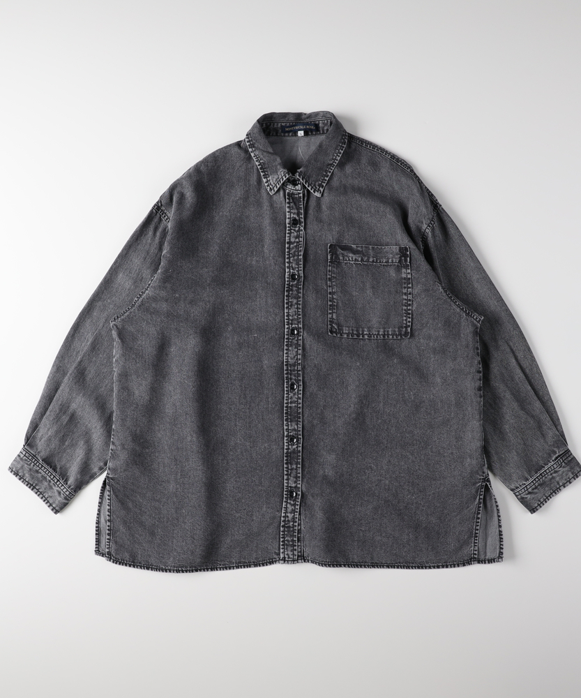 さっと羽織って、即サマになる。大人のための「ゆとり」シャツ。愛着が湧く、デニムの表情。ラフに着崩すのが今の気分。体型カバーも、おしゃれも。毎日頼れるワードローブの主役。■Point・「華奢見え」叶えるビッグシルエット身体が泳ぐようなゆったりとしたサイズ感。ドロップショルダーが肩の力を抜いた印象に。気になる二の腕や背中のラインを自然にカバー。・季節を繋ぐ「羽織り」としてTシャツやタンクトップの上にさっと羽織れる。季節の変わり目の体温調節にも最適。一枚あるだけでコーデの幅がグッと広がります。・ヒップまで隠れる「安心の丈感」腰回りをすっぽりと覆う長めの着丈。細身のパンツと合わせても後ろ姿が気にならない。体型を気にせず、リラックスして過ごせます。・顔周りをすっきり見せる「襟元」ベーシックなレギュラーカラーが知的な印象。ボタンを少し開けて、デコルテを見せれば抜け感も。顔周りをシャープに引き締めてくれます。・着回し力抜群の「スタンダード」トレンドに左右されないベーシックなデザイン。メインのトップスとしても、インナーとしても。腰巻きや肩掛けのアクセント使いにも便利です。【仕様】メンズライクなオーバーサイズを、女性が可愛く着られるバランスに落とし込んだデニムシャツです。肩の落ちたドロップショルダーと広めの身幅が、リラックス感のあるシルエットを構築。左胸の大きめなパッチポケットがワークテイストなアクセントを加えつつ、シンプルながらも存在感のある一枚に仕上がっています。【素材】程よい厚みのデニム生地を使用しており、しっかりとした質感がありながらも、着込むほどに身体に馴染んでいく柔らかさが魅力です。季節を問わず着用できる素材感で、春や秋はライトアウターとして、冬はニットやスウェットのインナーとして、オールシーズン活躍します。【スタイリング】ボタンを開けてロゴTシャツの上に羽織り、キャップを合わせれば王道のアメカジスタイルに。袖をラフに捲り上げて手首を見せると、女性らしい華奢さが際立ちます。あえてフェミニンなロングスカートやワンピースと合わせて、カジュアルダウンさせるミックスコーデもおすすめです。