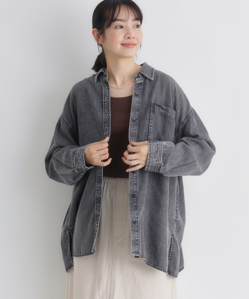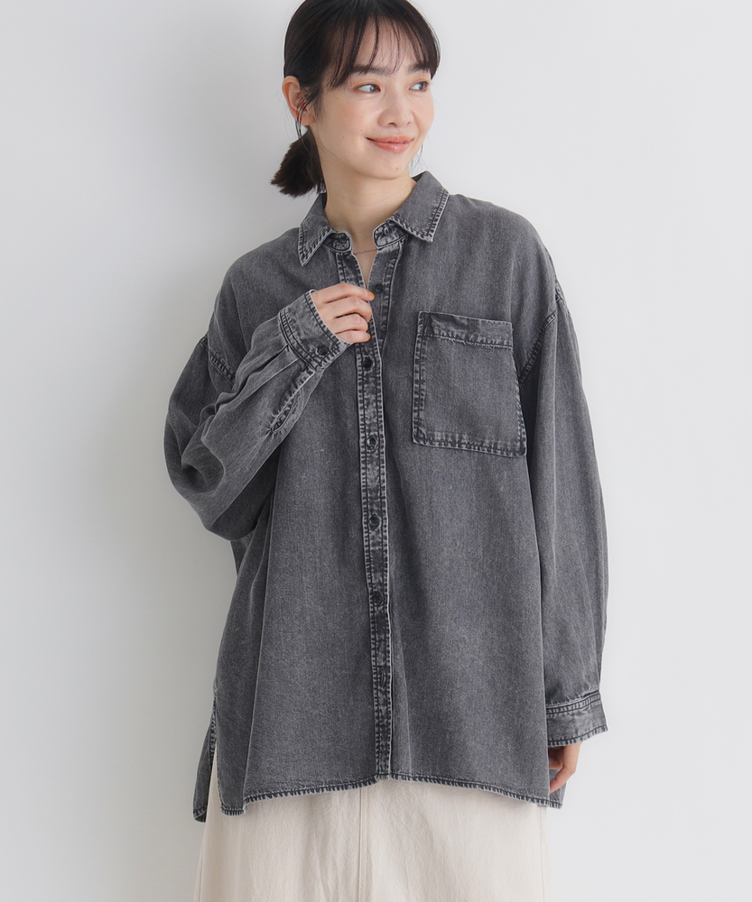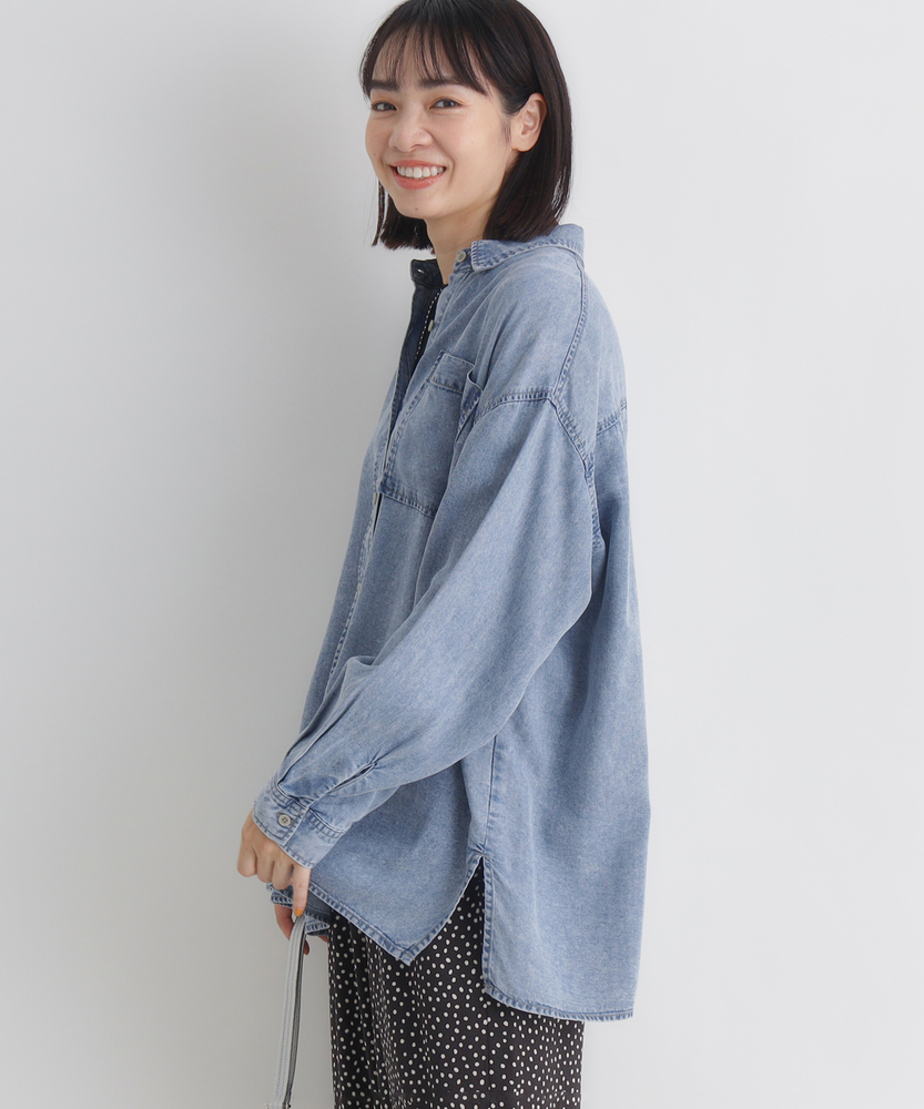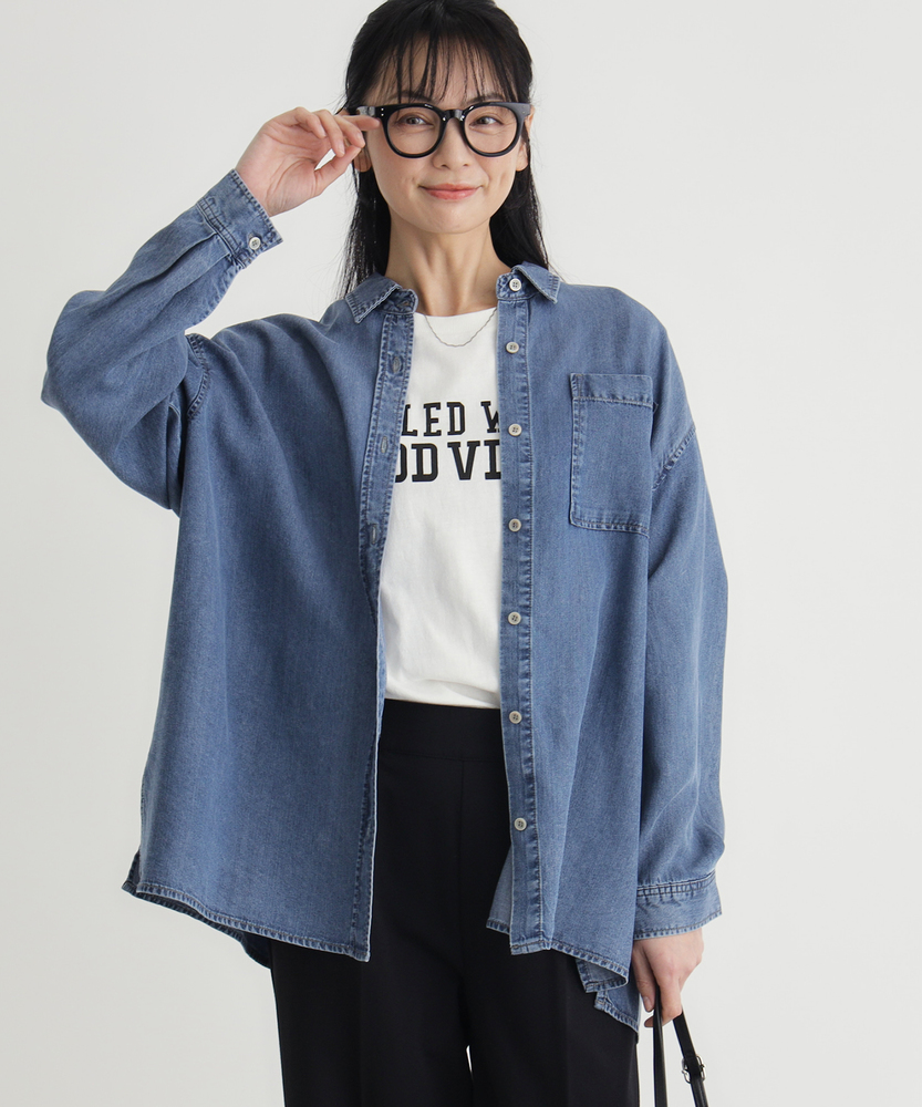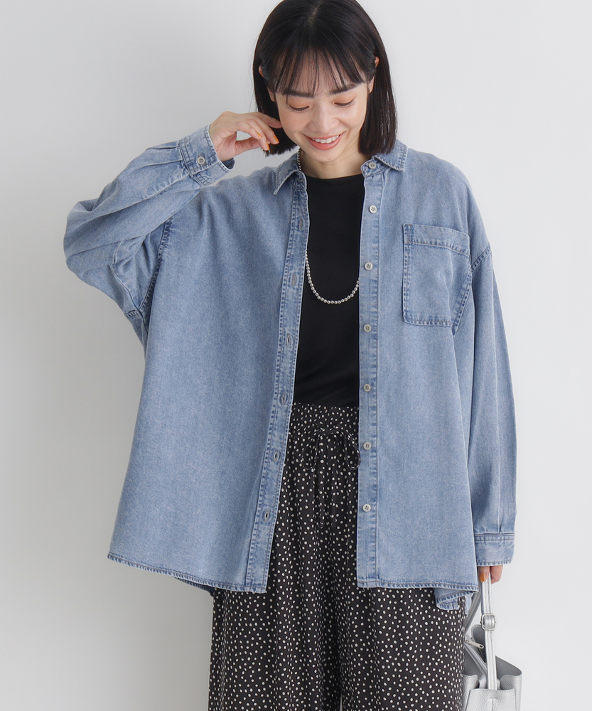 さっと羽織って、即サマになる。大人のための「ゆとり」シャツ。愛着が湧く、デニムの表情。ラフに着崩すのが今の気分。体型カバーも、おしゃれも。毎日頼れるワードローブの主役。■Point・「華奢見え」叶えるビッグシルエット身体が泳ぐようなゆったりとしたサイズ感。ドロップショルダーが肩の力を抜いた印象に。気になる二の腕や背中のラインを自然にカバー。・季節を繋ぐ「羽織り」としてTシャツやタンクトップの上にさっと羽織れる。季節の変わり目の体温調節にも最適。一枚あるだけでコーデの幅がグッと広がります。・ヒップまで隠れる「安心の丈感」腰回りをすっぽりと覆う長めの着丈。細身のパンツと合わせても後ろ姿が気にならない。体型を気にせず、リラックスして過ごせます。・顔周りをすっきり見せる「襟元」ベーシックなレギュラーカラーが知的な印象。ボタンを少し開けて、デコルテを見せれば抜け感も。顔周りをシャープに引き締めてくれます。・着回し力抜群の「スタンダード」トレンドに左右されないベーシックなデザイン。メインのトップスとしても、インナーとしても。腰巻きや肩掛けのアクセント使いにも便利です。【仕様】メンズライクなオーバーサイズを、女性が可愛く着られるバランスに落とし込んだデニムシャツです。肩の落ちたドロップショルダーと広めの身幅が、リラックス感のあるシルエットを構築。左胸の大きめなパッチポケットがワークテイストなアクセントを加えつつ、シンプルながらも存在感のある一枚に仕上がっています。【素材】程よい厚みのデニム生地を使用しており、しっかりとした質感がありながらも、着込むほどに身体に馴染んでいく柔らかさが魅力です。季節を問わず着用できる素材感で、春や秋はライトアウターとして、冬はニットやスウェットのインナーとして、オールシーズン活躍します。【スタイリング】ボタンを開けてロゴTシャツの上に羽織り、キャップを合わせれば王道のアメカジスタイルに。袖をラフに捲り上げて手首を見せると、女性らしい華奢さが際立ちます。あえてフェミニンなロングスカートやワンピースと合わせて、カジュアルダウンさせるミックスコーデもおすすめです。