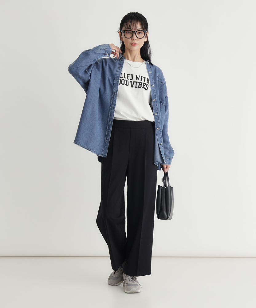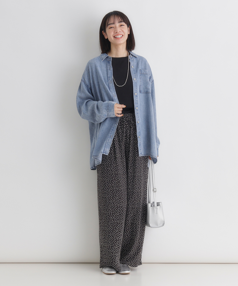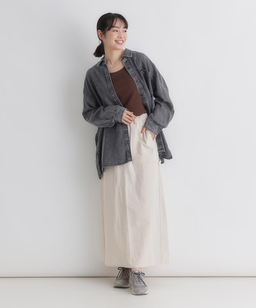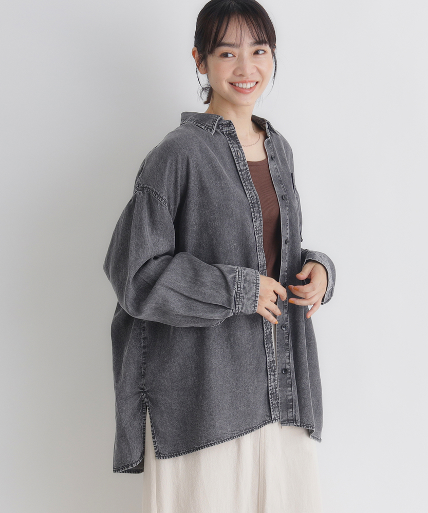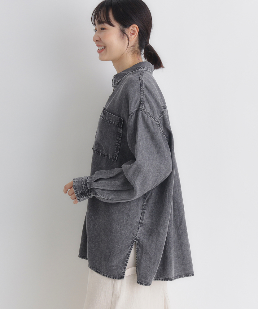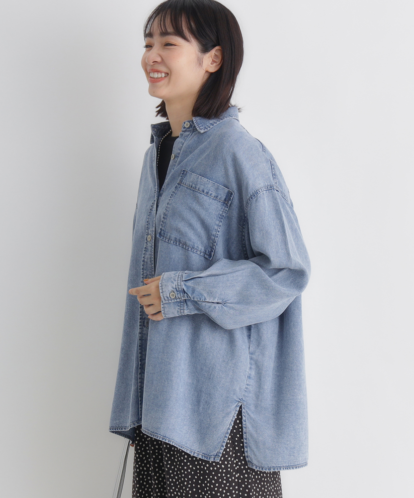さっと羽織って、即サマになる。大人のための「ゆとり」シャツ。愛着が湧く、デニムの表情。ラフに着崩すのが今の気分。体型カバーも、おしゃれも。毎日頼れるワードローブの主役。■Point・「華奢見え」叶えるビッグシルエット身体が泳ぐようなゆったりとしたサイズ感。ドロップショルダーが肩の力を抜いた印象に。気になる二の腕や背中のラインを自然にカバー。・季節を繋ぐ「羽織り」としてTシャツやタンクトップの上にさっと羽織れる。季節の変わり目の体温調節にも最適。一枚あるだけでコーデの幅がグッと広がります。・ヒップまで隠れる「安心の丈感」腰回りをすっぽりと覆う長めの着丈。細身のパンツと合わせても後ろ姿が気にならない。体型を気にせず、リラックスして過ごせます。・顔周りをすっきり見せる「襟元」ベーシックなレギュラーカラーが知的な印象。ボタンを少し開けて、デコルテを見せれば抜け感も。顔周りをシャープに引き締めてくれます。・着回し力抜群の「スタンダード」トレンドに左右されないベーシックなデザイン。メインのトップスとしても、インナーとしても。腰巻きや肩掛けのアクセント使いにも便利です。【仕様】メンズライクなオーバーサイズを、女性が可愛く着られるバランスに落とし込んだデニムシャツです。肩の落ちたドロップショルダーと広めの身幅が、リラックス感のあるシルエットを構築。左胸の大きめなパッチポケットがワークテイストなアクセントを加えつつ、シンプルながらも存在感のある一枚に仕上がっています。【素材】程よい厚みのデニム生地を使用しており、しっかりとした質感がありながらも、着込むほどに身体に馴染んでいく柔らかさが魅力です。季節を問わず着用できる素材感で、春や秋はライトアウターとして、冬はニットやスウェットのインナーとして、オールシーズン活躍します。【スタイリング】ボタンを開けてロゴTシャツの上に羽織り、キャップを合わせれば王道のアメカジスタイルに。袖をラフに捲り上げて手首を見せると、女性らしい華奢さが際立ちます。あえてフェミニンなロングスカートやワンピースと合わせて、カジュアルダウンさせるミックスコーデもおすすめです。