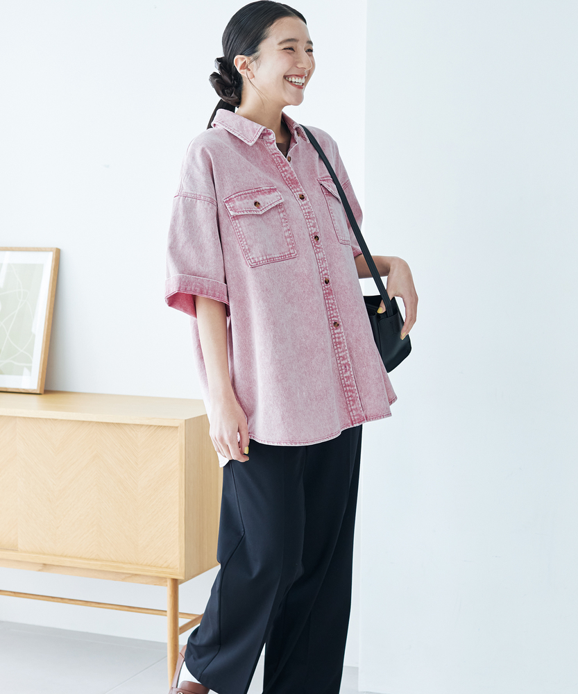 サッと羽織って、こなれ感。大人のヴィンテージライク。トレンドの「ゆるっと」シルエットで、体型カバーも。春夏コーデの主役になる、万能ワークシャツ。■Point・トレンドのワイドフィットゆとりのあるサイズ感。体のラインを拾わず、リラクシーな着心地です。・こだわりのケミカル加工硫化染めツイル生地を使用。絶妙な色落ちとアタリ感で表情豊かな仕上がりに。・アクセントのダブルポケット両胸にフラップポケットを配置。ワークテイストなデザインが着こなしのポイントに。・肌触りの良い綿100%肌馴染みの良いコットン素材。しっかりとした生地感で、デイリーユースにぴったり。・立体感を作る背面タック背中にタックを入れることでふんわりとしたシルエットに。後ろ姿も美しく見せます。・初夏の羽織りとしても一枚着としてはもちろん、前を開けてサッと羽織れば体温調節にも大活躍します。【仕様】ゆったりとしたワイドフィットが特徴の半袖ワークシャツ。肩の落ちたドロップショルダーが抜け感を演出し、気になる二の腕やボディラインを優しくカバーします。両胸に配置されたフラップ付きポケットが、カジュアルなアクセントに。裾のラウンドカットや背面のタックなど、細部までこだわった立体的なシルエットが、360度どこから見てもサマになる一枚です。【素材】肌馴染みの良い綿100%のツイル生地を使用しています。硫化染めを施した後にケミカル加工を行うことで、まるで長く愛用してきたかのような、ヴィンテージライクな色落ちとアタリ感を表現しました。しっかりとした生地感ながらも着心地が良く、デイリーに気兼ねなくお使いいただけます。【スタイリング】ボタンを閉めて一枚着としてはもちろん、Tシャツやタンクトップの上からサッと羽織るレイヤードスタイルもおすすめです。トレンドのワイドパンツや落ち感のあるスカートと合わせれば、大人のリラクシーなカジュアルコーデが完成します。淡いトーンの色合いが、春夏のスタイリングに爽やかなアクセントをプラスします。 【セットアップで着用可能なアイテムはこちら】HR26102200015 ケミカル加工コクーンパンツ/セットアップ対応