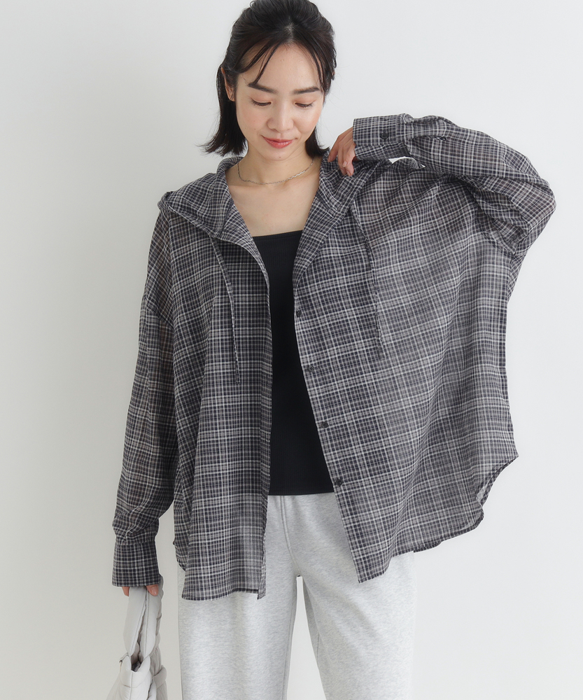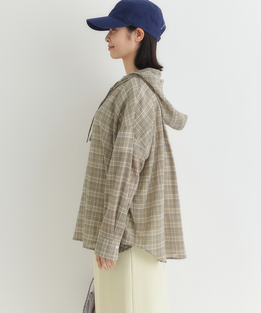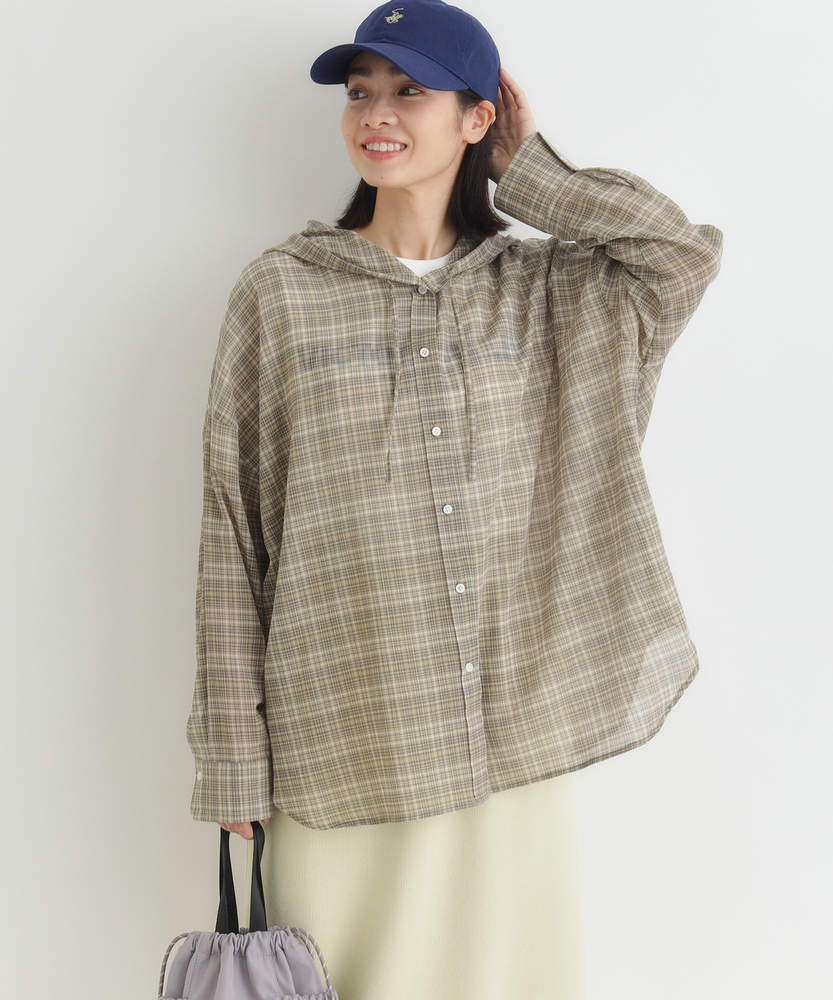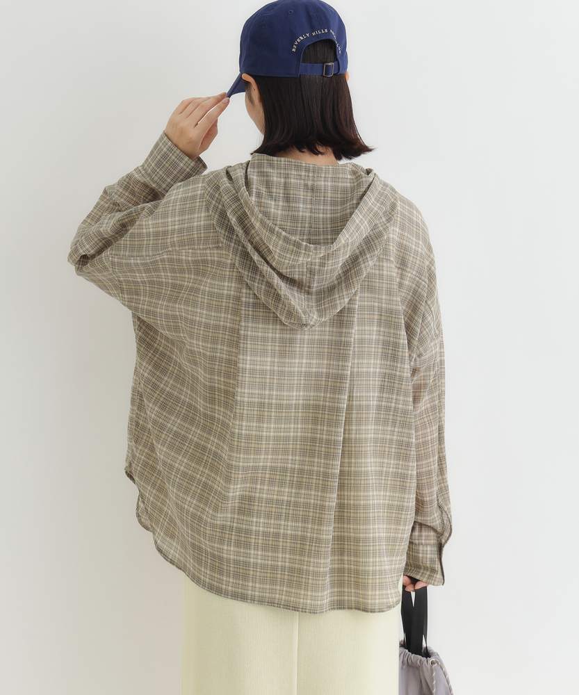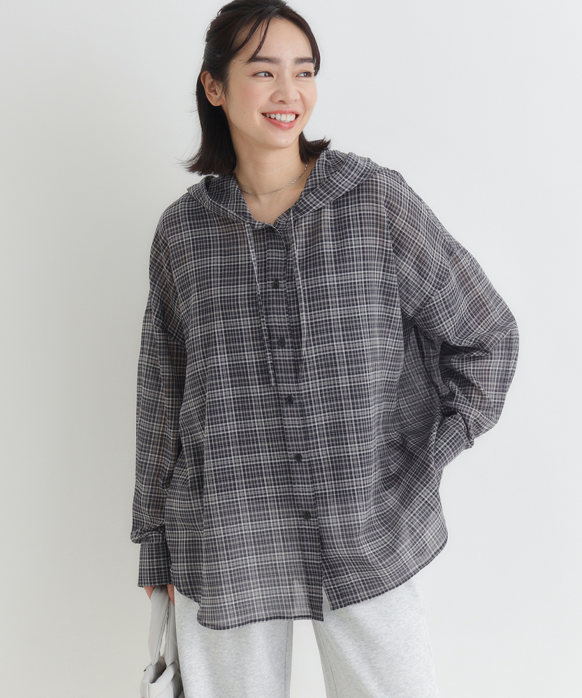 透け感で魅せる大人のカジュアルスタイル。ふんわりシルエットで優しく体型カバー。羽織るだけでこなれ感漂うフード付きシャツ。■Point・軽やかなシアー素材で女性らしく程よい透け感が魅力的な一枚。重たくならず涼しげな印象に。抜け感のある大人の着こなしへ。・ゆったりオーバーサイズ体のラインを拾わないシルエット。リラクシーな着心地を実現します。さりげなく体型カバーも叶う設計。・立体感を生む背中のタックバックスタイルも美しく演出。動くたびにふんわり広がります。後ろ姿まで抜かりないデザイン。・抜け感を作るラウンドヘム前後差のある丸みを帯びた裾。気になる腰回りを自然にカバー。アウトスタイルもすっきり決まる。・大人に似合う細かなチェック柄落ち着いたトーンの配色が魅力。カジュアルすぎず上品な雰囲気に。日常のワードローブに馴染みます。・着回し力抜群の前開き仕様ボタンを閉めてトップスとして。サッと羽織るライトアウターにも。季節の変わり目にも重宝します。【仕様】全体的にゆったりとしたリラクシーなシルエットが特徴のアイテムです。ドロップショルダーと背中に施されたタックがふんわりとした立体感を生み出し、女性らしい柔らかなフォルムを描きます。裾は丸みを帯びたラウンドカットで、抜け感をプラス。日常着として気兼ねなく取り入れやすい、程よいカジュアルさが魅力です。【素材】トレンド感のあるほのかな透け感が特徴のシアー生地を採用しています。細かいチェック柄が落ち着いた印象を与え、大人っぽい雰囲気を演出。肌離れが良く、軽やかで風をはらむような着心地は、ロングシーズンにわたって快適にお召しいただけます。見た目にも涼しげで、レイヤードスタイルを軽快に彩る素材感です。【スタイリング】インナーにキャミソールなどを合わせ、透け感を活かした着こなしがおすすめ。ボトムスには細身のパンツやストレートスカートを合わせると、バランス良くすっきりとまとまります。前を開けて軽い羽織りとして羽織れば、いつものデイリーコーデがぐっと洗練された印象に。大人のリラックススタイルに最適です。