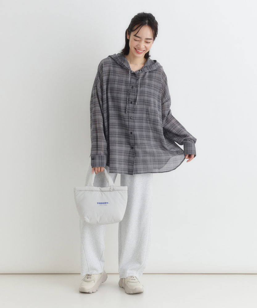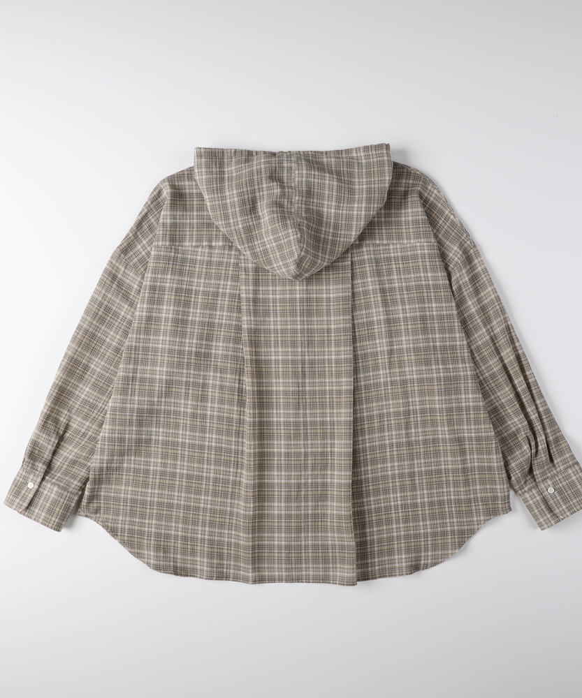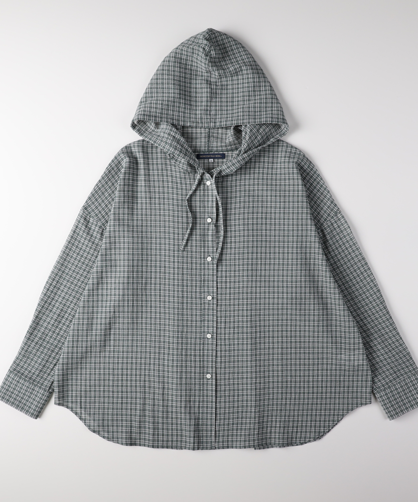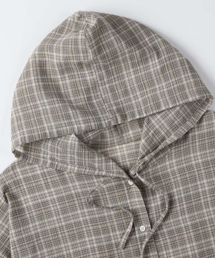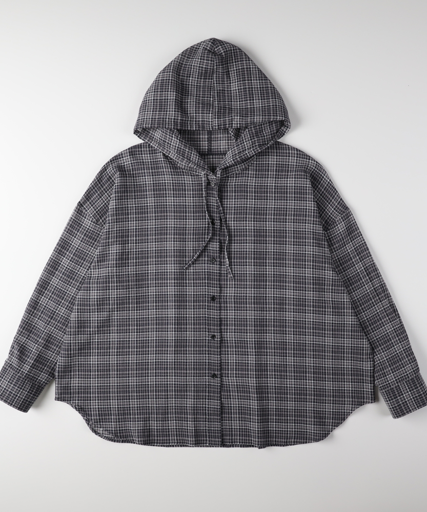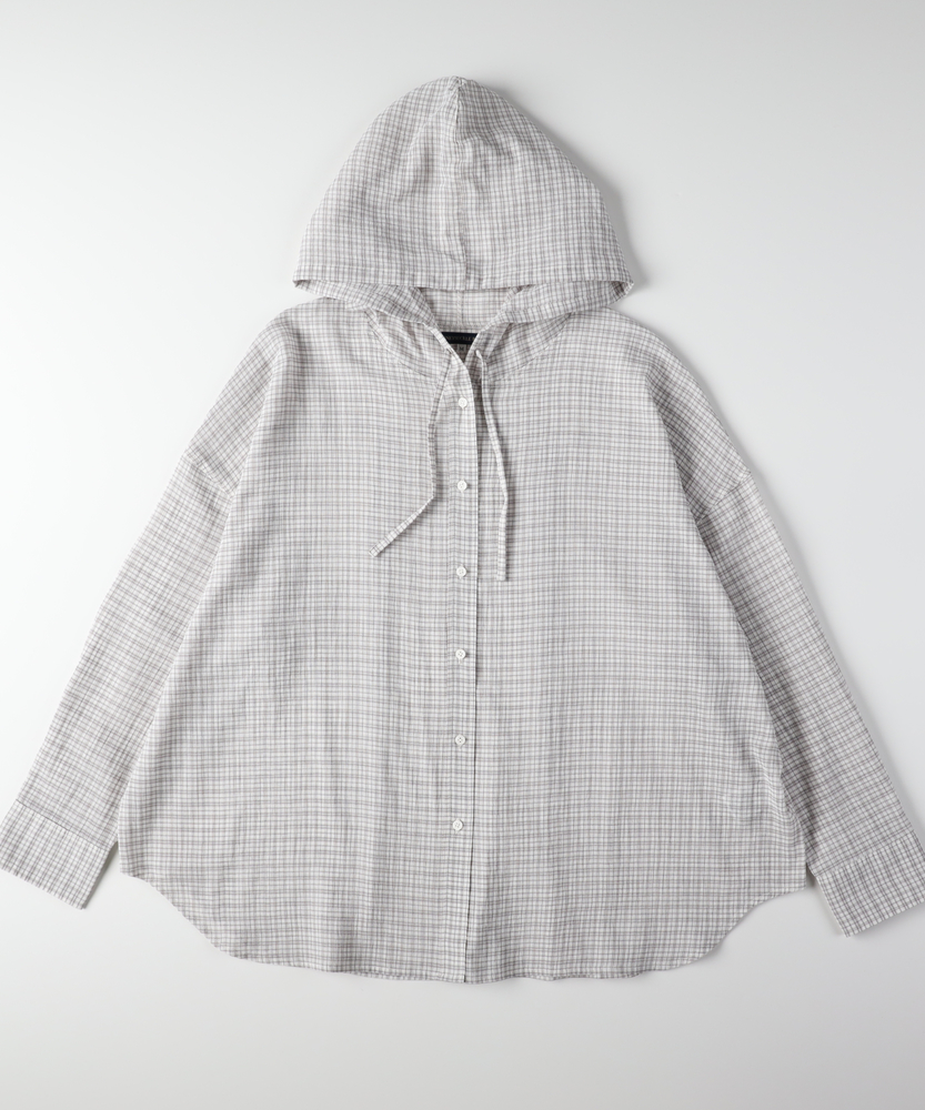 透け感で魅せる大人のカジュアルスタイル。ふんわりシルエットで優しく体型カバー。羽織るだけでこなれ感漂うフード付きシャツ。■Point・軽やかなシアー素材で女性らしく程よい透け感が魅力的な一枚。重たくならず涼しげな印象に。抜け感のある大人の着こなしへ。・ゆったりオーバーサイズ体のラインを拾わないシルエット。リラクシーな着心地を実現します。さりげなく体型カバーも叶う設計。・立体感を生む背中のタックバックスタイルも美しく演出。動くたびにふんわり広がります。後ろ姿まで抜かりないデザイン。・抜け感を作るラウンドヘム前後差のある丸みを帯びた裾。気になる腰回りを自然にカバー。アウトスタイルもすっきり決まる。・大人に似合う細かなチェック柄落ち着いたトーンの配色が魅力。カジュアルすぎず上品な雰囲気に。日常のワードローブに馴染みます。・着回し力抜群の前開き仕様ボタンを閉めてトップスとして。サッと羽織るライトアウターにも。季節の変わり目にも重宝します。【仕様】全体的にゆったりとしたリラクシーなシルエットが特徴のアイテムです。ドロップショルダーと背中に施されたタックがふんわりとした立体感を生み出し、女性らしい柔らかなフォルムを描きます。裾は丸みを帯びたラウンドカットで、抜け感をプラス。日常着として気兼ねなく取り入れやすい、程よいカジュアルさが魅力です。【素材】トレンド感のあるほのかな透け感が特徴のシアー生地を採用しています。細かいチェック柄が落ち着いた印象を与え、大人っぽい雰囲気を演出。肌離れが良く、軽やかで風をはらむような着心地は、ロングシーズンにわたって快適にお召しいただけます。見た目にも涼しげで、レイヤードスタイルを軽快に彩る素材感です。【スタイリング】インナーにキャミソールなどを合わせ、透け感を活かした着こなしがおすすめ。ボトムスには細身のパンツやストレートスカートを合わせると、バランス良くすっきりとまとまります。前を開けて軽い羽織りとして羽織れば、いつものデイリーコーデがぐっと洗練された印象に。大人のリラックススタイルに最適です。