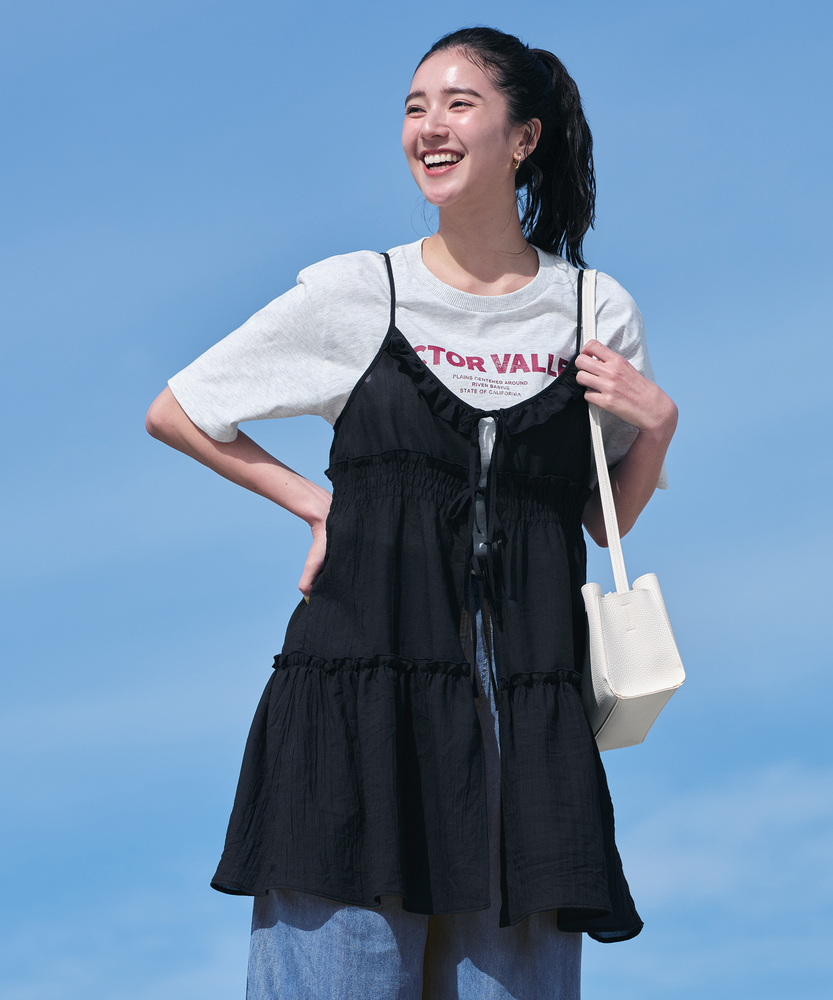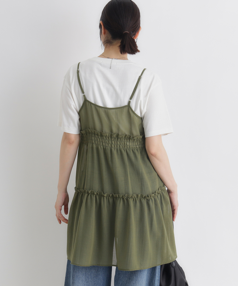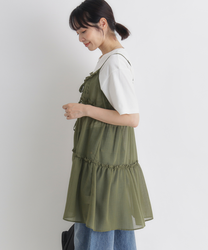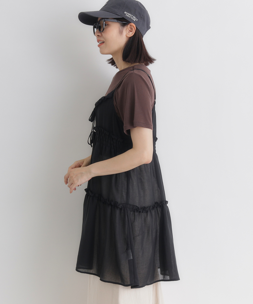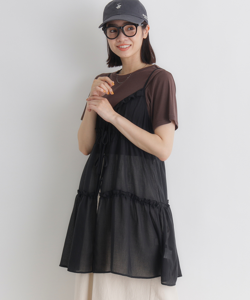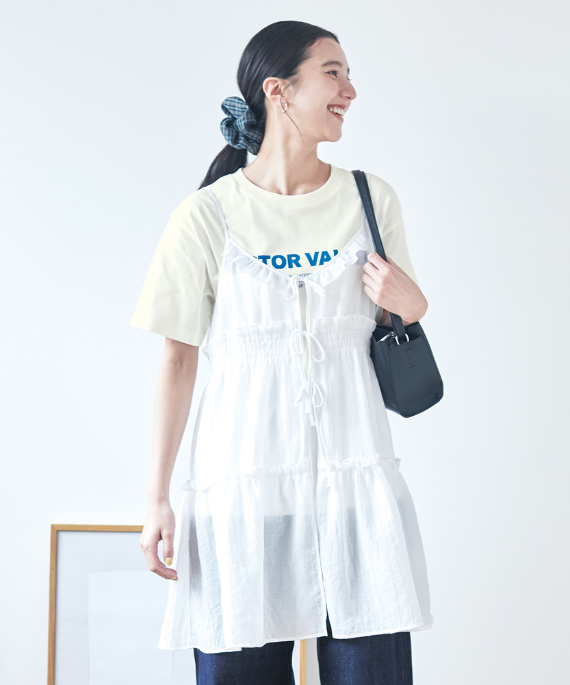 いつものコーデに重ねるだけで、旬のスタイルへ。気分に合わせて楽しめる、2WAYデザイン。大人にちょうどいい、ふんわりシアーキャミ。■Point・着回し広がる前後2WAYその日の気分に合わせて変更。リボンを前にして華やかに。後ろにしてすっきり大人っぽく。・レイヤードが楽しいシアー感軽やかで涼しげな透け感。重ね着しても重くなりません。いつものトップスが新鮮に。・体型カバーを叶えるティアード段違いに広がるギャザー使い。気になるお腹周りをふんわりカバー。動くたびに揺れる優雅なシルエット。・華奢見せする細めストラップデコルテ周りをすっきり演出。肩周りを華奢に見せてくれます。インナーとのバランスも取りやすい。・アクセントになるリボン使いフロントに並んだ細めのリボン。ほんのりとした甘さをプラス。結び方でニュアンスを変えられます。・メリハリを生む胸下切り替え高めの位置で切り替えたデザイン。自然なスタイルアップ効果に期待。脚長効果も狙える絶妙なバランス。【仕様】いつものトップスに重ねるだけで、一気にトレンド感が増すキャミソールです。フロントの華奢なリボンがほんのり甘さをプラスし、前後どちらを前にしても着られる2WAY仕様が最大の魅力。胸下からふんわりと広がるティアードデザインが、気になるウエスト周りを自然にカバーしつつ、女性らしい柔らかなシルエットを描きます。【素材】軽やかな透け感が特徴のシアー素材を使用しています。生地の表面にはさりげないニュアンスがあり、表情豊かな仕上がりに。さらりとした軽快な風合いで、シーズンレスにレイヤードスタイルを楽しめます。ふんわりと空気を含んだような質感が、コーディネート全体を重く見せず、抜け感のある印象を与えてくれます。【スタイリング】シンプルな白Tシャツやタンクトップに重ねるだけで、こなれ感のあるスタイルに。ボトムスはストレートデニムなど、カジュアルなアイテムを合わせて甘さを抑えるのが大人流です。リボン側を後ろにしてすっきり着こなせば、バックスタイルにさりげないアクセントが生まれ、洗練されたレイヤードコーデが完成します。