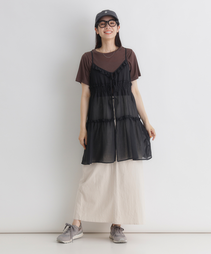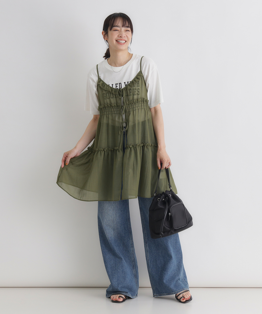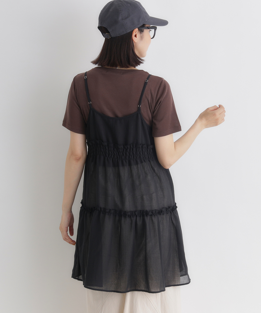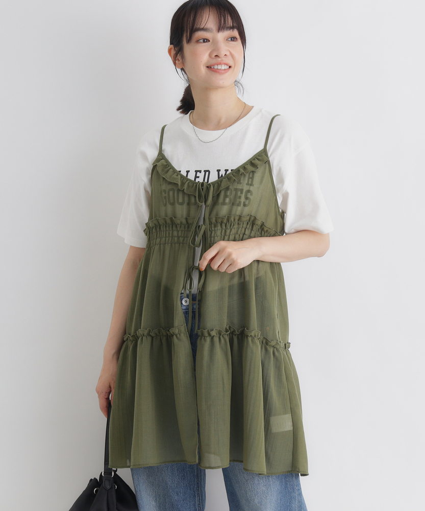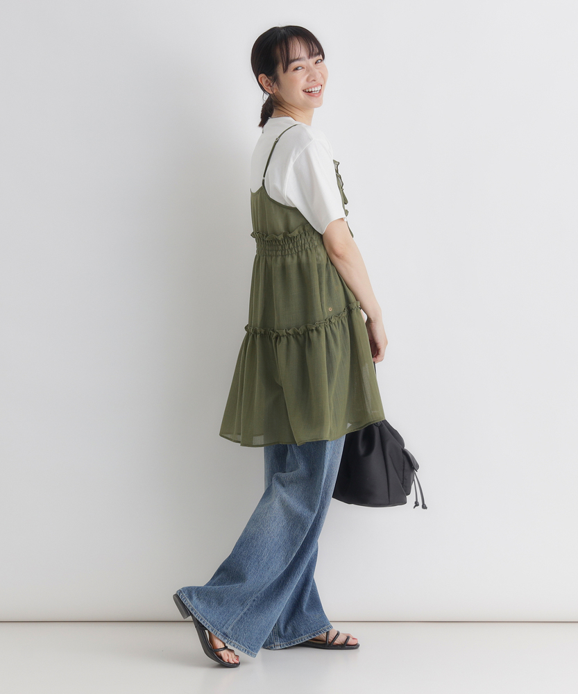 いつものコーデに重ねるだけで、旬のスタイルへ。気分に合わせて楽しめる、2WAYデザイン。大人にちょうどいい、ふんわりシアーキャミ。■Point・着回し広がる前後2WAYその日の気分に合わせて変更。リボンを前にして華やかに。後ろにしてすっきり大人っぽく。・レイヤードが楽しいシアー感軽やかで涼しげな透け感。重ね着しても重くなりません。いつものトップスが新鮮に。・体型カバーを叶えるティアード段違いに広がるギャザー使い。気になるお腹周りをふんわりカバー。動くたびに揺れる優雅なシルエット。・華奢見せする細めストラップデコルテ周りをすっきり演出。肩周りを華奢に見せてくれます。インナーとのバランスも取りやすい。・アクセントになるリボン使いフロントに並んだ細めのリボン。ほんのりとした甘さをプラス。結び方でニュアンスを変えられます。・メリハリを生む胸下切り替え高めの位置で切り替えたデザイン。自然なスタイルアップ効果に期待。脚長効果も狙える絶妙なバランス。【仕様】いつものトップスに重ねるだけで、一気にトレンド感が増すキャミソールです。フロントの華奢なリボンがほんのり甘さをプラスし、前後どちらを前にしても着られる2WAY仕様が最大の魅力。胸下からふんわりと広がるティアードデザインが、気になるウエスト周りを自然にカバーしつつ、女性らしい柔らかなシルエットを描きます。【素材】軽やかな透け感が特徴のシアー素材を使用しています。生地の表面にはさりげないニュアンスがあり、表情豊かな仕上がりに。さらりとした軽快な風合いで、シーズンレスにレイヤードスタイルを楽しめます。ふんわりと空気を含んだような質感が、コーディネート全体を重く見せず、抜け感のある印象を与えてくれます。【スタイリング】シンプルな白Tシャツやタンクトップに重ねるだけで、こなれ感のあるスタイルに。ボトムスはストレートデニムなど、カジュアルなアイテムを合わせて甘さを抑えるのが大人流です。リボン側を後ろにしてすっきり着こなせば、バックスタイルにさりげないアクセントが生まれ、洗練されたレイヤードコーデが完成します。