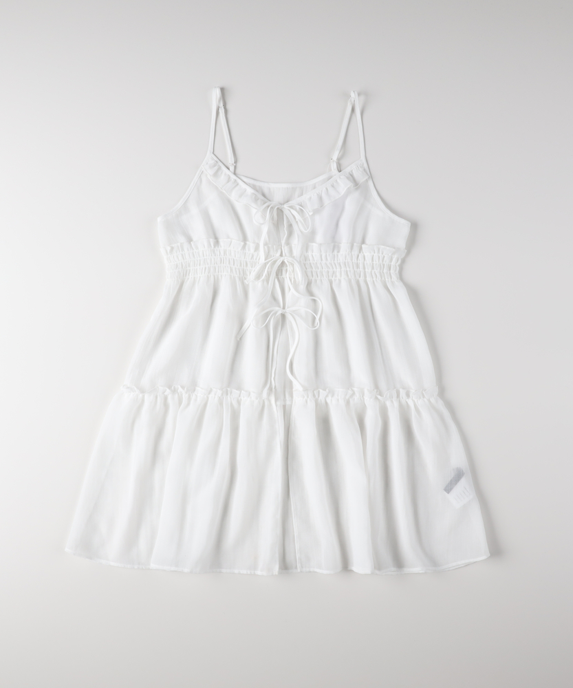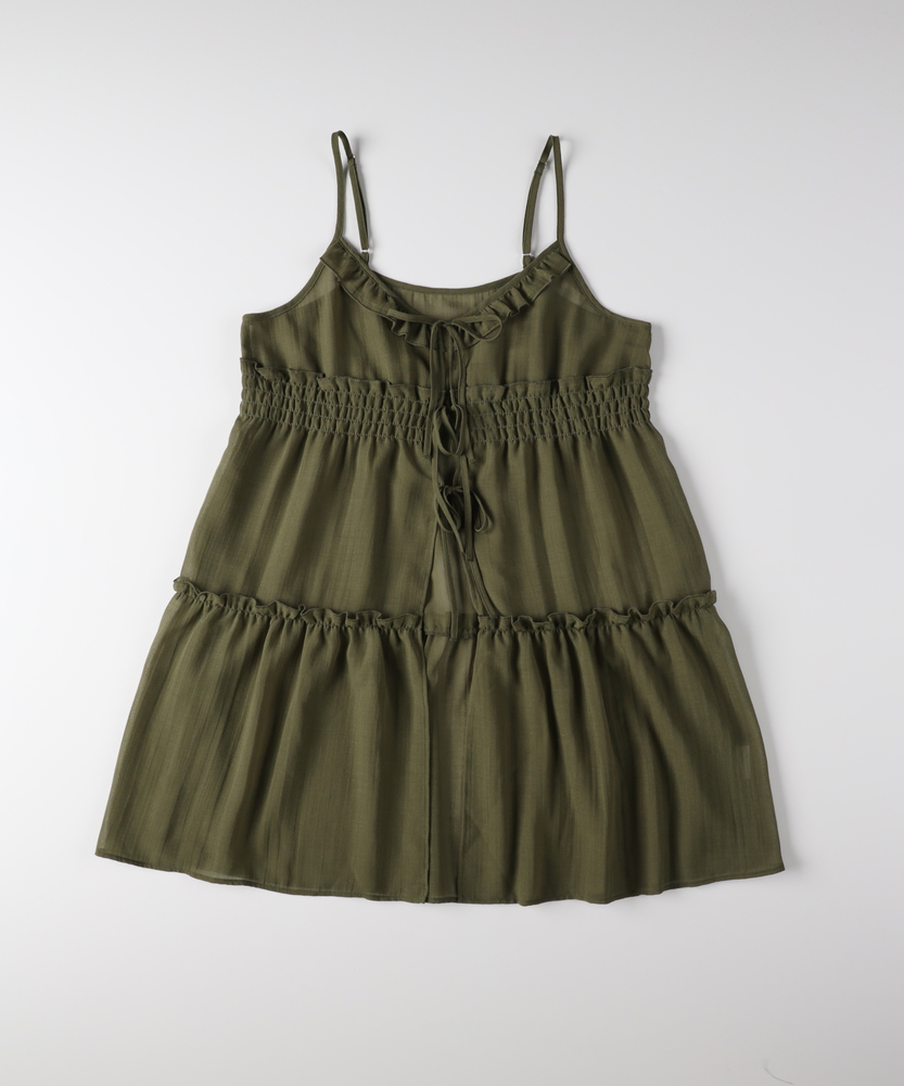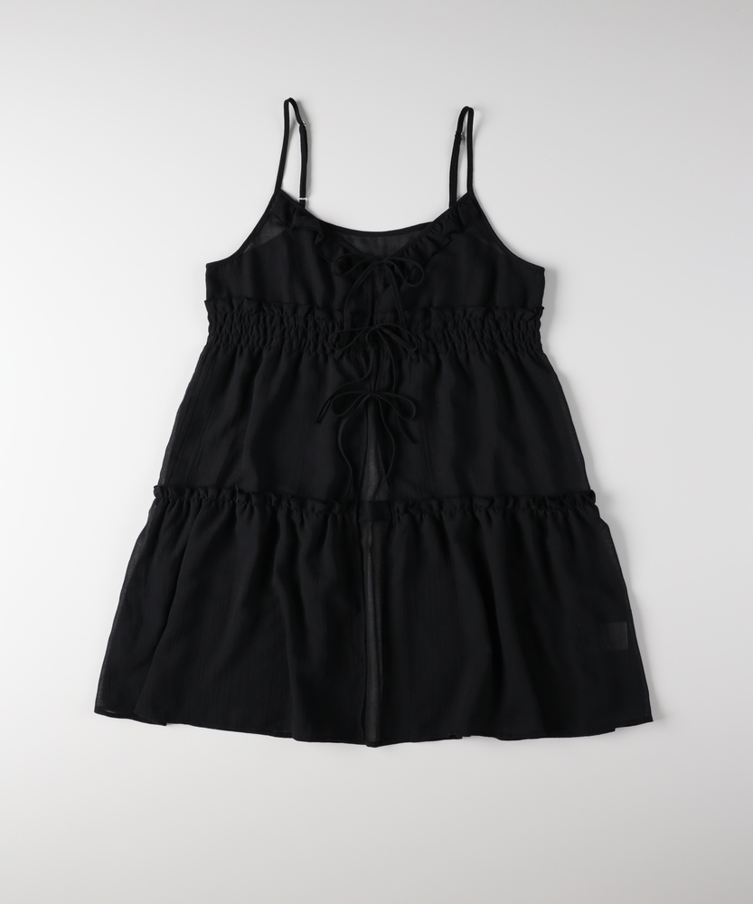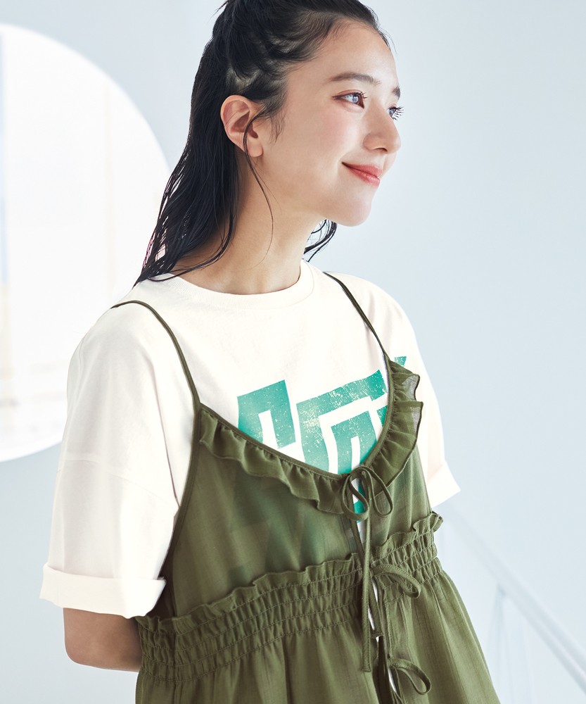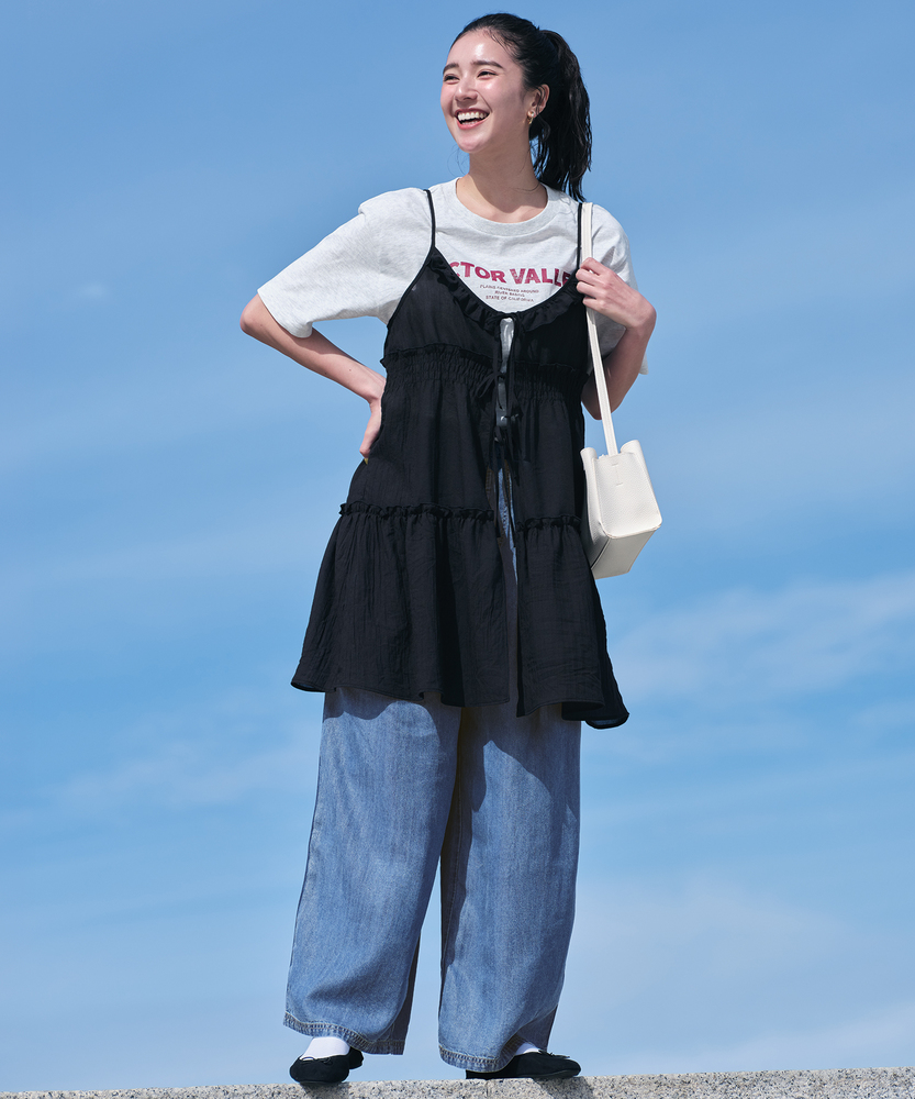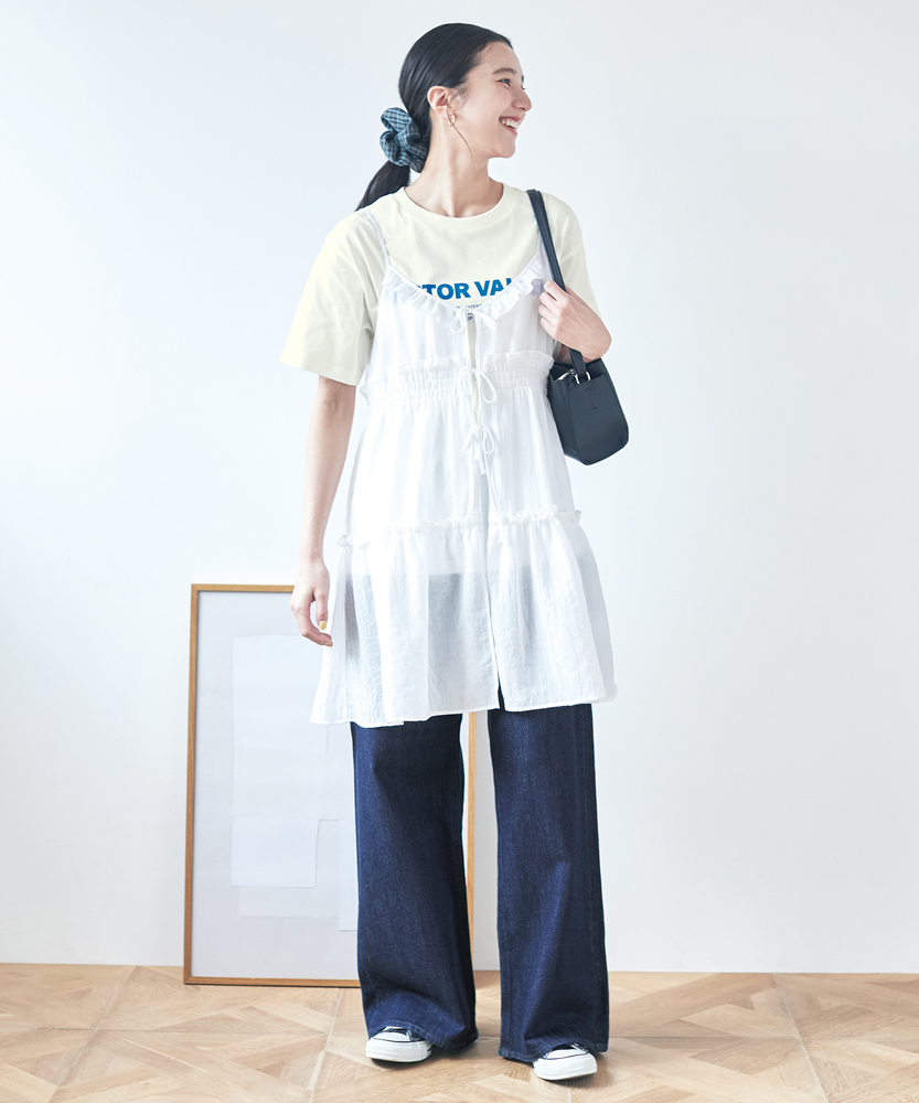 いつものコーデに重ねるだけで、旬のスタイルへ。気分に合わせて楽しめる、2WAYデザイン。大人にちょうどいい、ふんわりシアーキャミ。■Point・着回し広がる前後2WAYその日の気分に合わせて変更。リボンを前にして華やかに。後ろにしてすっきり大人っぽく。・レイヤードが楽しいシアー感軽やかで涼しげな透け感。重ね着しても重くなりません。いつものトップスが新鮮に。・体型カバーを叶えるティアード段違いに広がるギャザー使い。気になるお腹周りをふんわりカバー。動くたびに揺れる優雅なシルエット。・華奢見せする細めストラップデコルテ周りをすっきり演出。肩周りを華奢に見せてくれます。インナーとのバランスも取りやすい。・アクセントになるリボン使いフロントに並んだ細めのリボン。ほんのりとした甘さをプラス。結び方でニュアンスを変えられます。・メリハリを生む胸下切り替え高めの位置で切り替えたデザイン。自然なスタイルアップ効果に期待。脚長効果も狙える絶妙なバランス。【仕様】いつものトップスに重ねるだけで、一気にトレンド感が増すキャミソールです。フロントの華奢なリボンがほんのり甘さをプラスし、前後どちらを前にしても着られる2WAY仕様が最大の魅力。胸下からふんわりと広がるティアードデザインが、気になるウエスト周りを自然にカバーしつつ、女性らしい柔らかなシルエットを描きます。【素材】軽やかな透け感が特徴のシアー素材を使用しています。生地の表面にはさりげないニュアンスがあり、表情豊かな仕上がりに。さらりとした軽快な風合いで、シーズンレスにレイヤードスタイルを楽しめます。ふんわりと空気を含んだような質感が、コーディネート全体を重く見せず、抜け感のある印象を与えてくれます。【スタイリング】シンプルな白Tシャツやタンクトップに重ねるだけで、こなれ感のあるスタイルに。ボトムスはストレートデニムなど、カジュアルなアイテムを合わせて甘さを抑えるのが大人流です。リボン側を後ろにしてすっきり着こなせば、バックスタイルにさりげないアクセントが生まれ、洗練されたレイヤードコーデが完成します。
