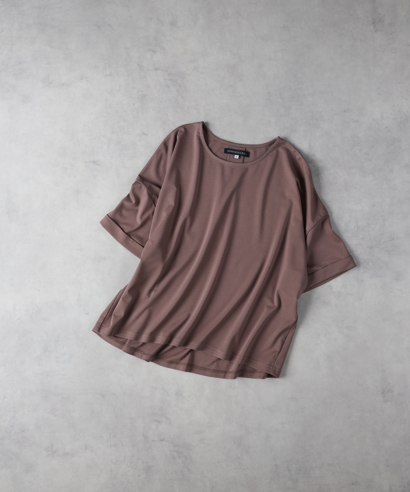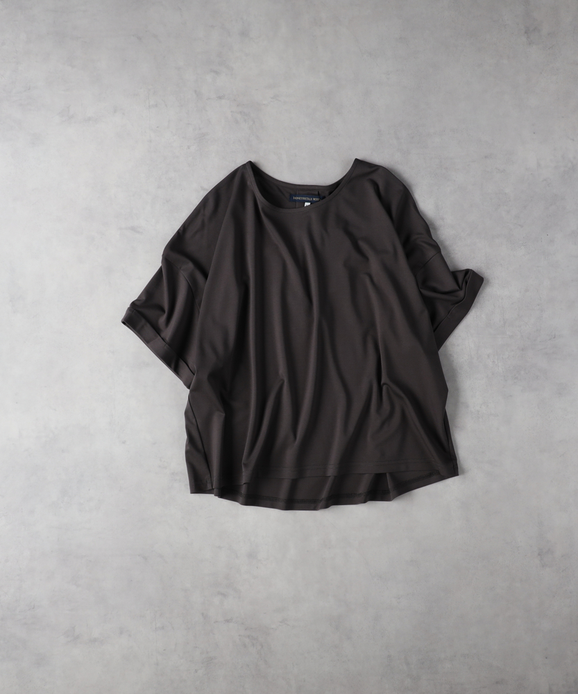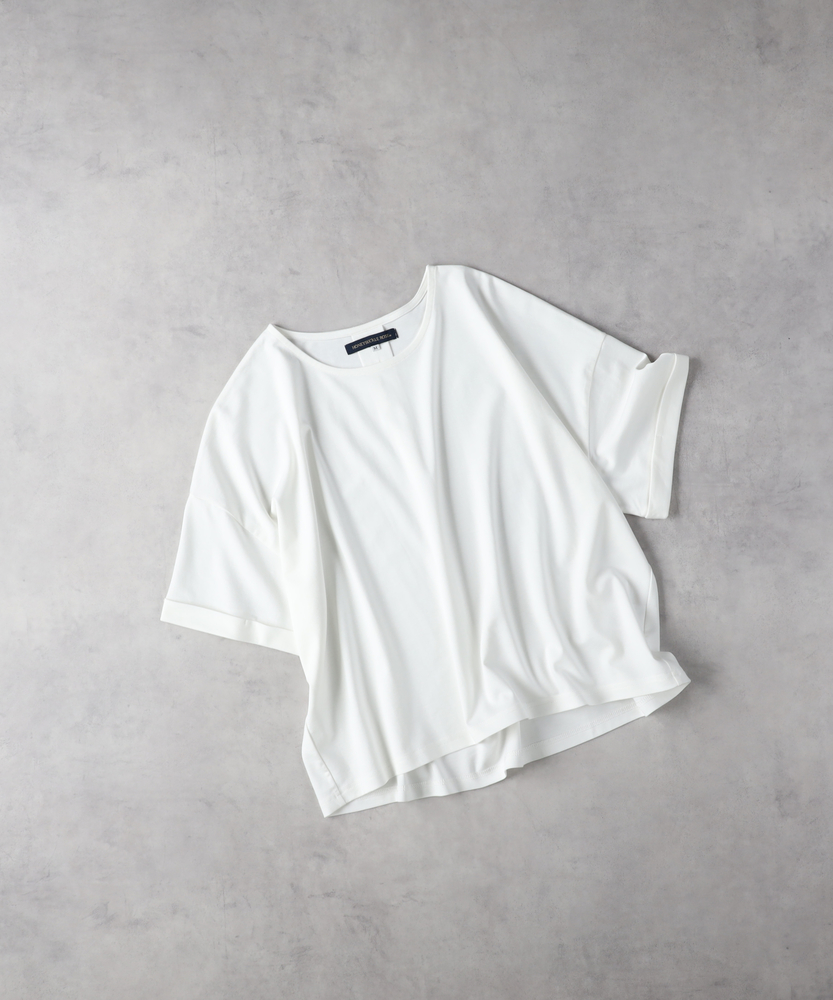 【仕様】ドルマンスリーブが特徴のこのTシャツは、リラックスしたシルエットや、ゆったりとした着心地が魅力。シンプルながらも、背中のタックデザインがさりげないアクセントを加え、女性らしい印象を与えます。【素材】接触冷感の高機能素材を使用しており、暑い季節でも快適に着用できるのが特長です。伸縮性に優れた生地は、動きやすさを提供し、日常のアクティブなシーンでも重宝します。【スタイリング】スキニーパンツやカラーボトムと合わせて、バランスの取れたスタイルを楽しめます。また、軽やかなスカートとも相性が良く、カジュアルからオフィススタイルまで幅広いシーンで活躍します。アクセサリーで個性を引き立てるのもおすすめです。