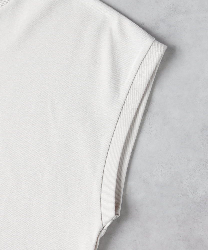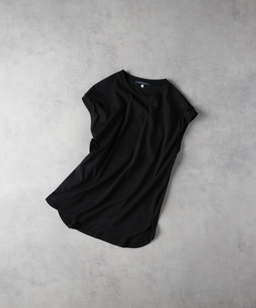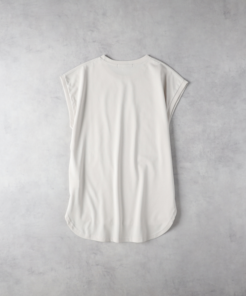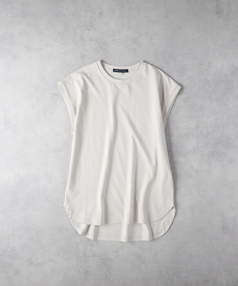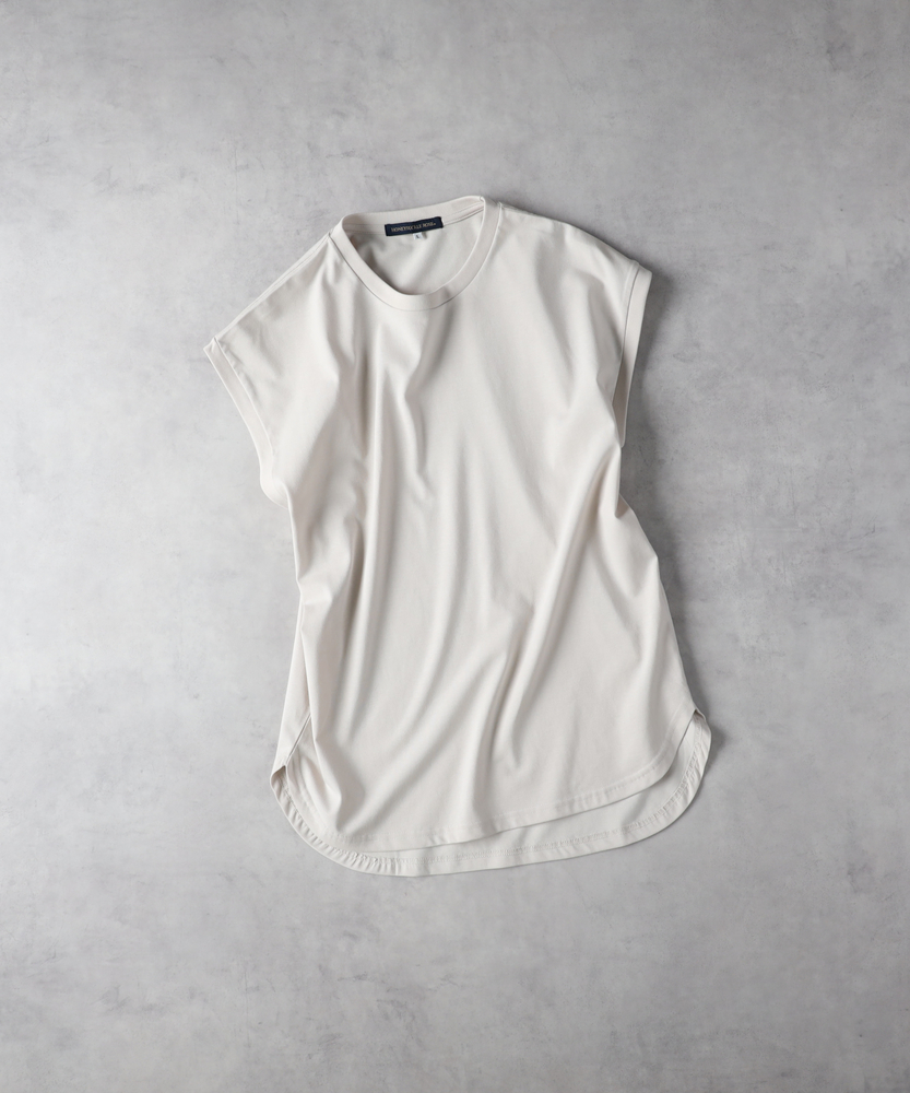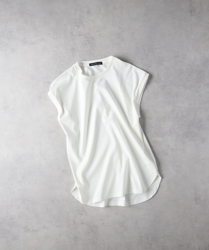 【仕様】ややゆったりとしたシルエットのノースリーブTシャツは、エフォートレスなスタイルを演出。カジュアルながらも女性らしさを引き立てるデザインで、バックの裾にかけてラウンドしたディテールが魅力です。軽やかさを求めるデイリーコーデに最適です。【素材】汗ジミ防止機能を備えたカットソー生地は、触れた瞬間に感じる接触冷感が特徴。UVカット効果も兼ね備えており、真夏の日差しから肌を守ります。なめらかな肌触りで、サラリとした着心地を提供。動いても快適さが続きます。 ※汗染み防止加工は身頃生地に施しております。※襟、袖口のリブには汗染み防止加工は施られておりません。【スタイリング】 ストレートパンツやスカートとの相性は抜群で、リラックスした雰囲気を醸し出します。軽い羽織りと合わせることで、涼しげな印象に。アクセサリーや帽子で個性を加えれば、よりスタイリッシュなコーディネートが完成します。