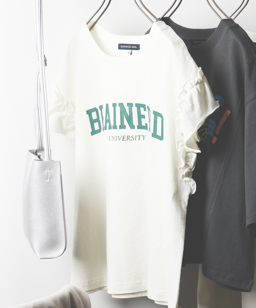 【仕様】カレッジスタイルのプリントが目を引くフリルTシャツは、可愛らしさと遊び心を両立させた一枚です。肩に施されたフリルが女性らしさを演出し、カジュアルな中にも華やかさを添えています。シンプルなカラーが、ロゴを引き立てる効果もあります。【素材】柔らかなコットン素材を使用しており、肌触りが良く快適な着心地。毎日の着用にぴったりの耐久性も備えており、洗濯後も型崩れしにくいのが特徴です。【スタイリング】デニムショーツやタイトスカートとのコーディネートがオススメ。カジュアルだけでなく、女性らしさを感じさせるスタイルが楽しめます。シンプルなボトムスとの組み合わせで、フリルやプリントを引き立てつつ、華やかな印象を演出しましょう。