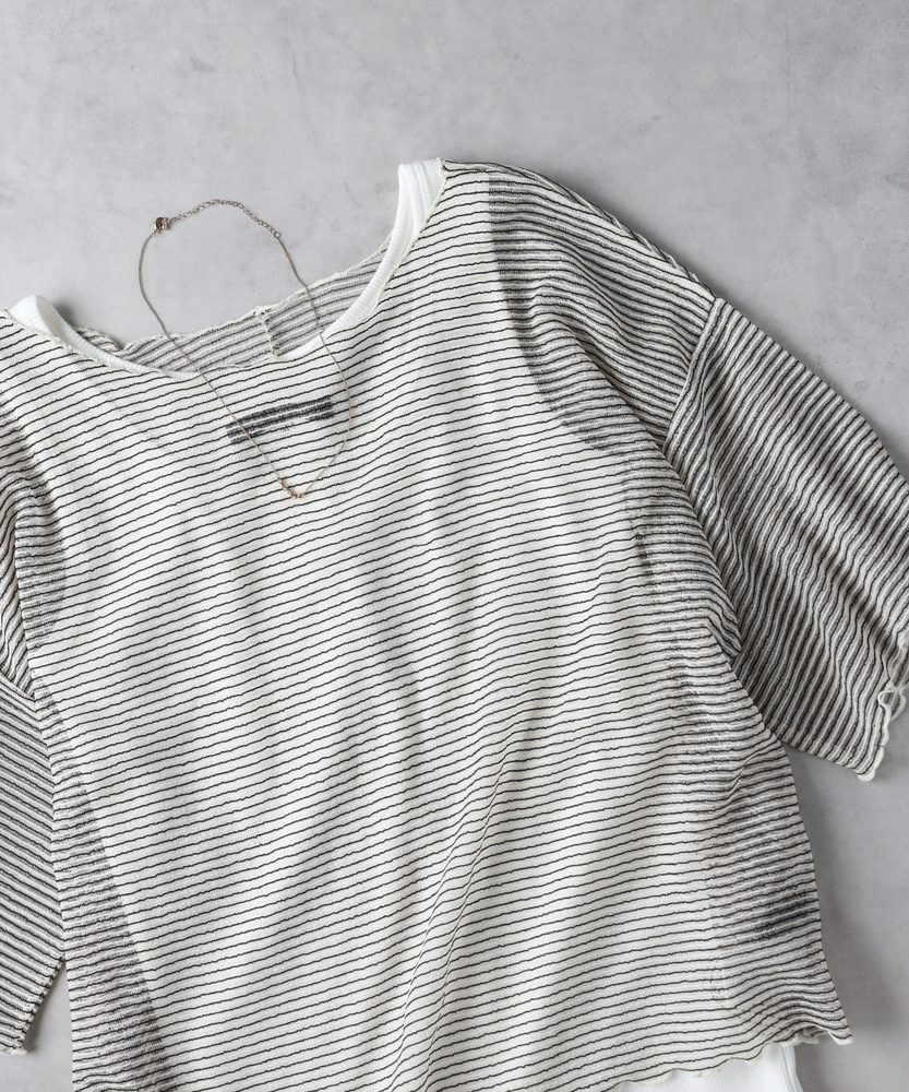 【仕様】シアーボーダー半袖Tシャツは、軽やかでリラックスした雰囲気を演出する一着。流れるようなシルエットが特徴で、ボーダーのデザインがカジュアルさを引き立てます。程よい首のあきが抜け感を演出し、つつ透け感のあるデザインがポイントです。【素材】透け感のあるシアー素材を使用しており、軽やかで肌触りも良好。夏場でも快適に過ごせる優れた通気性を持ち、インナーとのレイヤードスタイルを楽しむことができます。リラックス感がありながらも、上品さをキープする素敵なアイテムです。【スタイリング】デニムやリブパンツと合わせて、カジュアルなコーディネートを楽しむのがおすすめ。インナーにタンクトップやキャミソールを重ねて、彼方を透けさせるスタイルで、シルエットの美しさを引き立てることができます。シンプルなアクセサリーを合わせて、全体の調和を図ると、より洗練された印象に仕上がります。