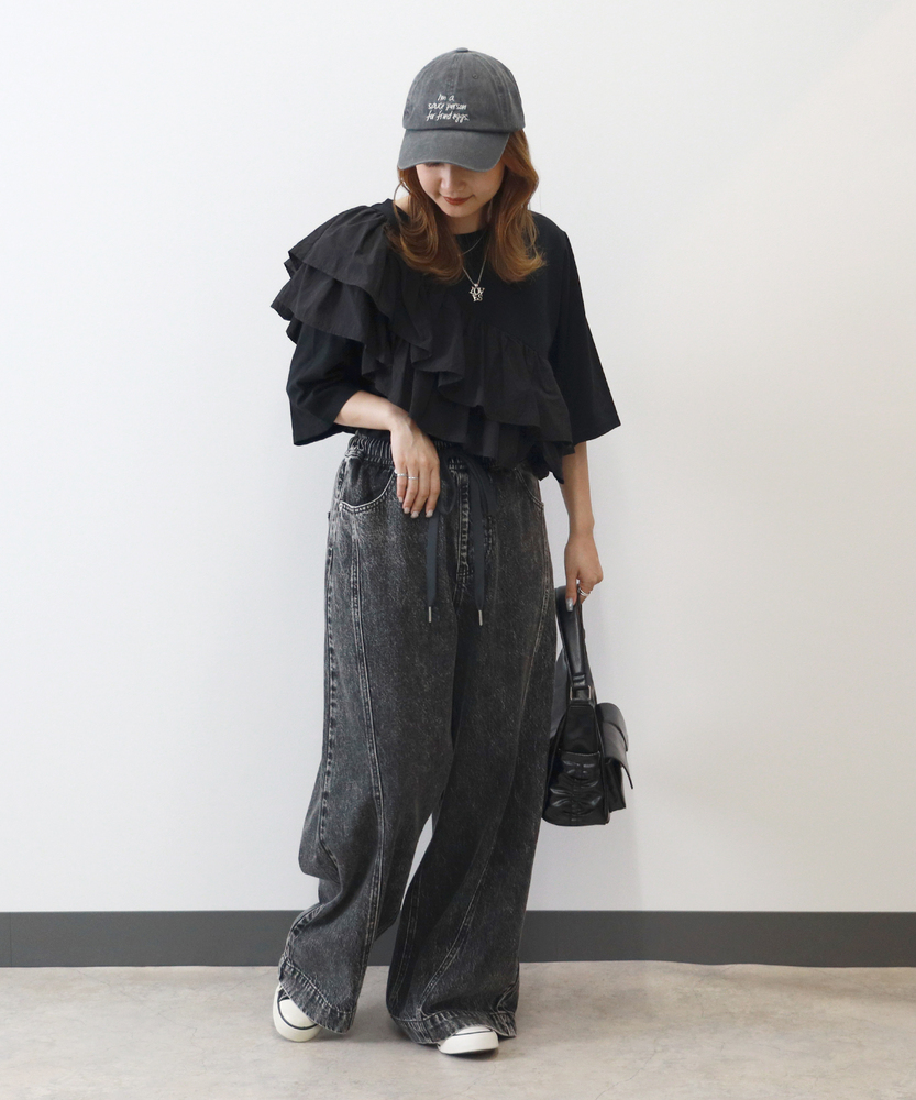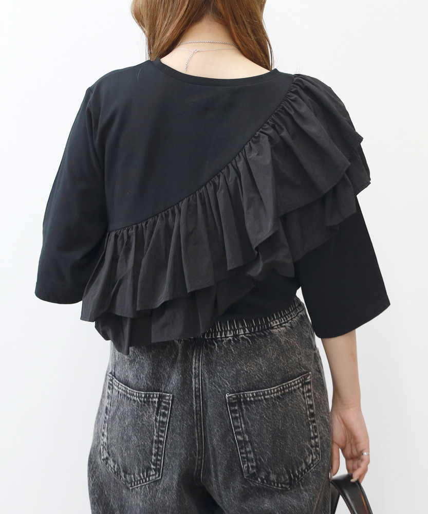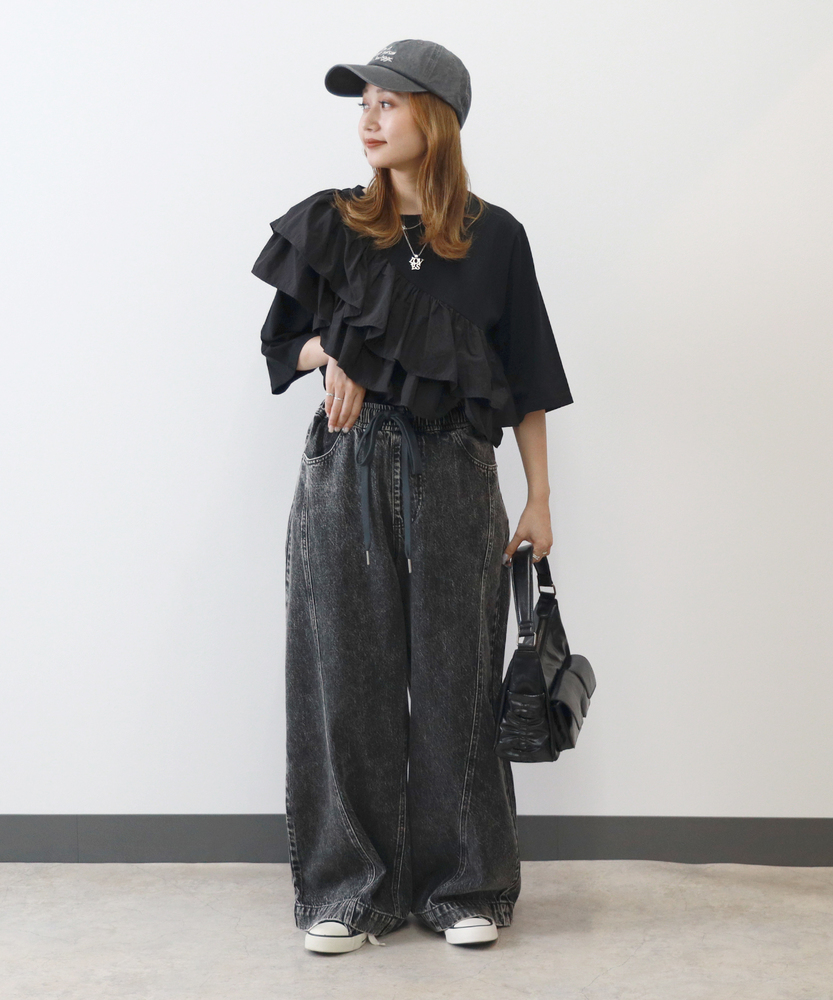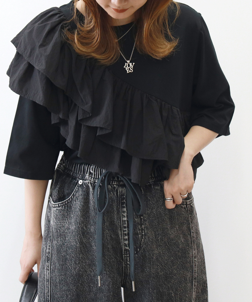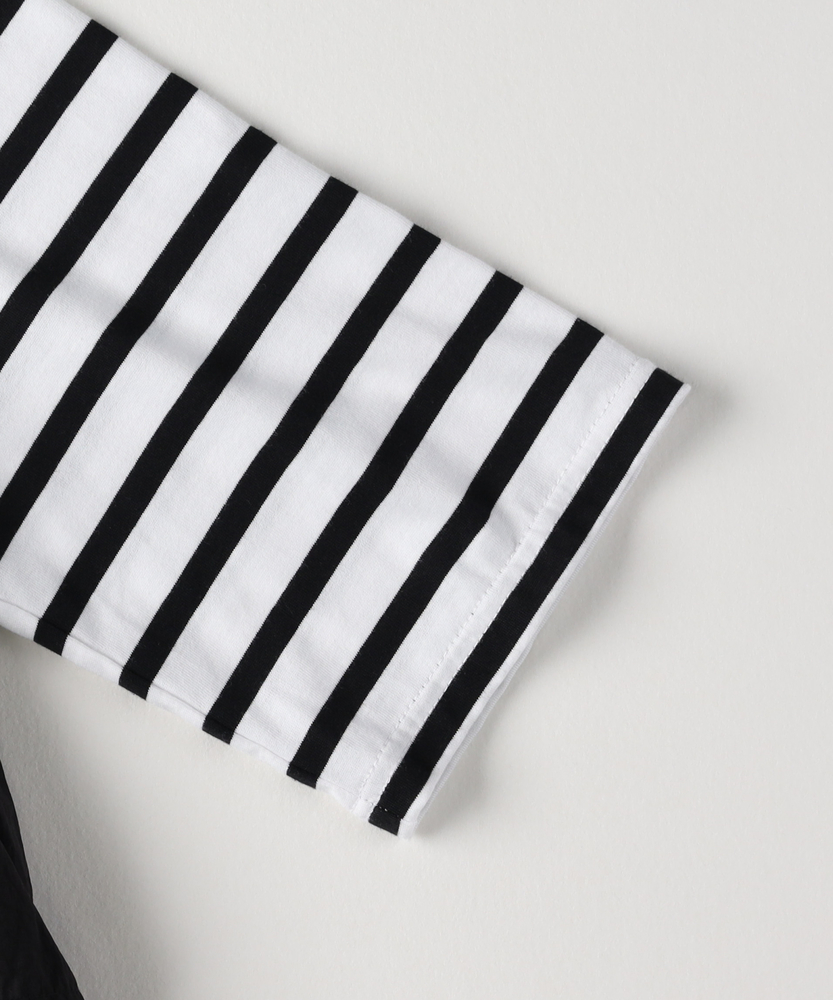 【仕様】アシンメトリーなフリルデザインが特徴のTシャツ。ストライプ柄のボディに大胆なフリルが施され、個性的でありながらも洗練された印象を与えます。カジュアルな中にもエレガントさを感じさせる一枚で、コーディネートの主役にぴったりです。【素材】 接触冷感素材を使用しており、暑い季節でも快適に着用できます。柔らかな肌触りと優れた通気性が特徴で、動きやすさも抜群。軽やかな素材感が、涼しげな印象を与え、夏のスタイルに最適です。 【スタイリング】 デニムやショートパンツと合わせて、リラックスしたカジュアルスタイルに。スカートと組み合わせることで、よりフェミニンな印象を楽しむことができます。シンプルなサンダルやスニーカーを合わせて、軽やかな夏のコーディネートを完成させましょう。
