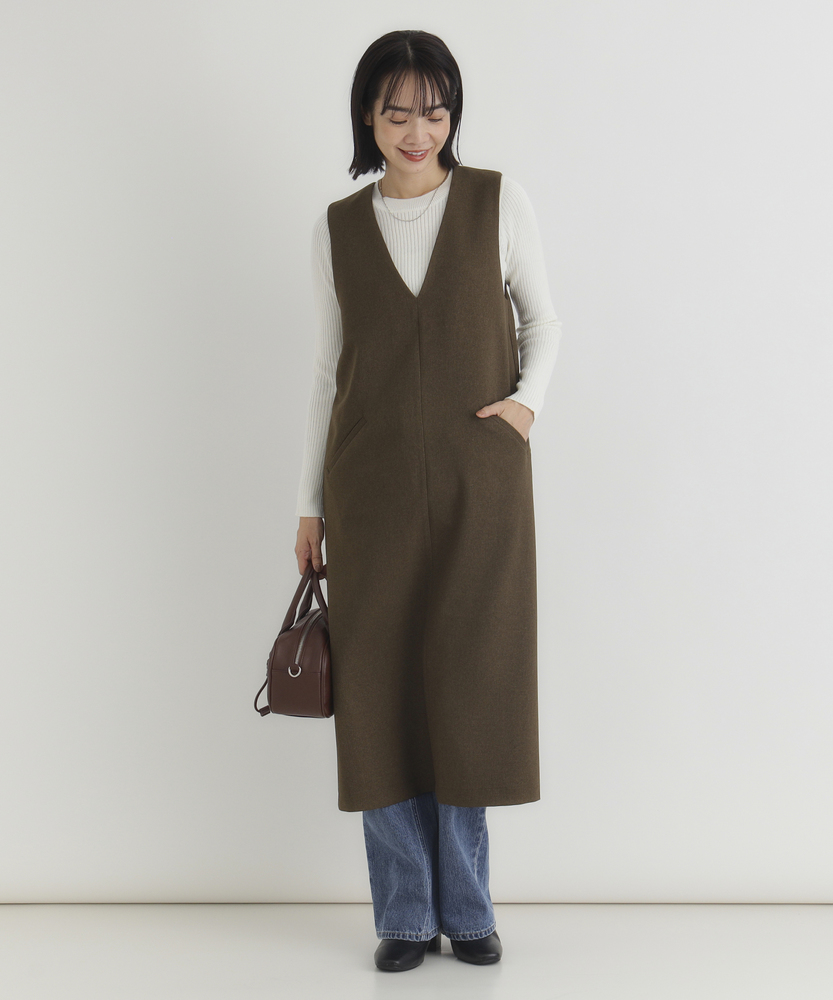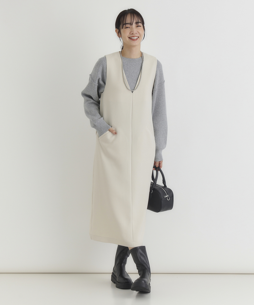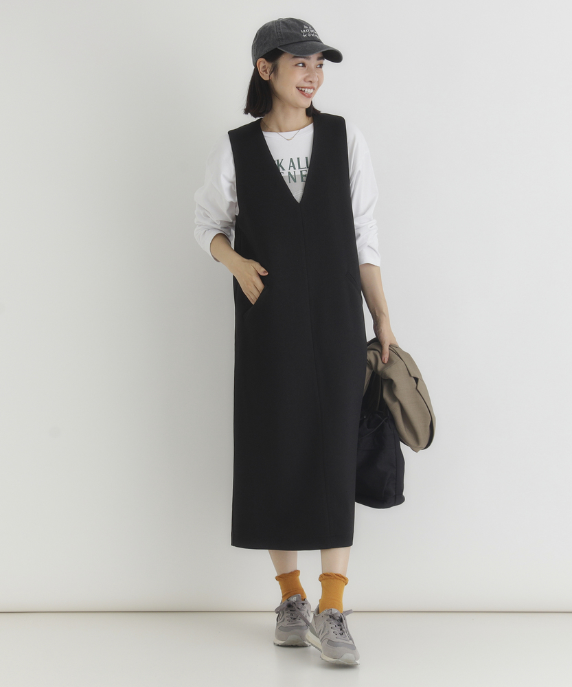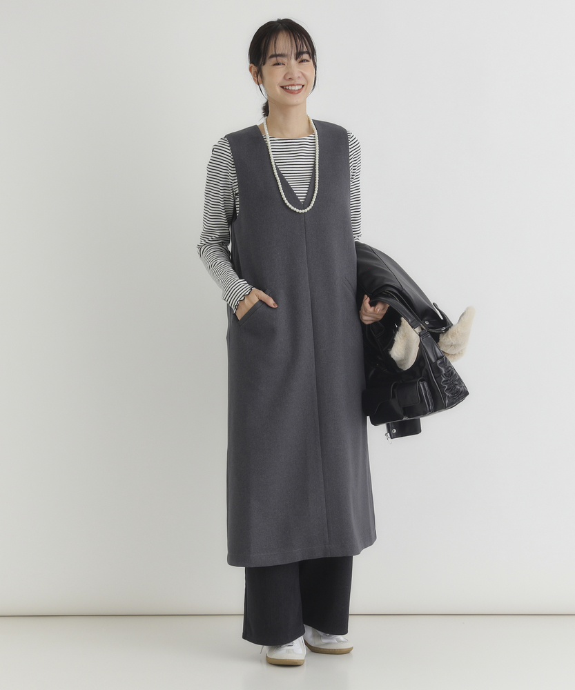 カジュアルはもちろん、キチン感を出す時にも!体型を拾いづらくスッキリ見えするワンピース。■Point・カジュアルにもキレイ目にも合わせられる汎用性。・Vネックで小顔効果も。・Iラインですっきり見え。・斜めに設置されたポケットはシルエットに配慮した仕様に。・ハリ感のある素材で体のラインを拾いにくい。・パンツのレイヤードスタイルにもおすすめ。【仕様】洗練されたベーシックなVネックワンピースは、トレンド感のあるデザインが魅力です。バックスリットが施されており、上品さを演出。シンプルながらも存在感のある一着です。【素材】 ポリエステル100%のツイル素材を使用しており、しっかりとした質感が特徴です。適度なゆとりがあり、重ね着を楽しむことができるため、季節を問わず活躍します。 【スタイリング】 シンプルなデザインなので、インナーにシャツやタートルネックを合わせてレイヤードスタイルを楽しむのがおすすめ。アクセサリーやシューズで個性をプラスし、オールシーズンで多彩なコーディネートが可能です。※こちらの商品はEC、一部店舗での限定展開となります。また店頭での発売日と前後する可能性がございます。予めご了承下さい。