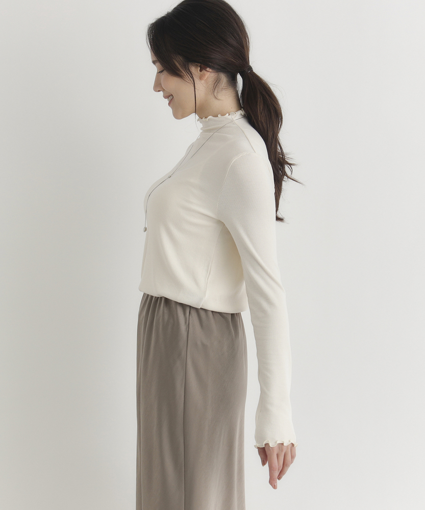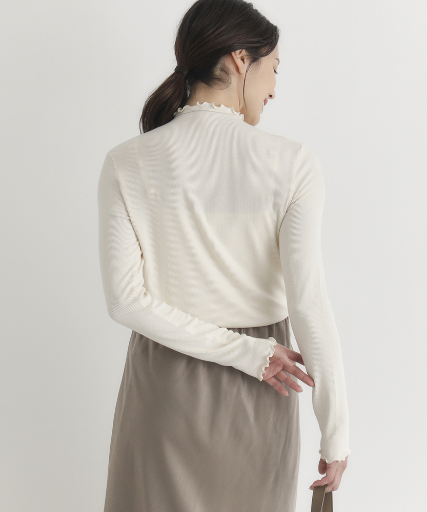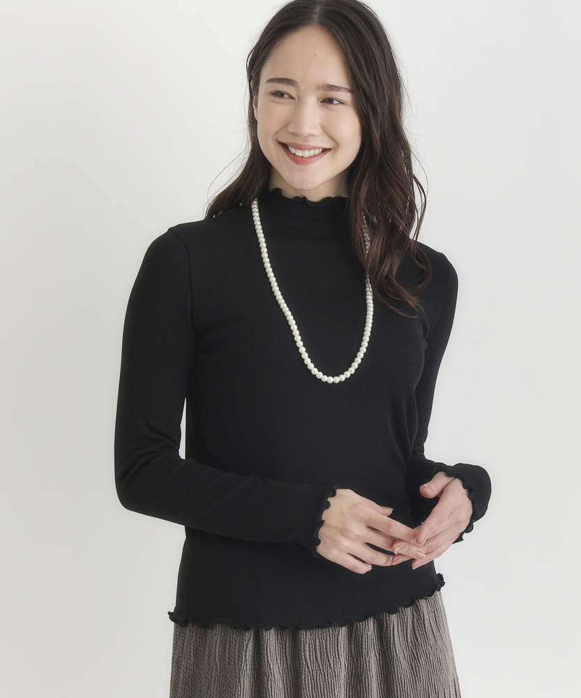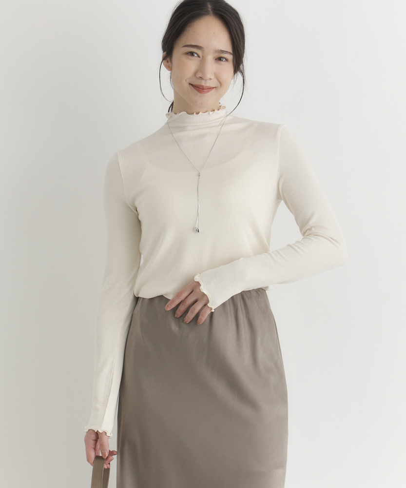 【仕様】メロウデザインが特徴のハイネックロングスリーブプルオーバー。レギュラーフィットで、体に優しくフィットしながらも、着やすさを追求したベーシックなシルエットです。【素材】 柔らかい素材を使用しており、心地良い着心地を実現。ハイネックデザインによって暖かさを保ちながら、メロウのディテールが柔らかさを演出。シーズンレスで活躍すること間違いなしです。 【スタイリング】 カジュアルなパンツやスカートと合わせたカジュアルスタイルはもちろん、ジャケットのインナーとしても活用できます。レイヤリングもしやすく、様々なスタイルにアレンジ可能なアイテムとして重宝します。