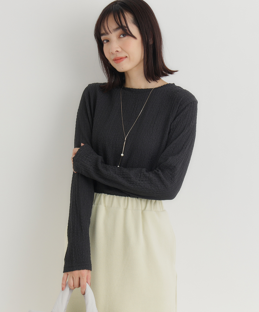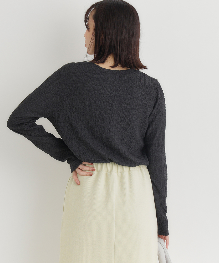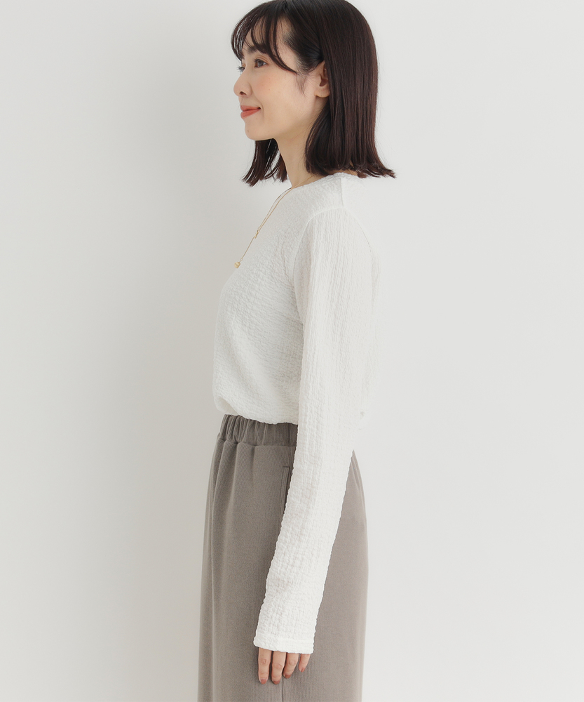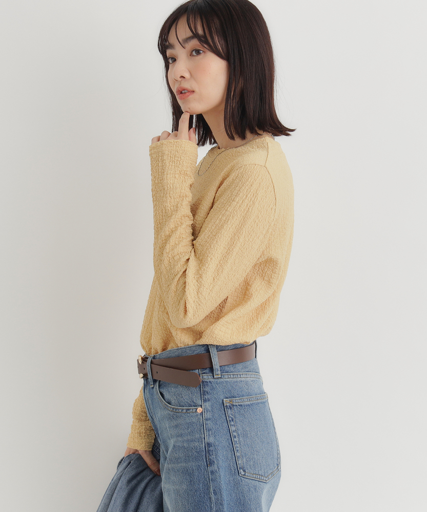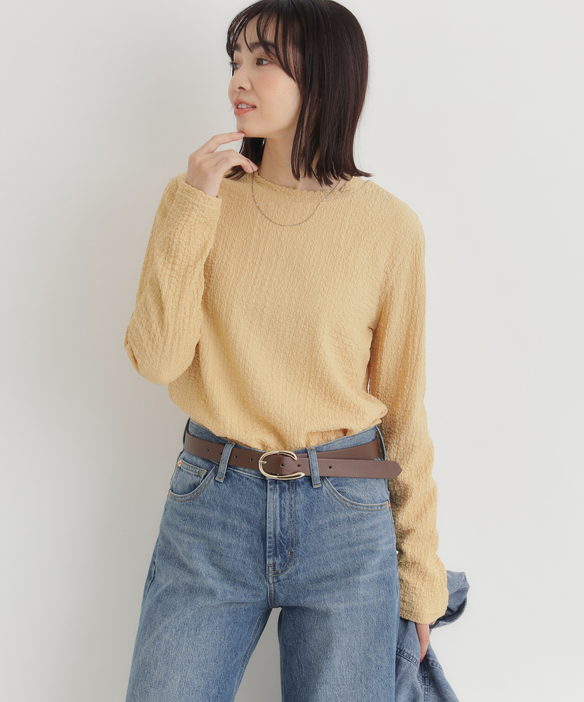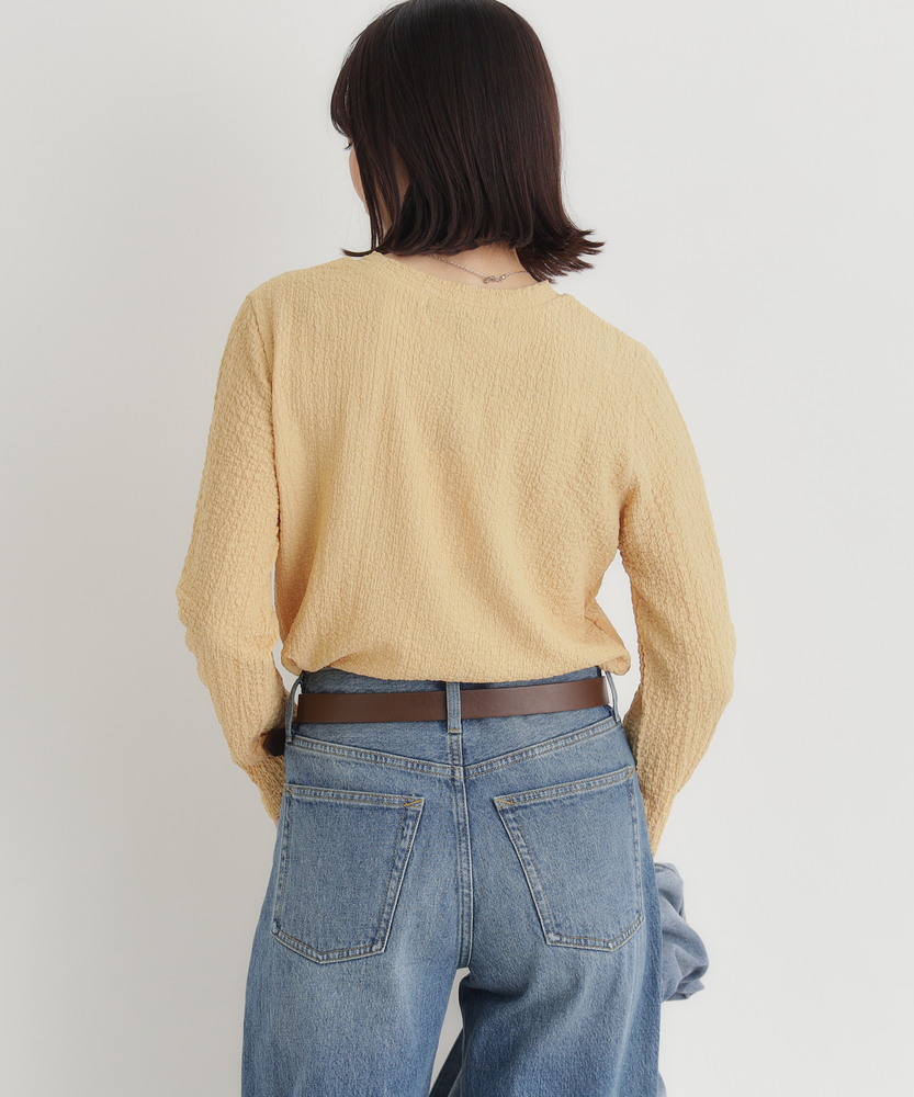 【仕様】洗練されたジャガード長袖Tシャツは、ソフトな質感と繊細なテクスチャーが魅力の一着です。ゆったりとしたフィット感が心地よく、どんなスタイルにも合わせやすいデザイン。ベーシックながらも、ほんのり個性的な印象を与え、女性らしさを引き立てます。【素材】 肌触りが良く、通気性に優れた素材を使用しているため、快適さを実現しています。ジャガード編みは、立体感を出しつつも軽やかな着心地を与え、秋冬の重ね着にも最適。また、耐久性も兼ね備えており、長く愛用できるアイテムに仕上げられています。 【スタイリング】 デニムと合わせることで、カジュアルでありながらも洗練された雰囲気を演出します。また、スカートやワンピースのインナーとして着ることで、レイヤードスタイルを楽しむことができます。シンプルながらもスタイルを引き立てる優れたアイテムです。