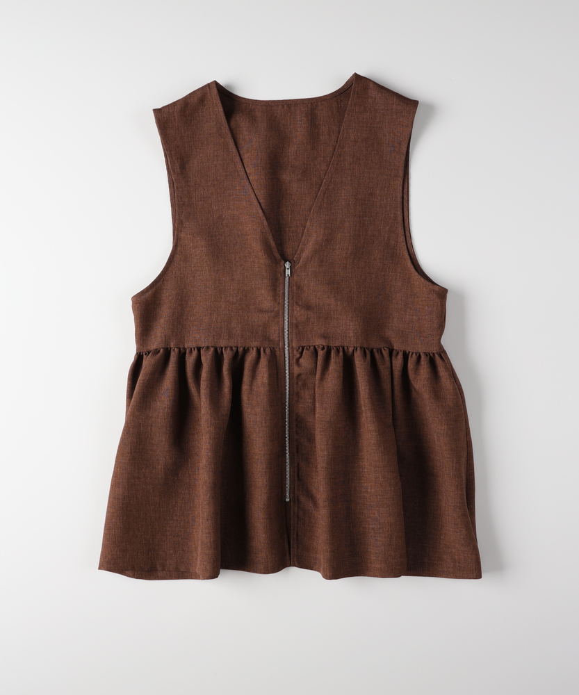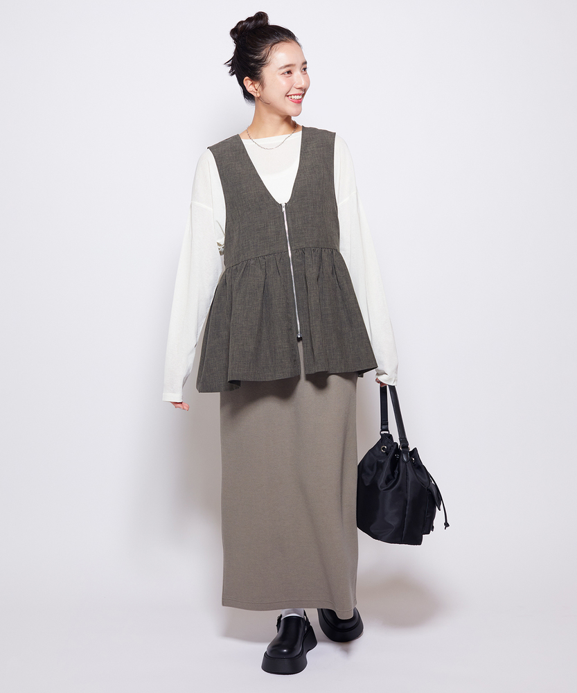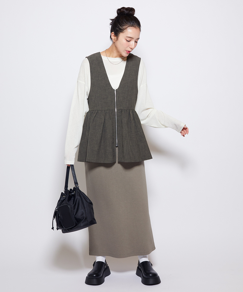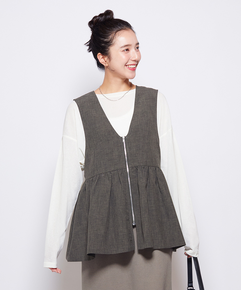 重ねるだけで、いつものコーデが見違える。甘すぎない「大人ペプラム」で、メリハリのある旬なスタイルへ。体型カバーとスタイルアップを同時に叶える、優秀レイヤードアイテム。■Point・スタイルアップ叶う「ペプラムシルエット」高めの位置に入れたウエスト切り替えがポイント。腰の位置を高く見せ、脚長効果を発揮します。ふんわり広がる裾が、女性らしい華やかさをプラス。・甘さを抑える「フロントジップ」シャープなシルバーのジップがアクセント。フェミニンなギャザーデザインを程よくカジュアルダウン。縦のラインを強調し、すっきりとした印象を与えます。・顔周りをシャープにする「深Vネック」デコルテをきれいに見せる深めのVネックライン。インナーのデザインを選ばず、レイヤードもスムーズ。タートルネックやロゴTとも相性抜群です。・気になる部分を隠す「体型カバー力」お腹周りや腰回りのラインを自然に目隠し。ギャザーの立体感で、ボディラインを拾いません。360度どこから見ても自信が持てるシルエット。・季節を問わず使える「ドライな質感」Tシャツからニットまで、合わせる素材を選びません。ロングシーズン着回せる、程よい厚みの生地感。いつもの服装にプラスワンするだけで鮮度がアップ。・ボトムスを選ばない「絶妙な丈感」パンツにもスカートにも合わせやすいバランス。ヒップにかかるくらいの丈が安心感を演出。ワイドパンツと合わせても重たくならずに決まります。【仕様】トレンドのペプラムシルエットを取り入れた、フェミニンかつモードな印象のベストです。胸下で切り替えたたっぷりのギャザーが立体的なフォルムを作り出し、シンプルながらも存在感のある一着に。フロントをジップ仕様にすることで甘さを抑え、大人の女性がデイリーに取り入れやすいデザインに仕上げました。【素材】さらりとしたドライなタッチで、ナチュラルな風合いを持つ素材を使用しています。程よいハリ感があるため、ペプラムのきれいなシルエットをキープ。季節の変わり目のレイヤードスタイルに重宝する、軽やかな着心地です。シワになりにくいのも嬉しいポイント。【スタイリング】シンプルなロンTやカットソーに重ねるだけで、一気にトレンド感のあるスタイルが完成します。ボトムスはタイトスカートやスリムパンツですっきりとまとめるのがおすすめ。同系色のボトムスと合わせてセットアップ風に着こなしたり、ワンピースの上に羽織って目線アップを狙うのもおしゃれです。 【セットアップで着用可能なアイテムはこちら】HR26102200011 【そよラク】コクーンパンツ/セットアップ対応