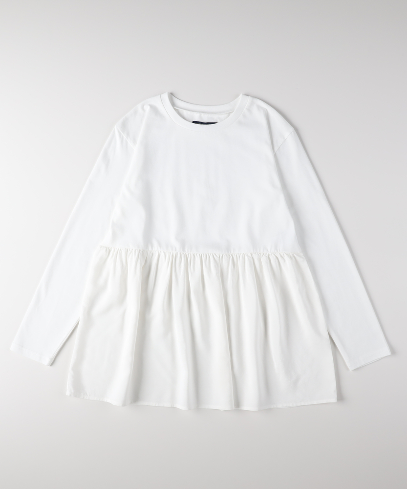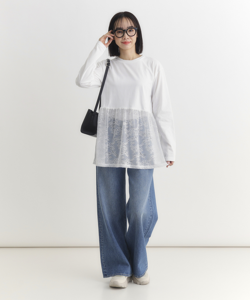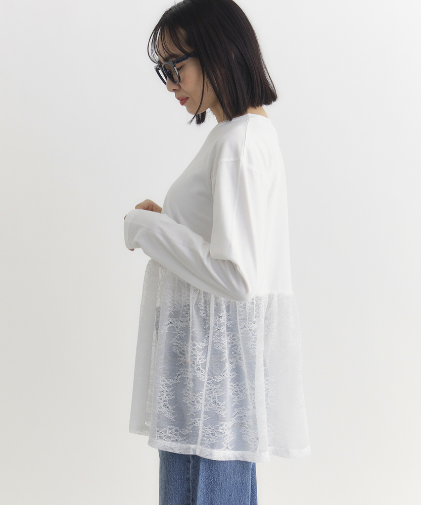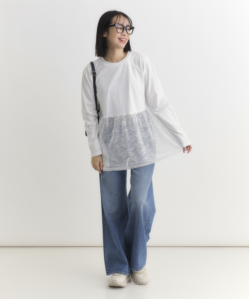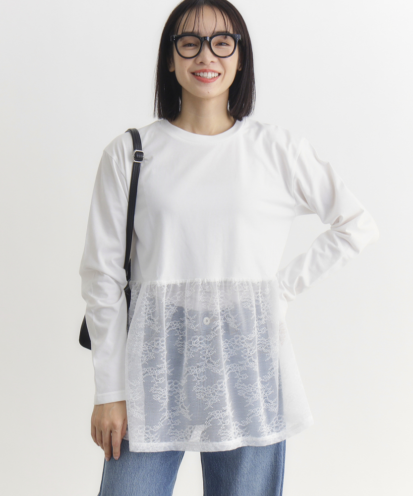 【仕様】一枚でコーディネートの主役になる、異素材ドッキングのロングスリーブTシャツです。身頃はシンプルなクルーネックですが、ウエストから切り替えられた繊細なレース素材のペプラムデザインが、華やかさと女性らしさをプラスします。高めの位置で切り替えることでスタイルアップ効果が期待でき、ふんわりと広がるシルエットが気になるお腹周りを自然にカバーしてくれるのも嬉しいポイントです。【素材】ベースとなる部分は、素肌に触れても心地よい、滑らかなタッチのカットソー素材を使用しています。裾部分には軽やかで表情のあるレース生地を組み合わせ、Tシャツの快適さとブラウスのような上品さを両立させました。気負わずデイリーに着られるリラックス感がありながら、手抜きに見えない「きちんと感」も演出できる素材使いです。【スタイリング】甘さのあるデザインなので、デニムやカーゴパンツなど、カジュアルなボトムスと合わせた甘辛ミックススタイルがおすすめです。細身のテーパードパンツやスキニーデニムと合わせれば、メリハリのあるすっきりとしたバランスに仕上がります。一枚着としてはもちろん、ジャケットやカーディガンの裾からレースを覗かせるレイヤードスタイルも、こなれ感が出て素敵です。