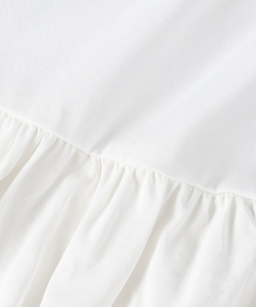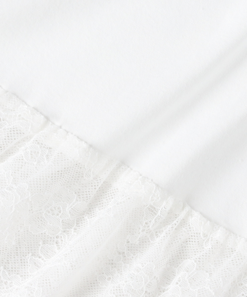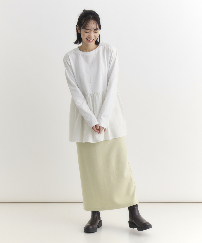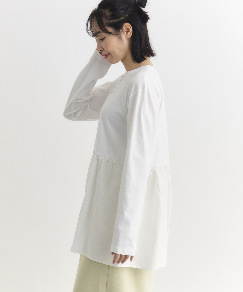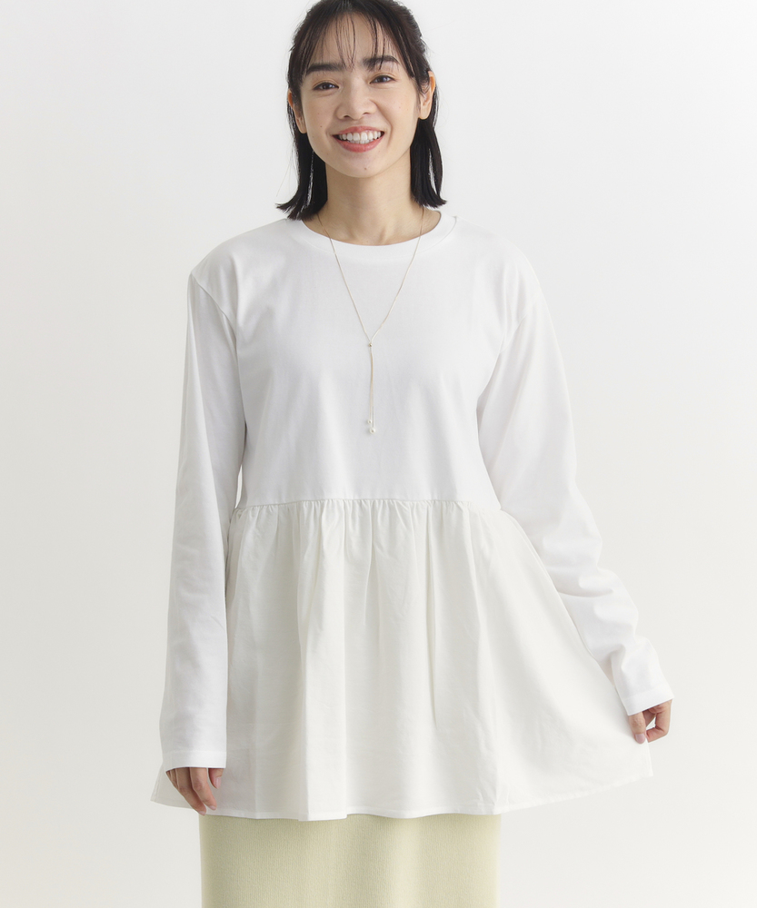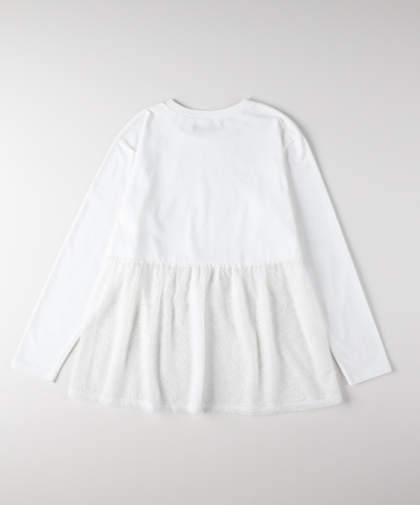 【仕様】一枚でコーディネートの主役になる、異素材ドッキングのロングスリーブTシャツです。身頃はシンプルなクルーネックですが、ウエストから切り替えられた繊細なレース素材のペプラムデザインが、華やかさと女性らしさをプラスします。高めの位置で切り替えることでスタイルアップ効果が期待でき、ふんわりと広がるシルエットが気になるお腹周りを自然にカバーしてくれるのも嬉しいポイントです。【素材】ベースとなる部分は、素肌に触れても心地よい、滑らかなタッチのカットソー素材を使用しています。裾部分には軽やかで表情のあるレース生地を組み合わせ、Tシャツの快適さとブラウスのような上品さを両立させました。気負わずデイリーに着られるリラックス感がありながら、手抜きに見えない「きちんと感」も演出できる素材使いです。【スタイリング】甘さのあるデザインなので、デニムやカーゴパンツなど、カジュアルなボトムスと合わせた甘辛ミックススタイルがおすすめです。細身のテーパードパンツやスキニーデニムと合わせれば、メリハリのあるすっきりとしたバランスに仕上がります。一枚着としてはもちろん、ジャケットやカーディガンの裾からレースを覗かせるレイヤードスタイルも、こなれ感が出て素敵です。