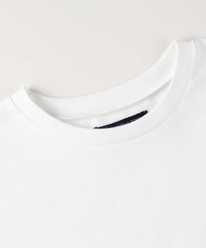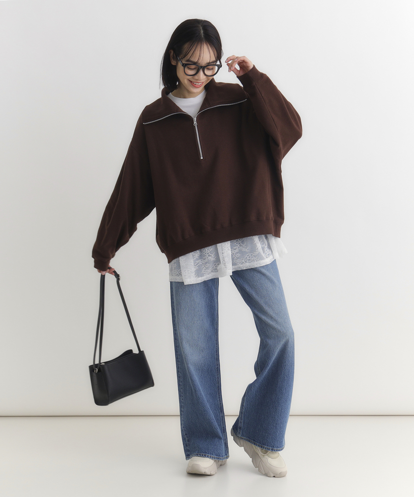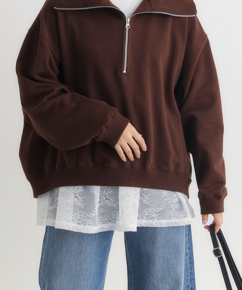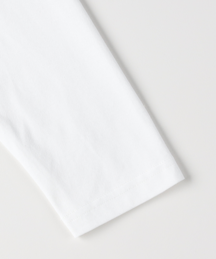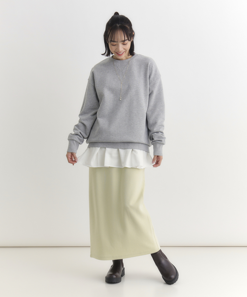 【仕様】一枚でコーディネートの主役になる、異素材ドッキングのロングスリーブTシャツです。身頃はシンプルなクルーネックですが、ウエストから切り替えられた繊細なレース素材のペプラムデザインが、華やかさと女性らしさをプラスします。高めの位置で切り替えることでスタイルアップ効果が期待でき、ふんわりと広がるシルエットが気になるお腹周りを自然にカバーしてくれるのも嬉しいポイントです。【素材】ベースとなる部分は、素肌に触れても心地よい、滑らかなタッチのカットソー素材を使用しています。裾部分には軽やかで表情のあるレース生地を組み合わせ、Tシャツの快適さとブラウスのような上品さを両立させました。気負わずデイリーに着られるリラックス感がありながら、手抜きに見えない「きちんと感」も演出できる素材使いです。【スタイリング】甘さのあるデザインなので、デニムやカーゴパンツなど、カジュアルなボトムスと合わせた甘辛ミックススタイルがおすすめです。細身のテーパードパンツやスキニーデニムと合わせれば、メリハリのあるすっきりとしたバランスに仕上がります。一枚着としてはもちろん、ジャケットやカーディガンの裾からレースを覗かせるレイヤードスタイルも、こなれ感が出て素敵です。