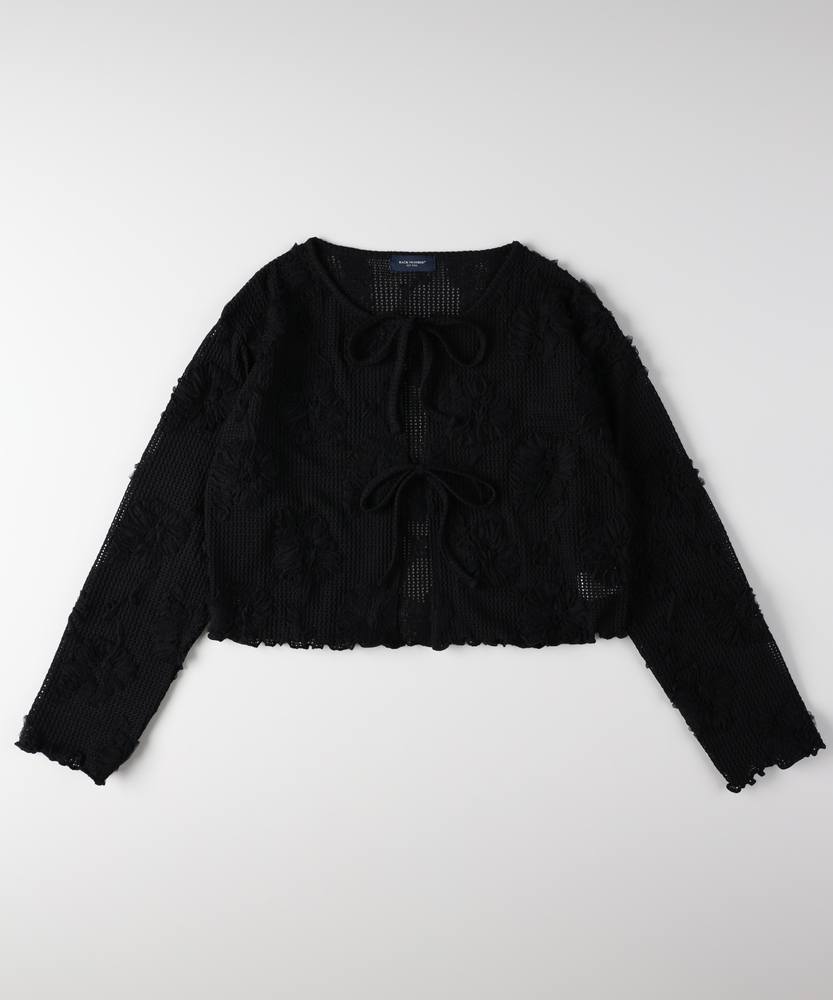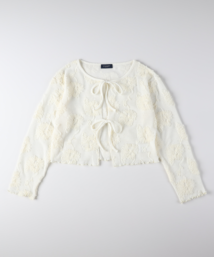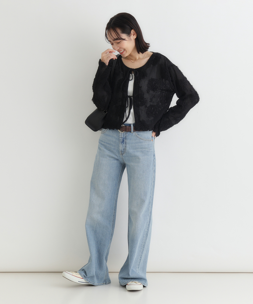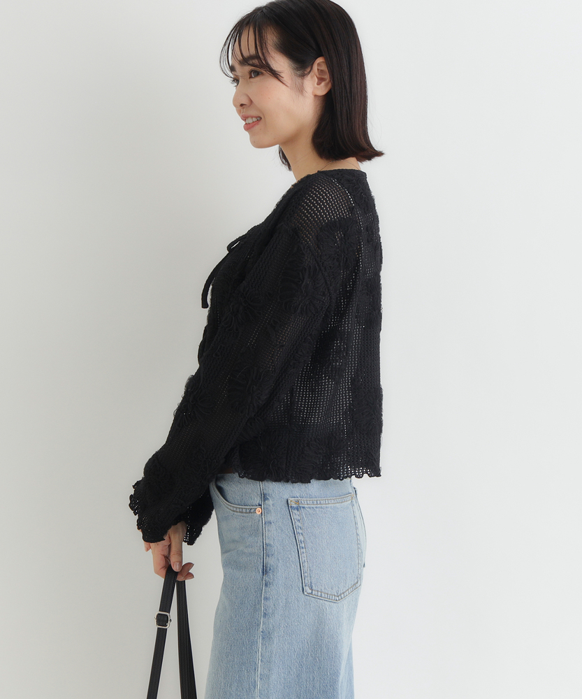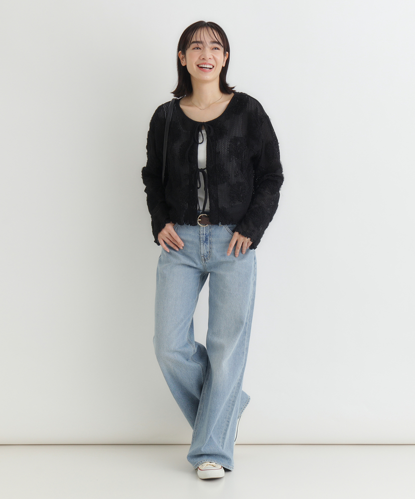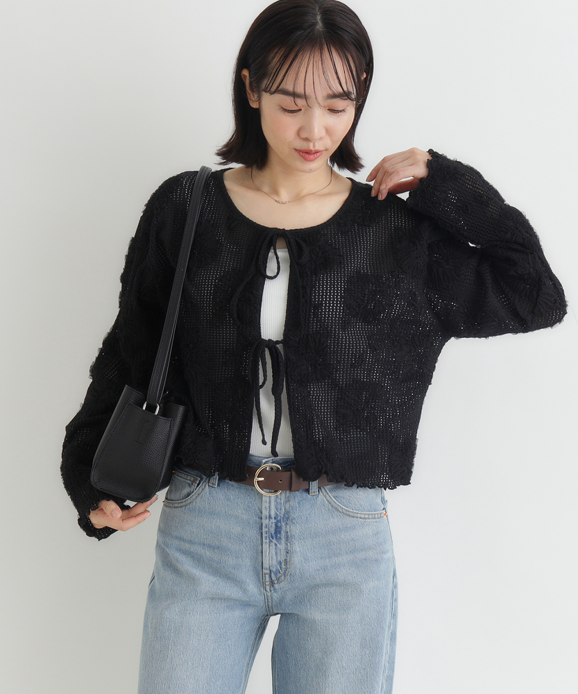 ほんのり透ける、大人の抜け感。ヴィンテージライクな主役級カーディガン。立体的な刺繍が目を惹く。いつものコーデを格上げする洗練デザイン。トレンドのショート丈でスタイルアップ。レイヤードが楽しくなる一枚。■Point・ヴィンテージライクな立体刺繍甘さを抑えた花柄のモチーフ。大人のカジュアルスタイルに。存在感のあるアクセントに。・トレンド感のあるシアー生地程よい透け感で抜け感を演出。インナー次第で表情が変化。季節の変わり目にも大活躍。・フロントリボンでアレンジ自在2箇所のリボンがアクセント。結ばずにさらりと羽織っても◎。着こなしの幅が広がります。・スタイルアップ叶うショート丈腰回りがすっきり見える丈感。ハイウエストボトムと好相性。バランス良く着こなせます。・女性らしいディテール使い袖口や裾の波打つデザイン。細部までこだわった仕上がり。さりげない可愛さをプラス。・合わせやすいベーシックカラー落ち着きのある大人な色合い。どんなボトムスとも馴染みます。毎日のコーデに大活躍します。【仕様】透け感のある軽やかなシアー生地に、立体的な花柄モチーフの刺繍をふんだんに施したヴィンテージライクなカーディガン。フロントはボタンではなく、2つのリボンで結ぶデザインを採用し、程よい抜け感と大人の可愛らしさを演出します。すっきりとしたショート丈で、トレンド感のあるシルエットに仕上げました。【素材】肌離れが良く、軽やかな風合いが魅力のシアー素材を使用しています。表面変化のある立体的な刺繍が、シンプルな着こなしに奥行きを与えてくれます。季節の変わり目の羽織りとしてはもちろん、インナーとのレイヤード次第でロングシーズン着回せるのも魅力。日常使いに寄り添う、リラクシーな着心地です。【スタイリング】ハイウエストのワイドデニムやカーゴパンツと合わせた、ヴィンテージライクなカジュアルスタイルがおすすめです。インナーにはシンプルなタンクトップを合わせ、透け感を活かしたレイヤードを楽しんで。ワンピースの上にサッと羽織れば、視線が上に引き上がりバランス良くスタイルアップ効果も狙えます。【BACK NUMBER】ワーク・ミリタリーといったアメリカンカジュアルを根幹に、古き良きヴィンテージウェアの魅力を受け継ぎながらも、現代のライフスタイルや着こなしに合わせた素材・シルエットで再構築した、【Re-Vintage】をコンセプトに掲げるブランド。