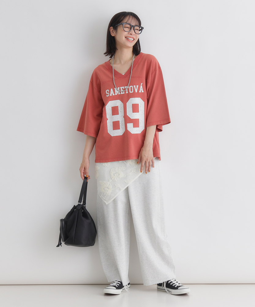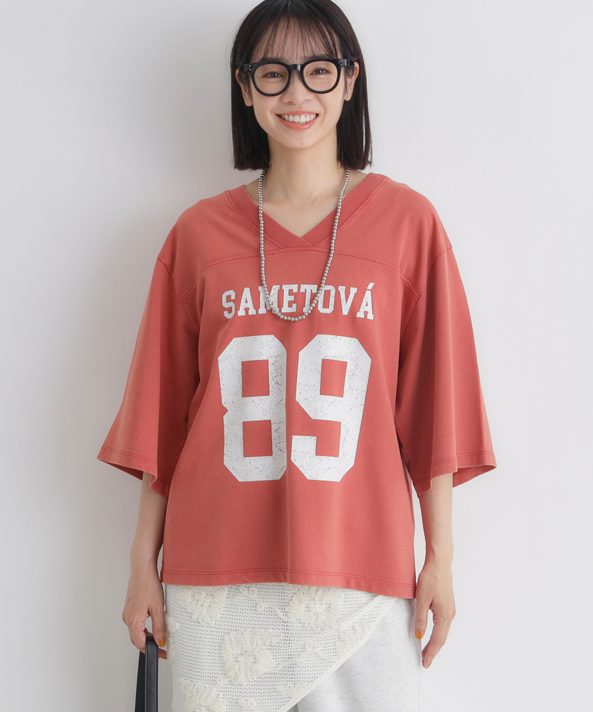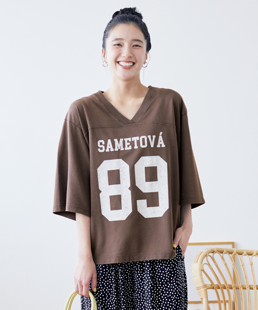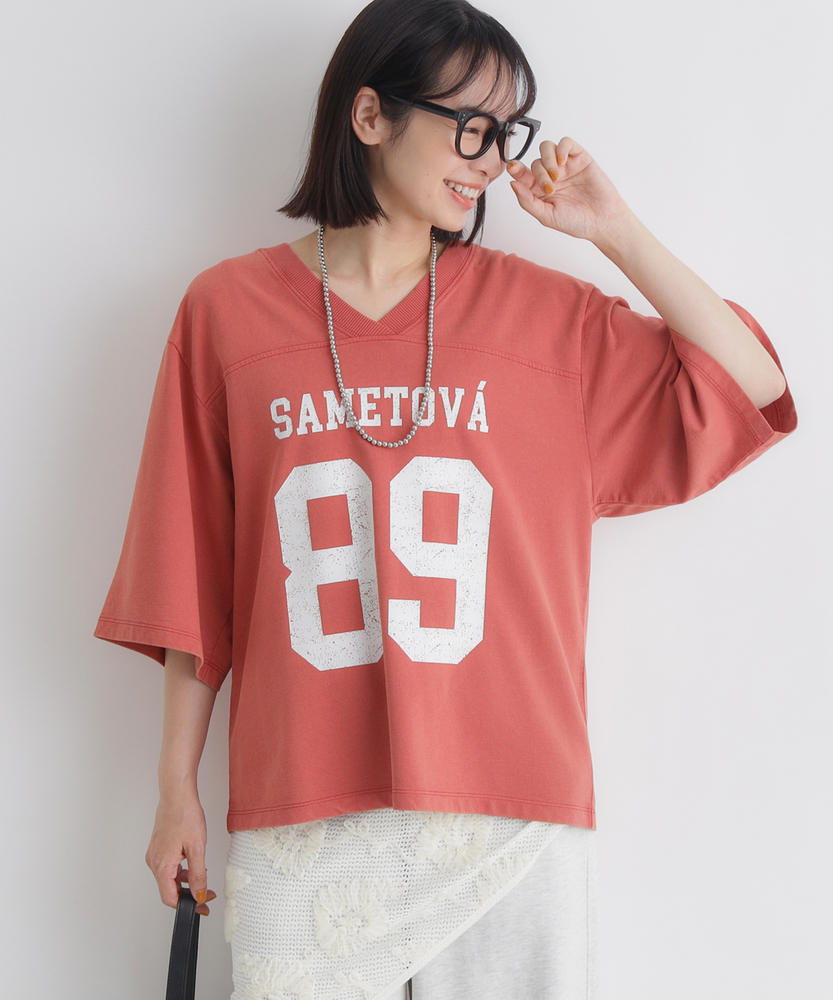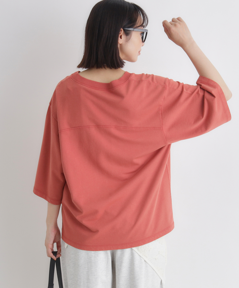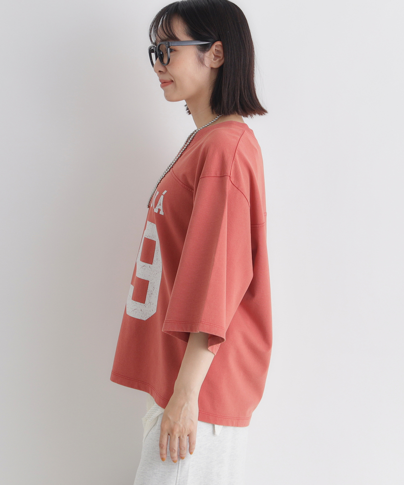 大人のカジュアルに、ヴィンテージなスパイスを。スポーティなのに女性らしい抜け感。スタイルアップも叶える、主役級フットボールTシャツ。■Point・顔周りをすっきり見せるVネック程よい開きのVネックデザイン。デコルテラインをきれいに演出。カジュアルさに女性らしい抜け感をプラス。・こなれ感漂うかすれプリントヴィンテージライクなフロントロゴ。主張しすぎないかすれ具合が絶妙。大人のデイリースタイルに馴染みます。・バランス良く決まるショート丈トレンド感のあるクロップド丈。アウトで着てもすっきりとした印象に。自然なスタイルアップを叶えます。・華奢見えを叶えるワイドな袖口ゆったりとしたドロップショルダー。幅広の袖が二の腕をすっぽりカバー。風通しが良くリラクシーな着心地です。・本格的なフットボールTデザイン胸元と背中に入った切り替えライン。スポーティなディテールがアクセント。一枚着るだけでサマになる存在感。・秋口まで頼れる落ち着いた配色深みのあるシックなカラー展開。派手すぎず大人っぽく着こなせます。ロングシーズン活躍する頼れる一枚。【仕様】スポーティなフットボールTシャツを、大人の女性が着やすいバランスに落とし込んだ一枚。ヴィンテージライクなかすれプリントがこなれ感を演出します。顔周りをすっきり見せるVネックと、ゆったりとしたワイドスリーブが、カジュアルな中に女性らしい抜け感をプラス。トレンドのショート丈で全体のバランスをきれいに整えます。【素材】デイリーユースにぴったりな、肌馴染みの良い柔らかな生地を採用しました。程よい厚みがあり、ゆったりとしたシルエットを美しくキープします。古着のような風合いを感じさせる落ち着いたトーンが魅力で、気兼ねなく日常に取り入れられるタフさも嬉しいポイント。着るたびに愛着が湧く、デイリーウェアに最適な質感です。【スタイリング】ハイウエストのワイドデニムやカーゴパンツと合わせれば、トレンド感のある大人カジュアルスタイルが完成します。ショート丈なので、タックアウトのままでも脚長効果が期待できるのが魅力。あえてフェミニンなフレアスカートやタイトスカートと合わせて、スポーティさを中和した甘辛ミックスコーデを楽しむのもおすすめです。