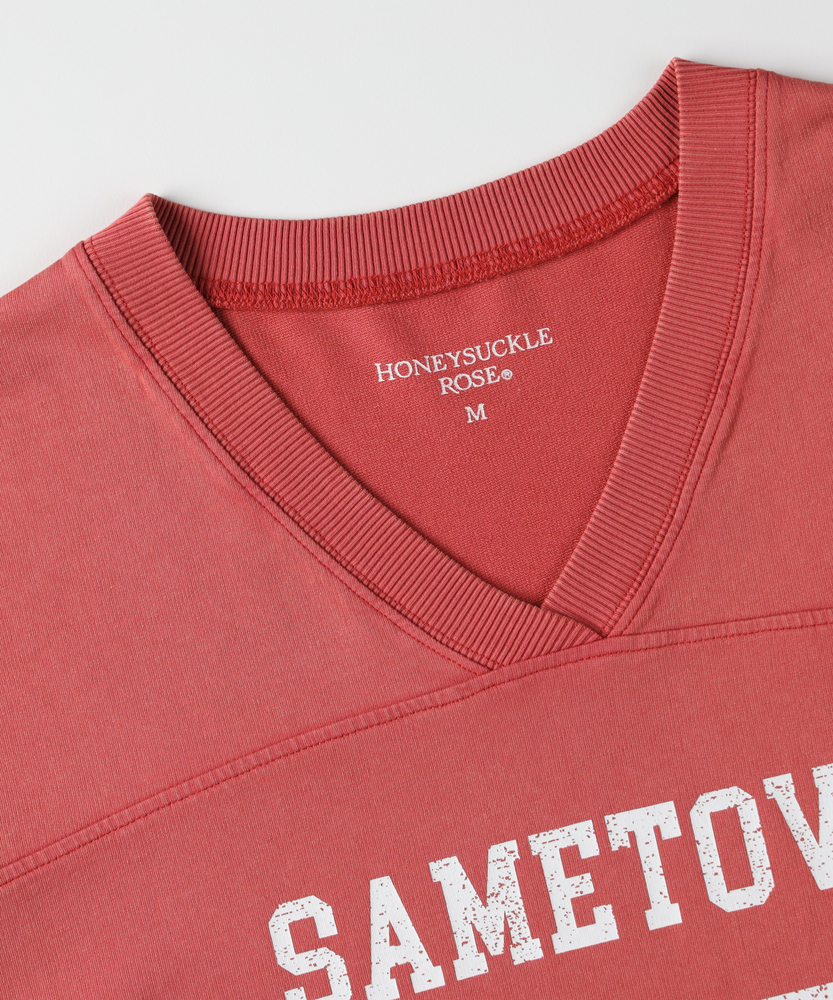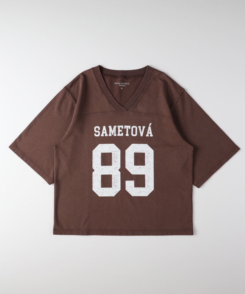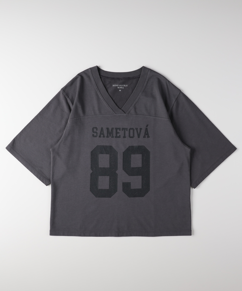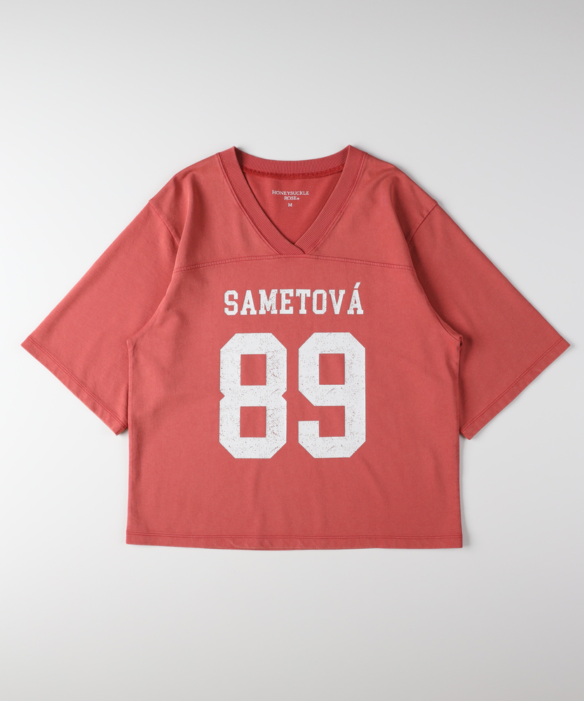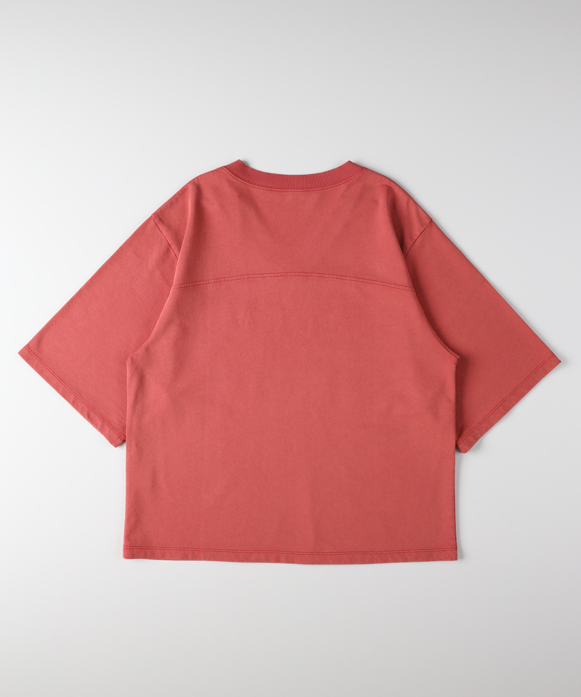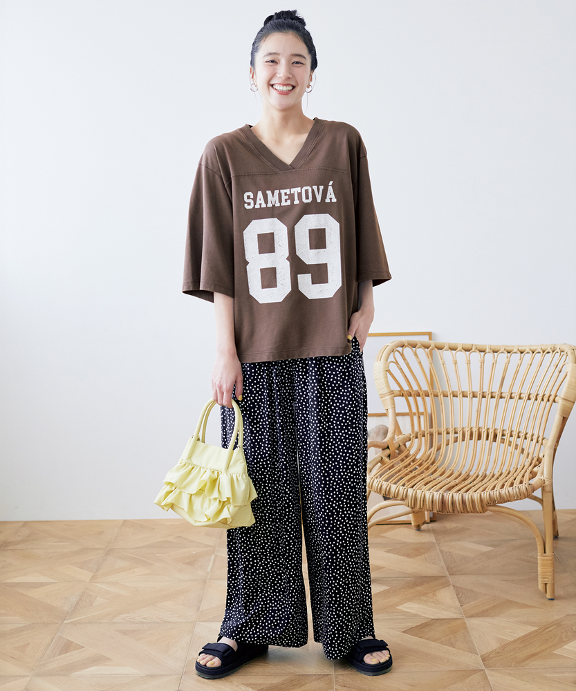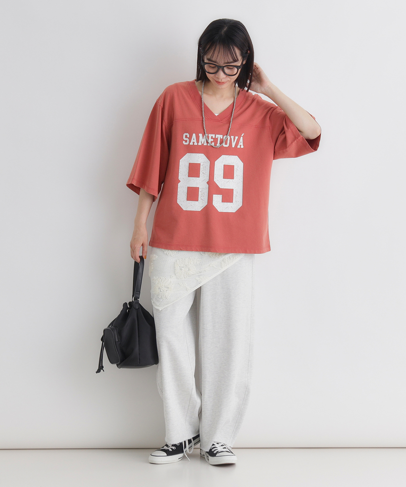 大人のカジュアルに、ヴィンテージなスパイスを。スポーティなのに女性らしい抜け感。スタイルアップも叶える、主役級フットボールTシャツ。■Point・顔周りをすっきり見せるVネック程よい開きのVネックデザイン。デコルテラインをきれいに演出。カジュアルさに女性らしい抜け感をプラス。・こなれ感漂うかすれプリントヴィンテージライクなフロントロゴ。主張しすぎないかすれ具合が絶妙。大人のデイリースタイルに馴染みます。・バランス良く決まるショート丈トレンド感のあるクロップド丈。アウトで着てもすっきりとした印象に。自然なスタイルアップを叶えます。・華奢見えを叶えるワイドな袖口ゆったりとしたドロップショルダー。幅広の袖が二の腕をすっぽりカバー。風通しが良くリラクシーな着心地です。・本格的なフットボールTデザイン胸元と背中に入った切り替えライン。スポーティなディテールがアクセント。一枚着るだけでサマになる存在感。・秋口まで頼れる落ち着いた配色深みのあるシックなカラー展開。派手すぎず大人っぽく着こなせます。ロングシーズン活躍する頼れる一枚。【仕様】スポーティなフットボールTシャツを、大人の女性が着やすいバランスに落とし込んだ一枚。ヴィンテージライクなかすれプリントがこなれ感を演出します。顔周りをすっきり見せるVネックと、ゆったりとしたワイドスリーブが、カジュアルな中に女性らしい抜け感をプラス。トレンドのショート丈で全体のバランスをきれいに整えます。【素材】デイリーユースにぴったりな、肌馴染みの良い柔らかな生地を採用しました。程よい厚みがあり、ゆったりとしたシルエットを美しくキープします。古着のような風合いを感じさせる落ち着いたトーンが魅力で、気兼ねなく日常に取り入れられるタフさも嬉しいポイント。着るたびに愛着が湧く、デイリーウェアに最適な質感です。【スタイリング】ハイウエストのワイドデニムやカーゴパンツと合わせれば、トレンド感のある大人カジュアルスタイルが完成します。ショート丈なので、タックアウトのままでも脚長効果が期待できるのが魅力。あえてフェミニンなフレアスカートやタイトスカートと合わせて、スポーティさを中和した甘辛ミックスコーデを楽しむのもおすすめです。