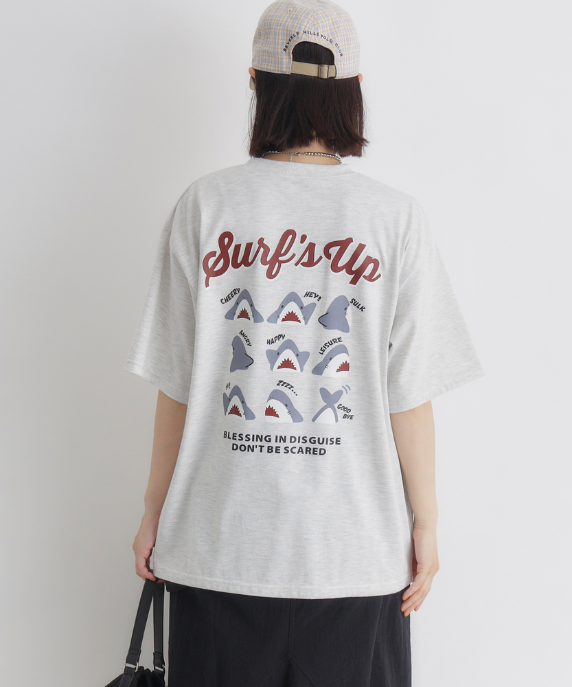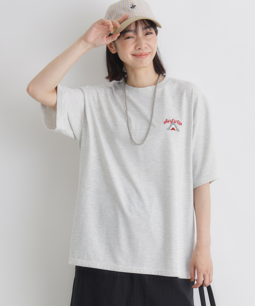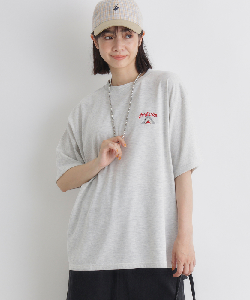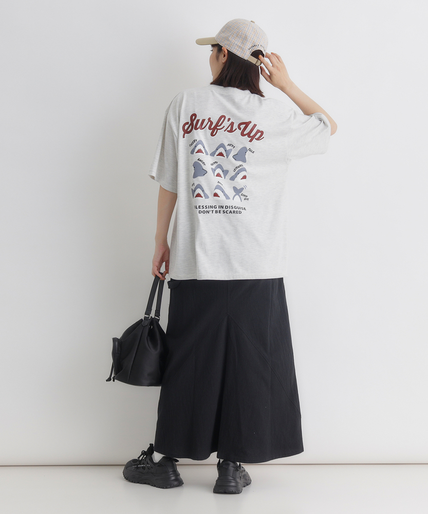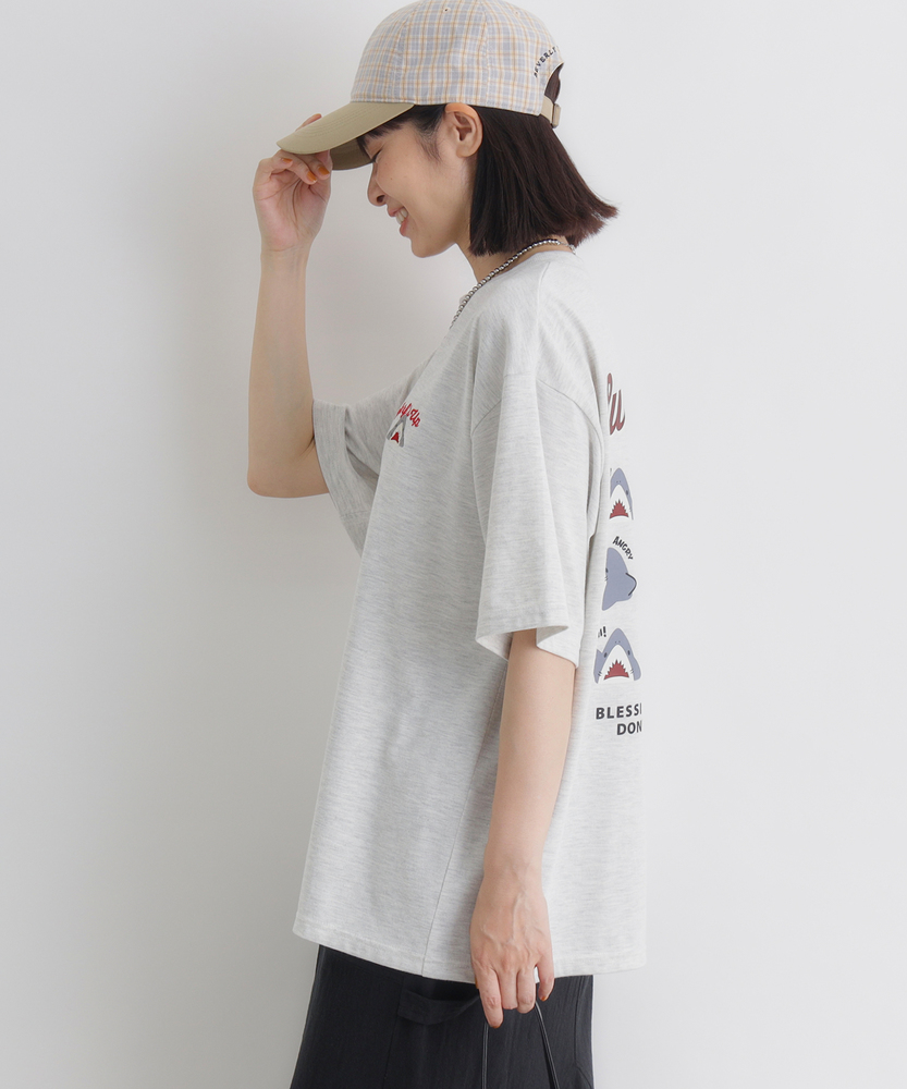 後ろ姿で語る、大人の遊び心。ゆったりシルエットで叶える「エフォートレスな日常」。リラクシーに着映える、主役級プリントTシャツ。■Point・目を惹くバックプリント愛嬌たっぷりのサメたちが勢ぞろい。後ろ姿に遊び心をプラスします。大人のカジュアルコーデのアクセントに。・フロントはシンプルに胸元にはさりげないワンポイント。前から見るとすっきりとした印象に。どんなボトムスとも好相性です。・こなれ感漂うビッグシルエットゆったりとしたオーバーサイズ。身体のラインを拾わずリラックス。自然な抜け感を演出します。・華奢見えドロップショルダー肩のラインを落としたデザイン。二の腕周りも優しくカバーします。女性らしい柔らかなシルエットに。・着回しやすいベーシックカラー日常使いに馴染む落ち着いた色合い。お手持ちのアイテムと合わせやすい。色違いで揃えたくなる使い勝手の良さ。・定番のクルーネック首元がすっきり見えるクルーネック。程よい開き具合で安心感があります。レイヤードスタイルにも最適です。【仕様】ゆったりとした身幅とドロップショルダーが特徴のビッグシルエットTシャツです。フロントは左胸にさりげないワンポイントをあしらい、すっきりとした印象に。一方でバックには、表情豊かなサメのイラストとロゴを大胆にプリント。前後で異なる表情を楽しめる、大人の遊び心をくすぐるデザインに仕上がっています。【素材】肌当たりが良く、デイリーユースにぴったりの柔らかな生地感です。厚すぎず薄すぎない程よい肉感で、一枚で着ても安心感があります。リラックスタイムからちょっとしたお出かけまで、気負わずデイリーに着回せるタフさも魅力。ロングシーズン活躍してくれる、ワードローブの頼れる味方です。【スタイリング】ボリュームのあるトップスなので、細身のテーパードパンツやリブスカートと合わせるとバランス良くまとまります。あえてワイドパンツやマキシスカートを合わせて、全体をゆるっとさせたリラクシーなスタイリングも今の気分。フロントだけ軽くタックインすれば、こなれ感のあるシルエットが完成します。