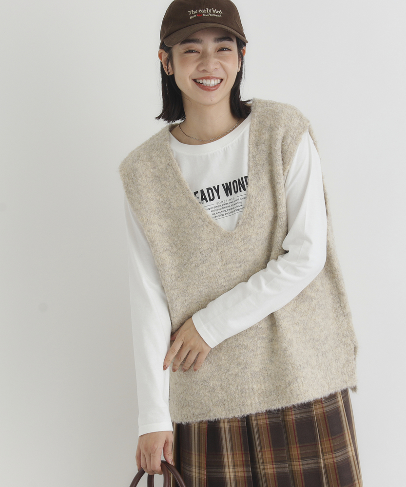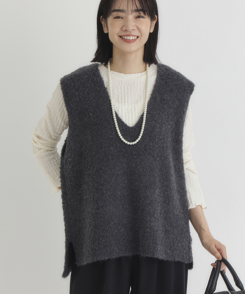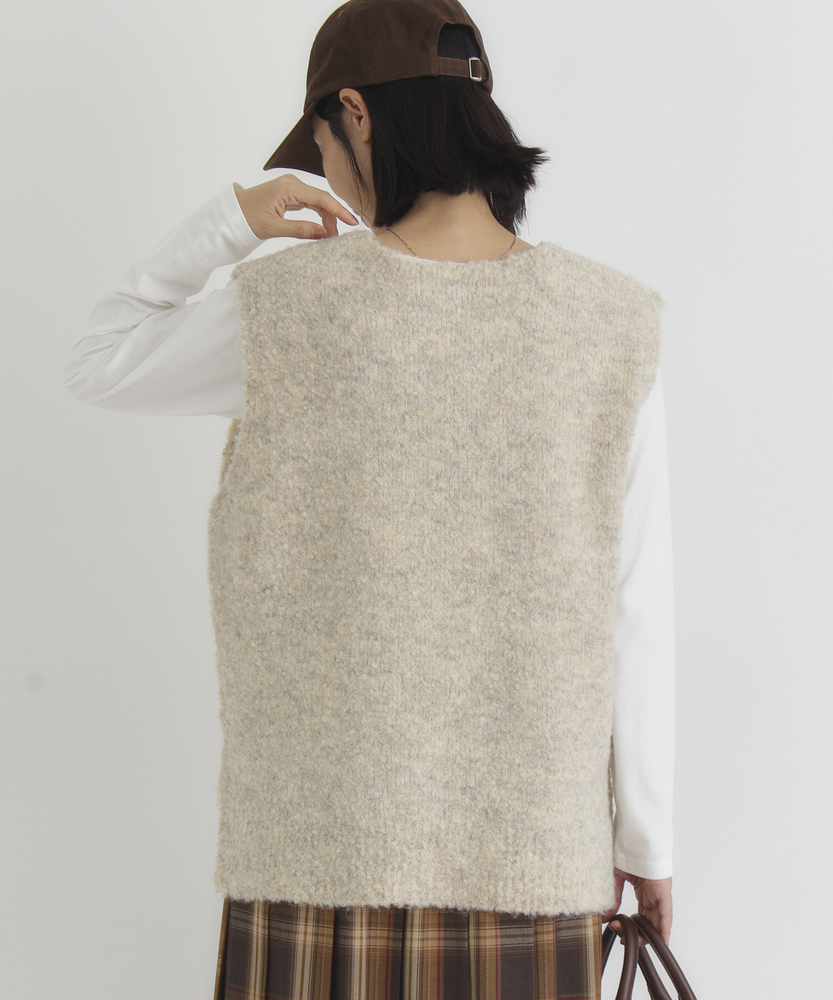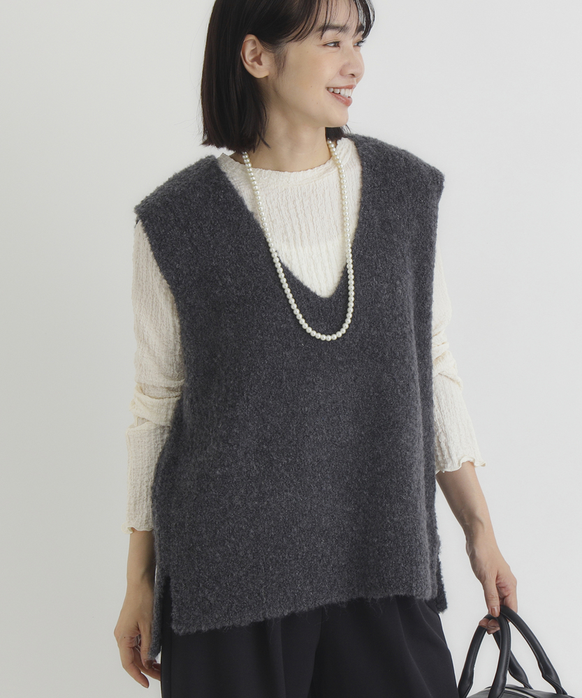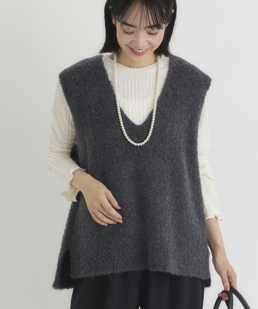 ブークレニットベストは、体型カバーができるコクーンシルエットが特徴です。