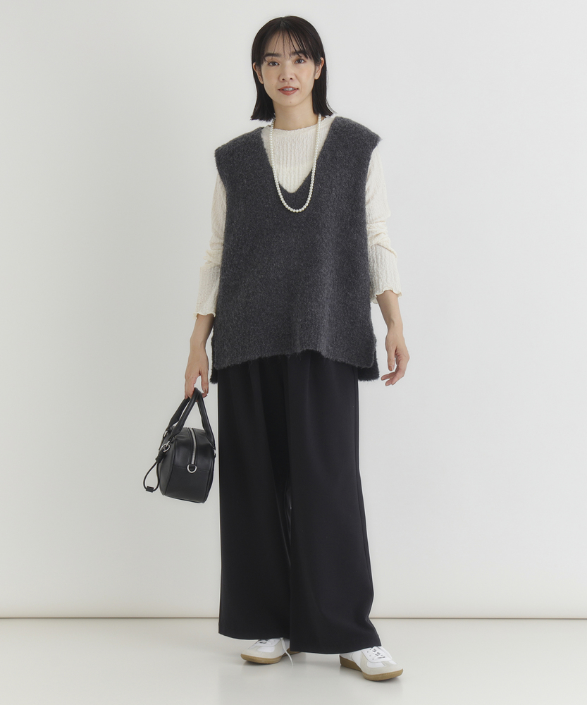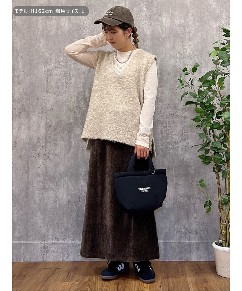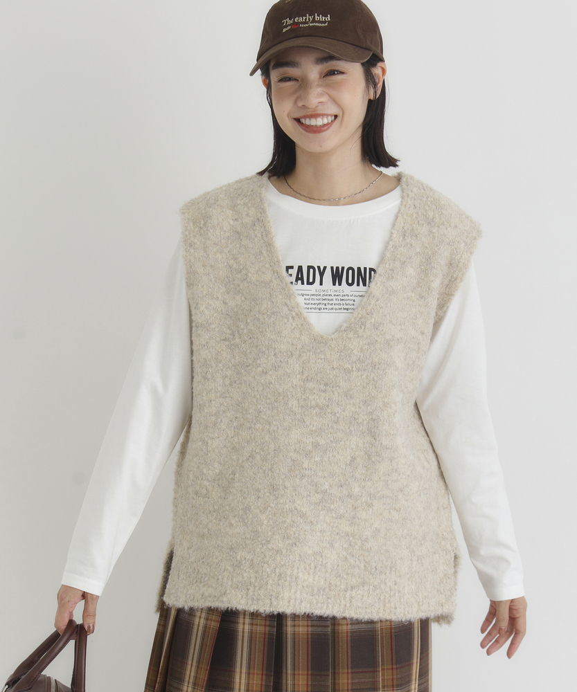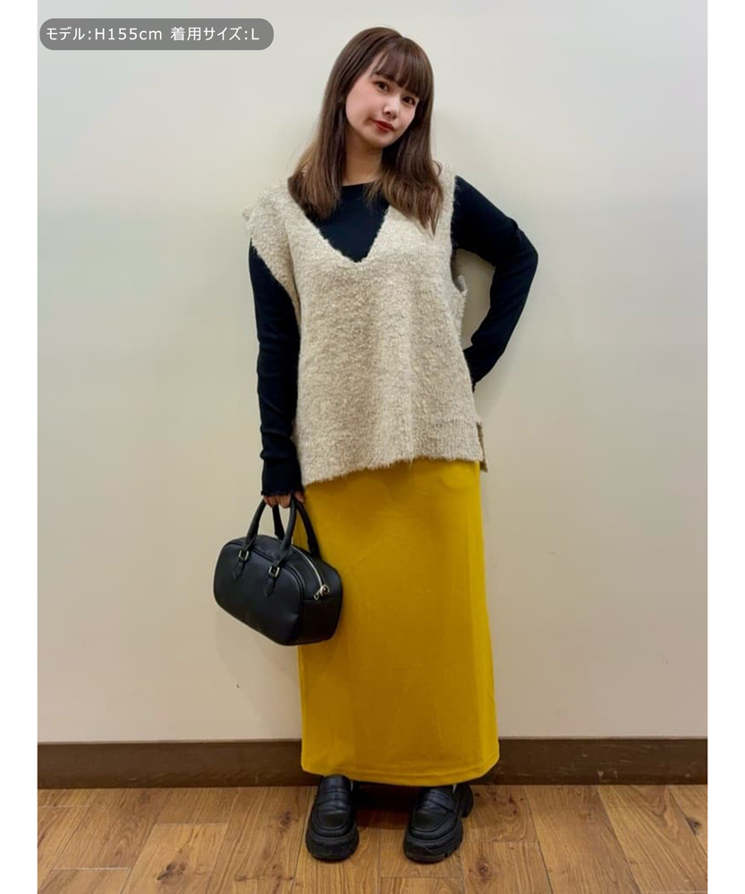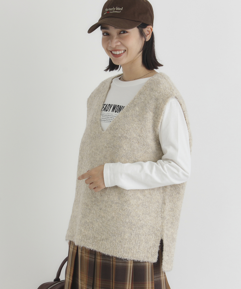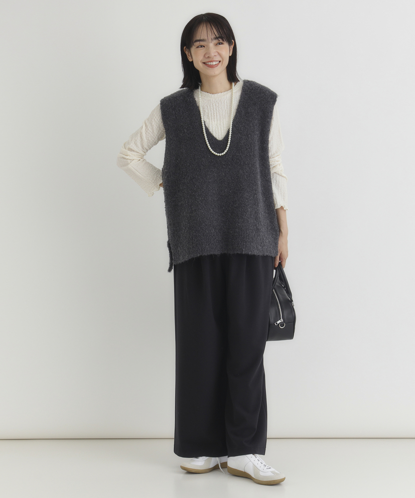 ブークレニットベストは、体型カバーができるコクーンシルエットが特徴です。