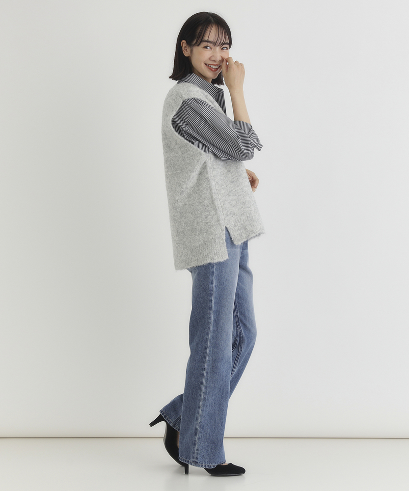 シャツやタートルネックと重ねて、レイヤードスタイルを楽しむのがオススメ。