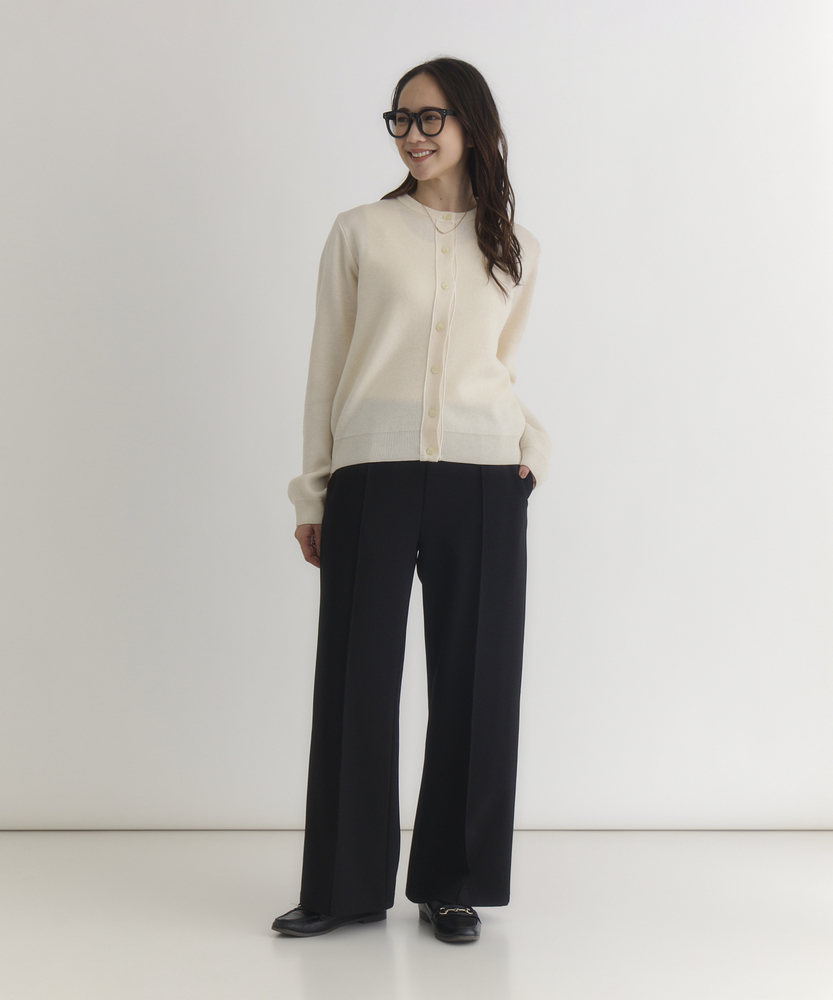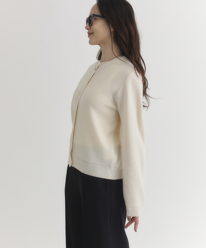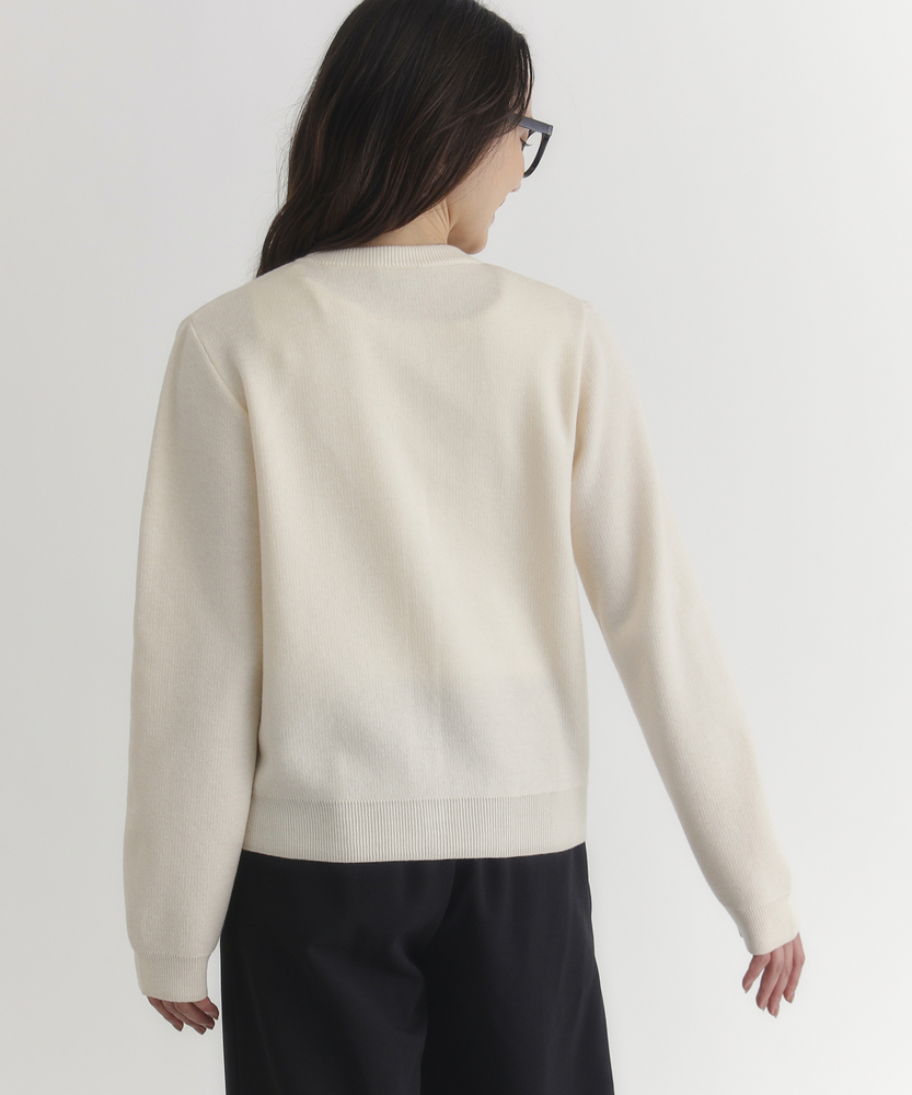 【仕様】クルーネックとショート丈のバランスで程よくモダンに整えた一着。リブのネック・裾・袖口と控えめな釦がクリーンな表情をつくり、前を閉めればきちんと感、開ければ抜け感のある着こなしに。日本製ならではの丁寧な仕上げが品格を高めます。【素材】 しなやかな編地は程よい厚みで型崩れしにくく、滑らかな肌触りが特徴。適度なハリで美しいシルエットを保ち、薄手のインナーとのレイヤードでもごわつかず着心地良好。デイリーに頼れる耐久性と上品さを両立しています。 【スタイリング】 通勤には白シャツをインして端正に、週末はワンピースやイージーボトムにさらりと羽織って抜け感を。モノトーンやベージュを軸に一点アクセントカラーを差すと都会的に映えます。小ぶりのバッグとローファーで洗練された印象に。