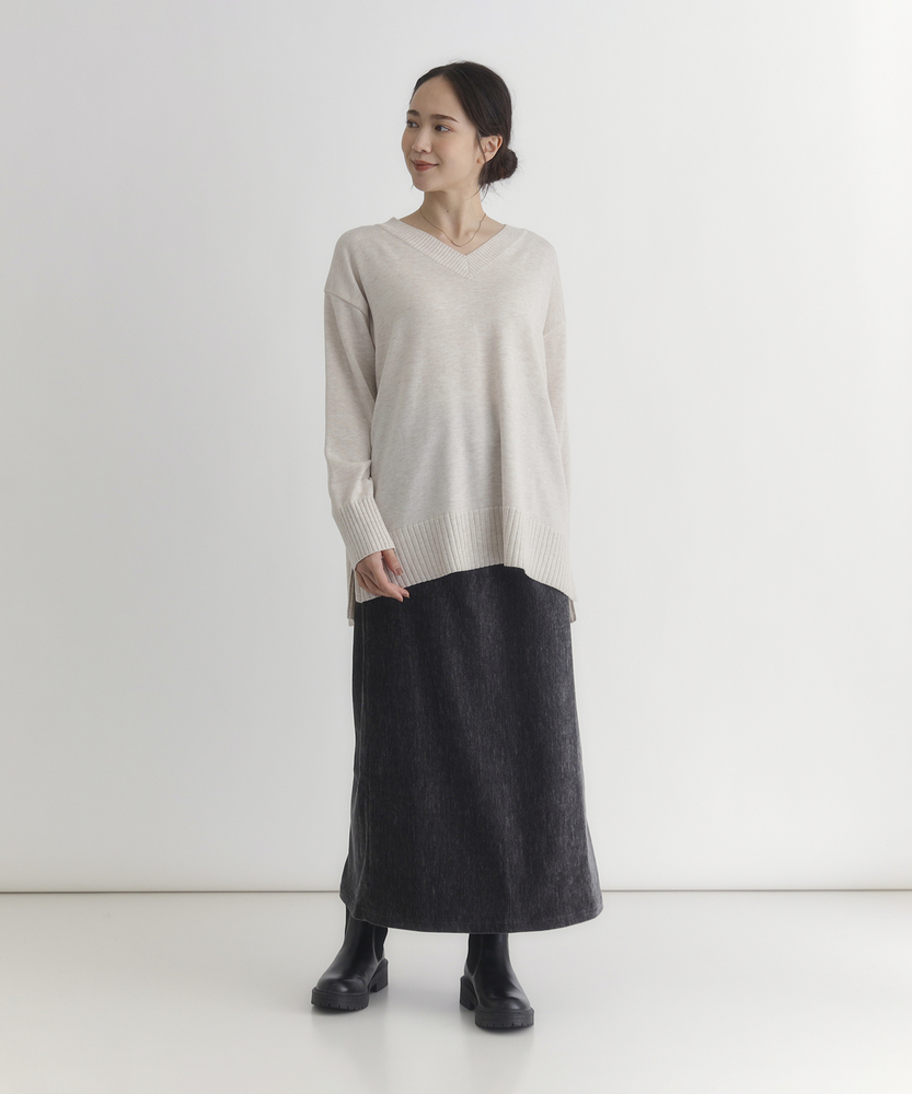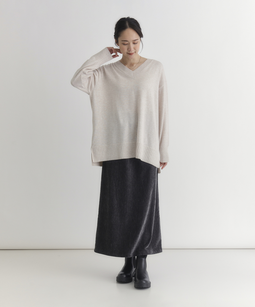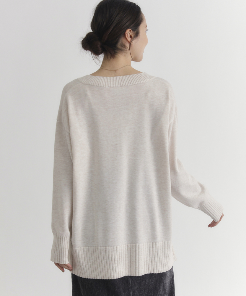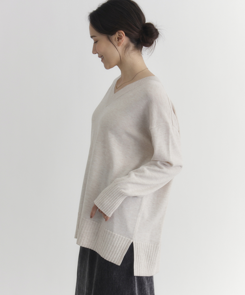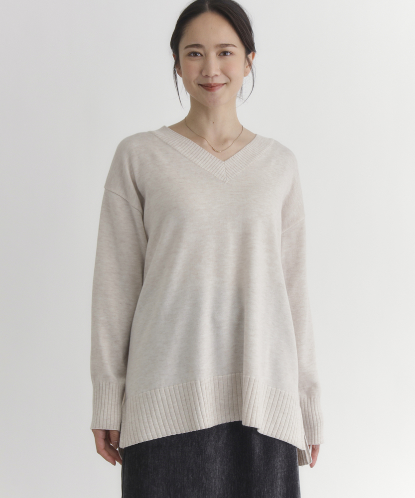 【仕様】シンプルでありながら洗練された印象のVネックセーター。レギュラーフィットのシルエットは、体型を選ばず様々なコーディネートにマッチします。アームホールがゆったりとしているため、重ね着をしてもストレスを感じません。【素材】 ポリエステルとアクリルをベースにした生地は、柔らかく滑らかな肌触りが魅力。通気性も良く、季節を問わず快適に着用できるため、日常使いにも最適です。しっかりとしたハリ感を併せ持ちつつ、柔らかさとのバランスが絶妙です。 【スタイリング】 コートやジャケットのインナーとしての着用もおすすめです。スカートやパンツと合わせて、カジュアルにもエレガントにも様変わり。シンプルながらも存在感があり、デイリーから特別なシーンまで幅広く活躍します。