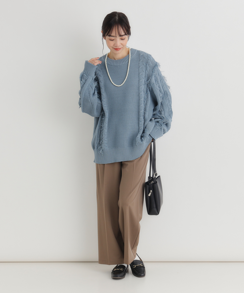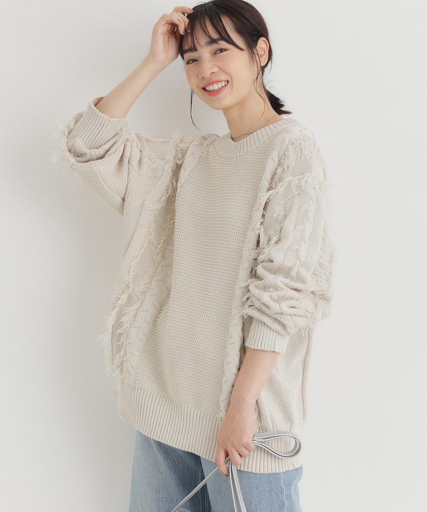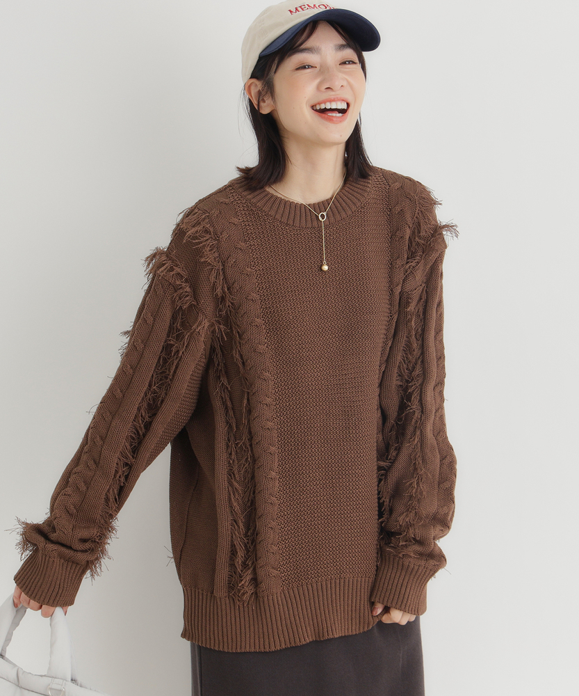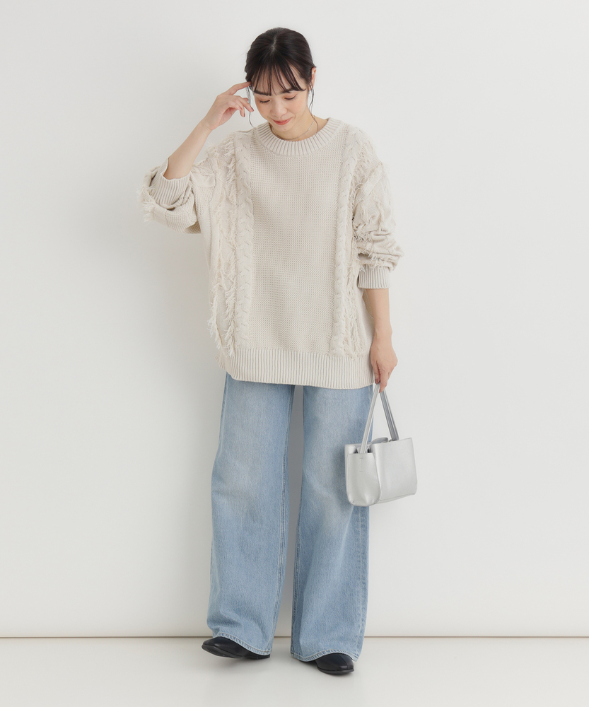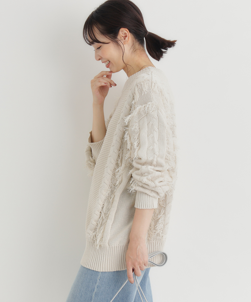 【仕様】ケーブルフリンジセーターは、洗練されたケーブル編みが特徴的で、トレンド感溢れる一着。フリンジのディテールが印象的で、動きのあるスタイルを演出します。ゆったりとしたシルエットが女性らしさを引き立て、カジュアルからフォーマルまで幅広くコーディネート可能です。【素材】 柔らかく、暖かいニット素材を使用しており、肌触りが良く快適な着心地を提供します。軽やかな風合いは、動くたびに自然なドレープを生み出し、シーズンを通して愛用できる優れたアイテムです。 【スタイリング】 デニムやスカートと合わせることで、カジュアルでありながらもエレガントさを感じさせるスタイリングが楽しめます。また、トレンチコートやダウンジャケットを羽織れば、寒い季節でもおしゃれに決まります。ブーツやスニーカーで遊び心をプラスするのもおすすめです。