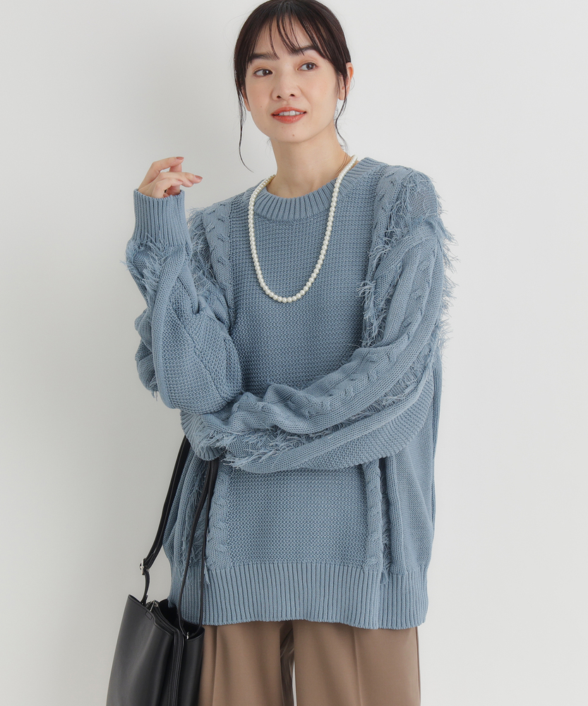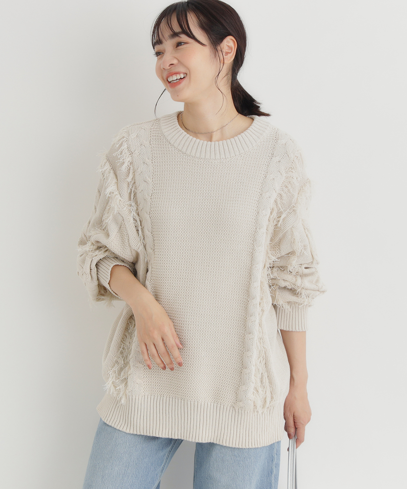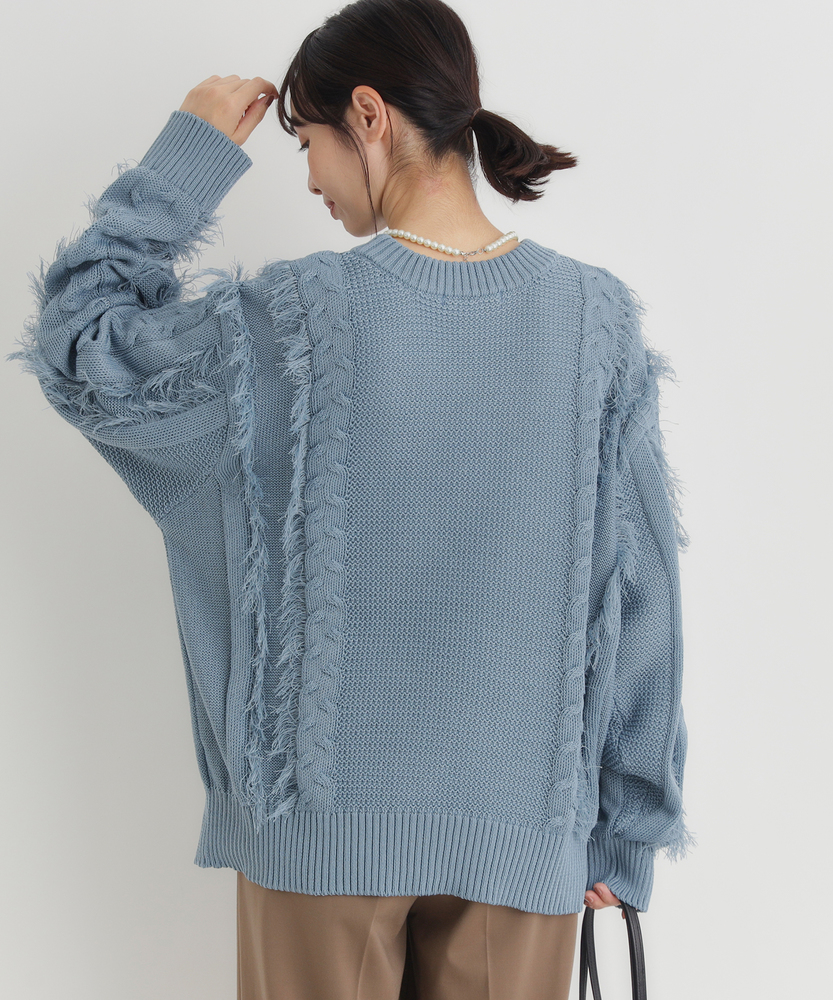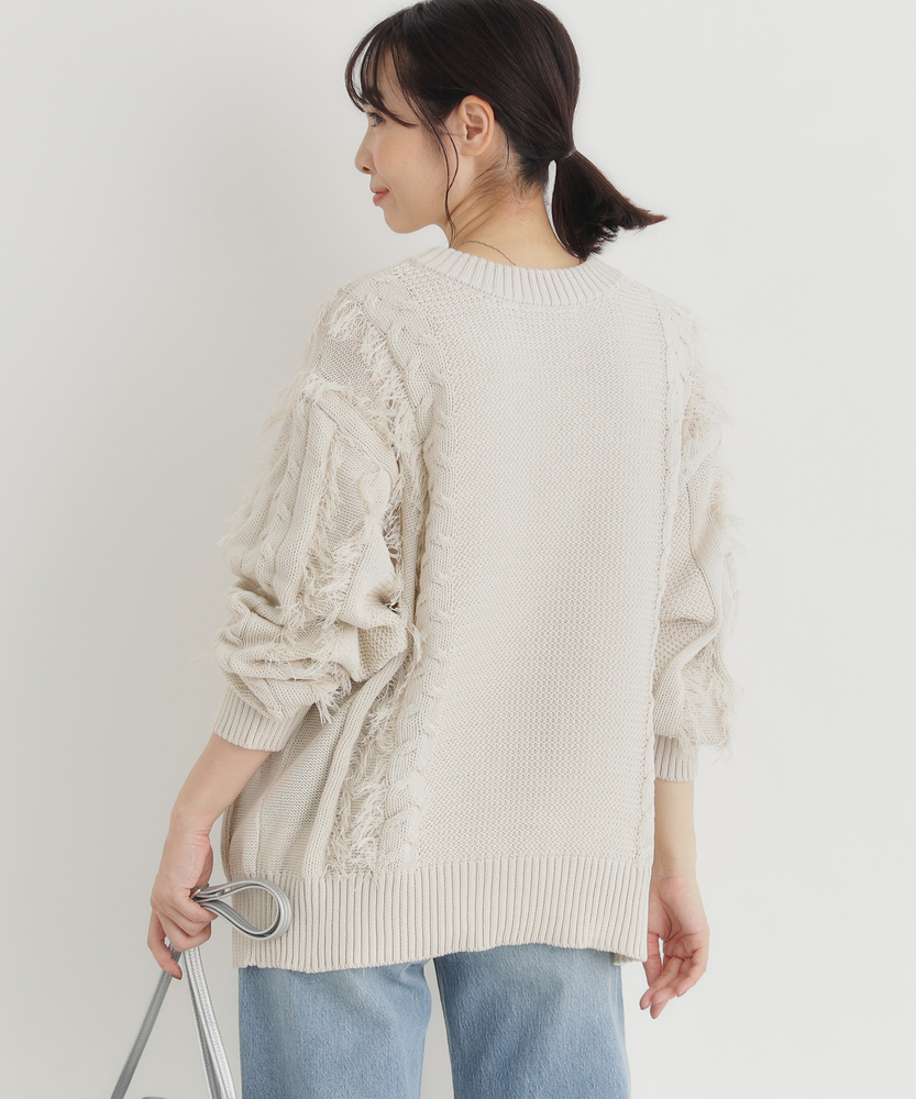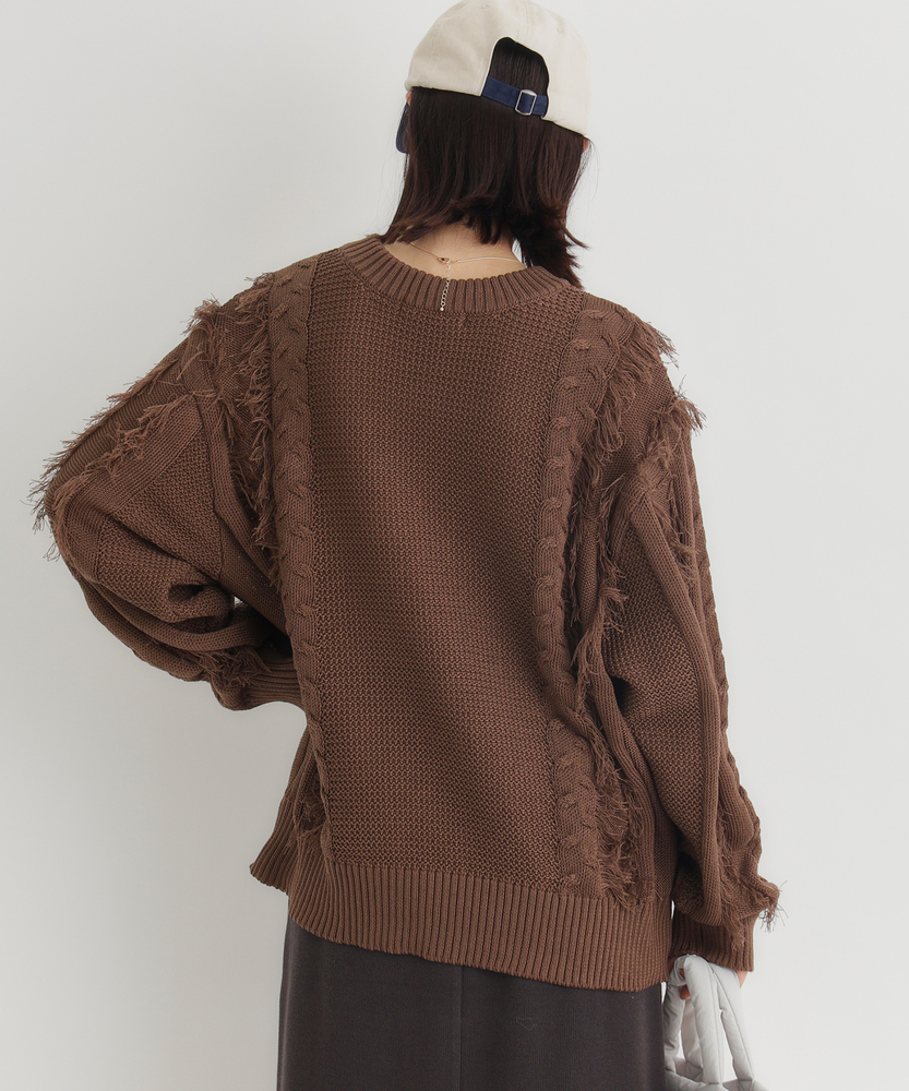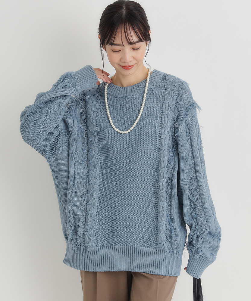【仕様】ケーブルフリンジセーターは、洗練されたケーブル編みが特徴的で、トレンド感溢れる一着。フリンジのディテールが印象的で、動きのあるスタイルを演出します。ゆったりとしたシルエットが女性らしさを引き立て、カジュアルからフォーマルまで幅広くコーディネート可能です。【素材】 柔らかく、暖かいニット素材を使用しており、肌触りが良く快適な着心地を提供します。軽やかな風合いは、動くたびに自然なドレープを生み出し、シーズンを通して愛用できる優れたアイテムです。 【スタイリング】 デニムやスカートと合わせることで、カジュアルでありながらもエレガントさを感じさせるスタイリングが楽しめます。また、トレンチコートやダウンジャケットを羽織れば、寒い季節でもおしゃれに決まります。ブーツやスニーカーで遊び心をプラスするのもおすすめです。