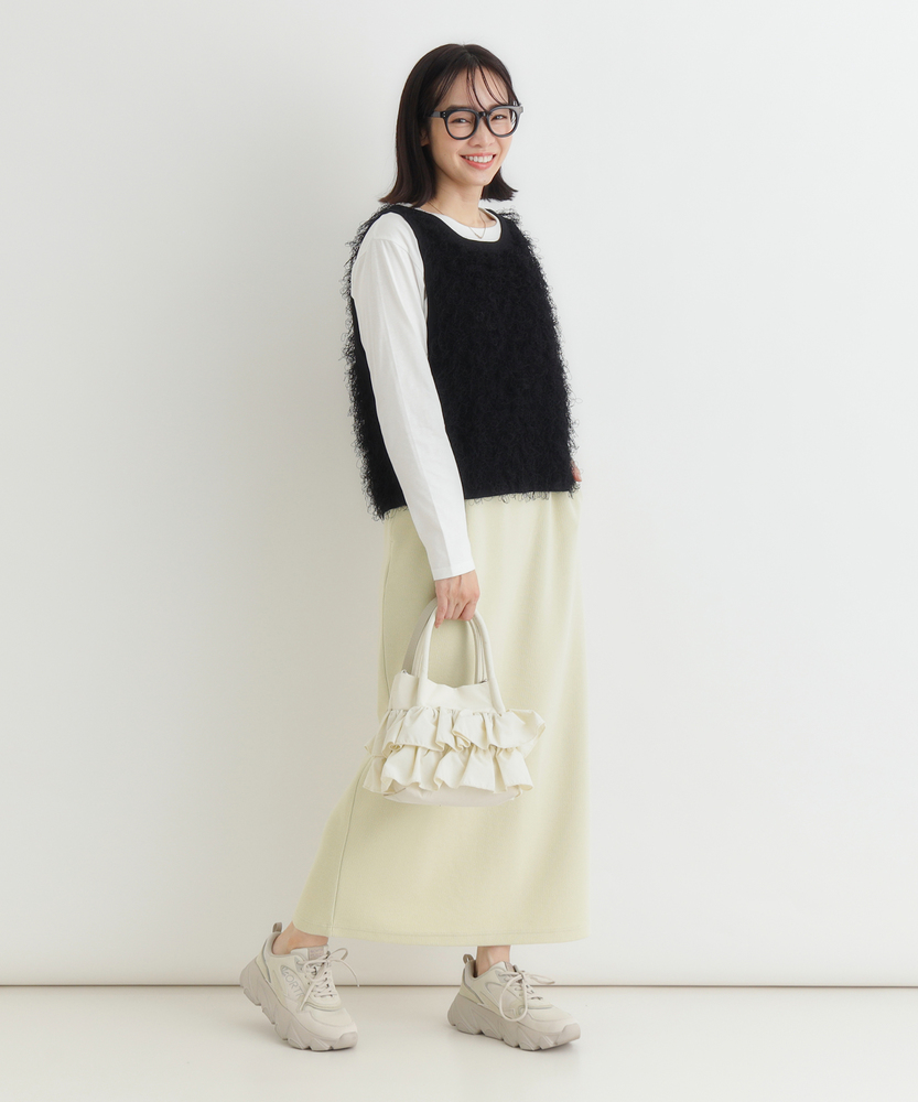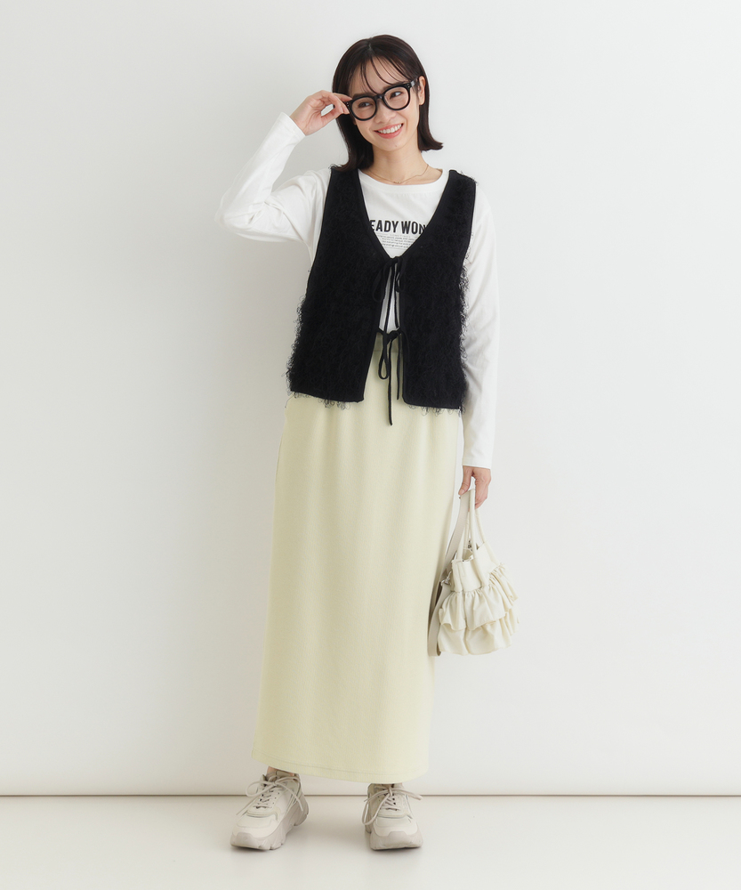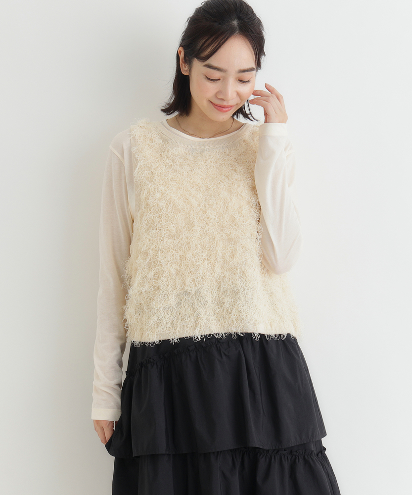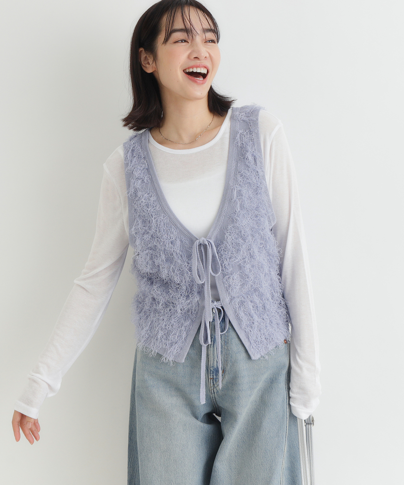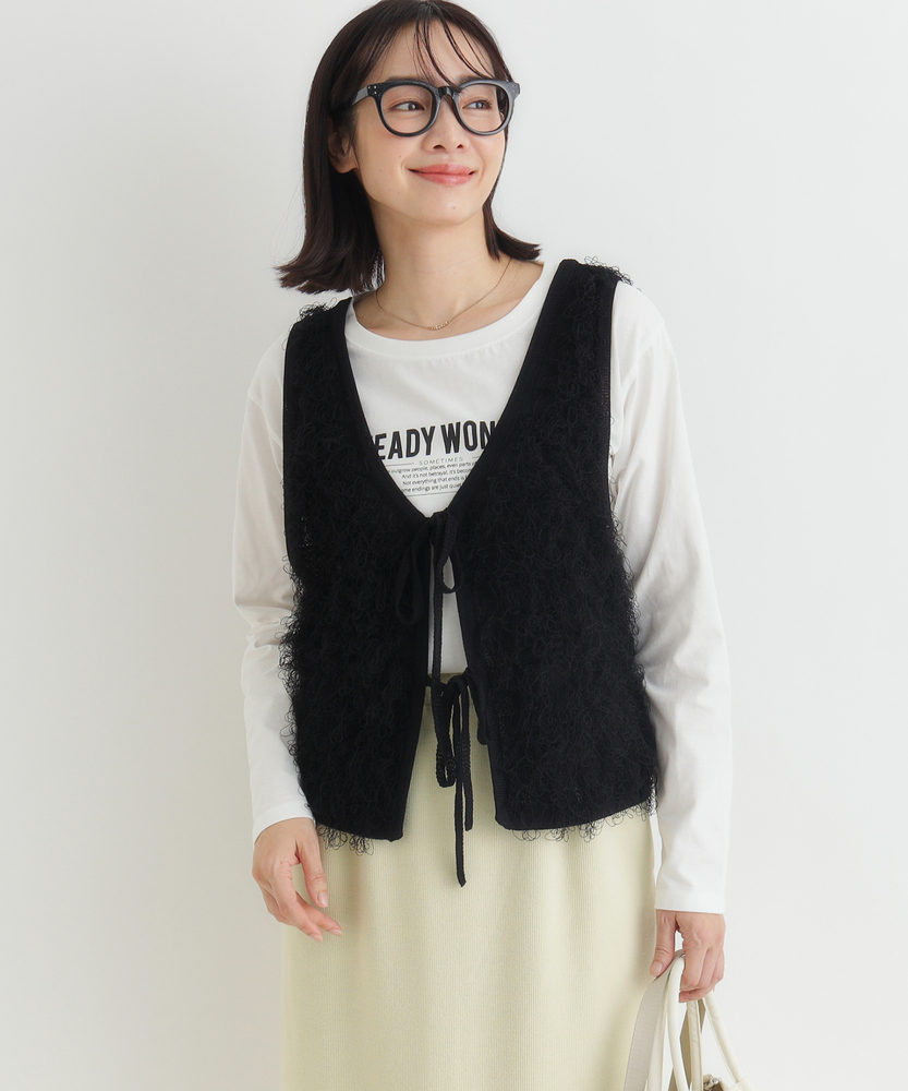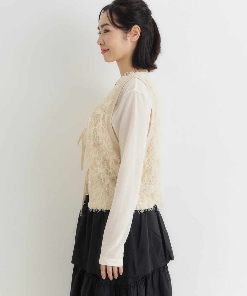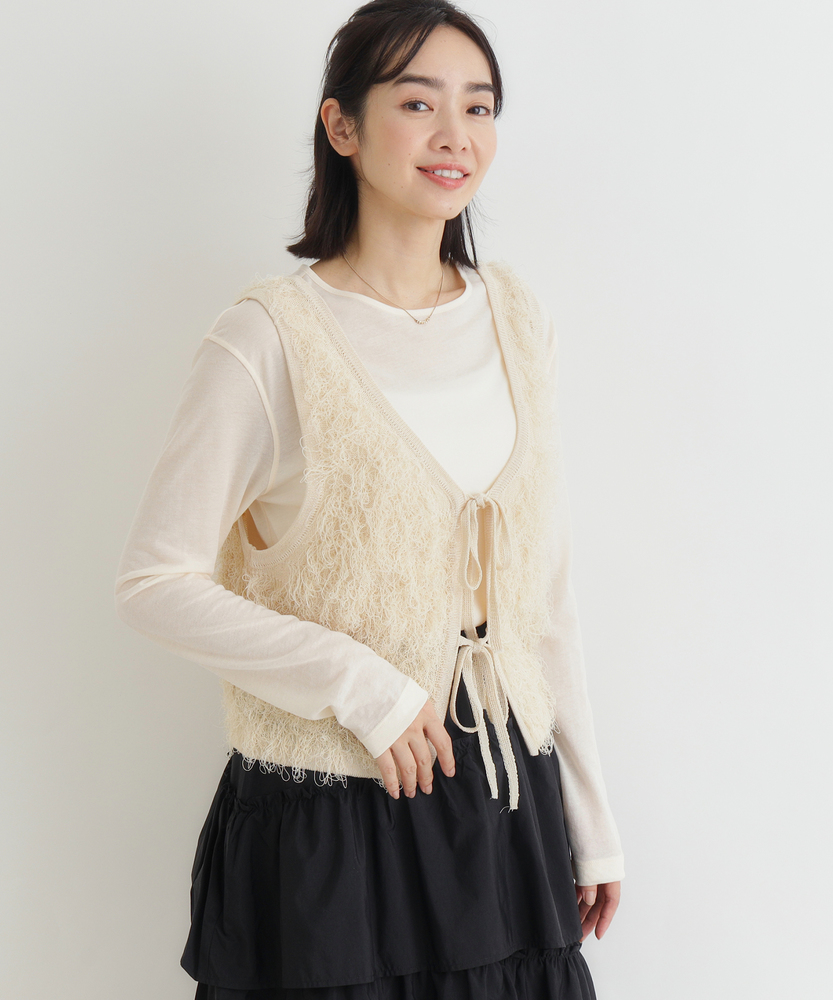「重ねるだけで、旬顔。」前後2WAYフリンジベスト。 着回し力抜群、大人のレイヤードアイテム。 程よい甘さが香る、洗練されたデザイン。 ■Point ・前後で使える2WAY仕様 リボンを前にしてフェミニンに、後ろにしてすっきりとしたプルオーバー風に。 その日の気分で表情を変えられます。 ・トレンド感溢れるフリンジ 立体感のあるシャギーな質感が、コーディネートに華やかさと奥行きをプラスします。 単調になりがちな装いのアクセントに。 ・スタイルアップを叶える丈感 コンパクトなショート丈が目線を上げ、脚長効果を演出。 どんなボトムスともバランス良く決まります。 ・大人の可愛げリボン フロントのダブルリボンがアクセント。 甘くなりすぎないデザインで、大人の抜け感を演出します。 ・シーズンレスなレイヤード Tシャツからタートルネックまで、インナーを変えれば長いシーズン活躍。 マンネリしがちなコーデの救世主に。 ・柔らかな着心地 素肌に触れてもチクチクしにくい、ふんわりとした優しい肌触り。 ストレスフリーにおしゃれを楽しめます。 【デザイン】 今季注目のフリンジ素材を使用した、存在感抜群のニットベストです。 最大の特徴は、前後どちらでも着用可能な2WAY仕様。 リボンをフロントにすればカーディガンライクなアクセントに、バックにすればシンプルなラウンドネックベストとして着用できます。 トレンドのショート丈は、ワンピースやハイウエストボトムとの相性が抜群で、スタイルアップ効果も期待できる優秀な一枚です。 【素材】 毛足の長いフリンジのようなジャガード編みが、空気を含んだようなふんわりとした表情を作り出します。 見た目のボリューム感に反して軽やかな着心地で、重ね着してもごわつきにくいのが特徴です。 肌あたりも優しく、季節の変わり目から本格的な冬のレイヤードまで幅広く対応する質感です。 【スタイリング】 シンプルなロンTやシャツに重ねるだけで、一気にトレンド感のあるスタイルが完成します。 デニムと合わせてカジュアルダウンさせるのはもちろん、ナロースカートやキャミワンピースの上に羽織れば、より女性らしい印象に。 ワントーンコーデの異素材アクセントとして取り入れるのも、こなれ感が出ておすすめです。
