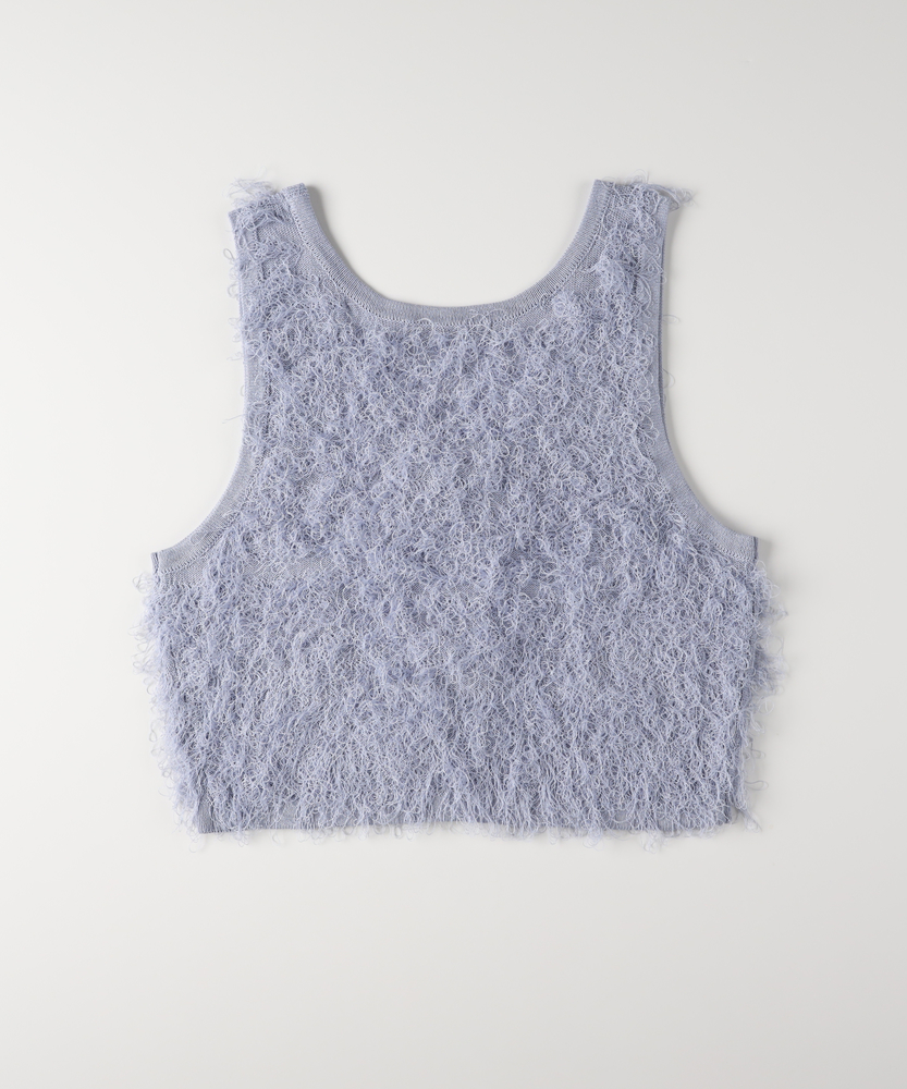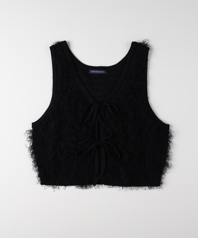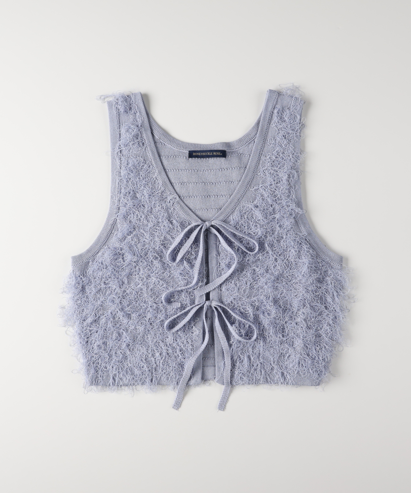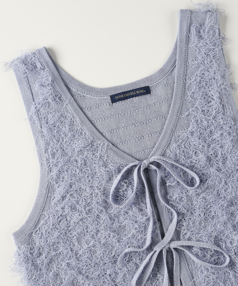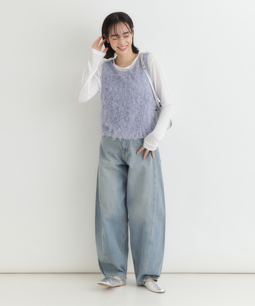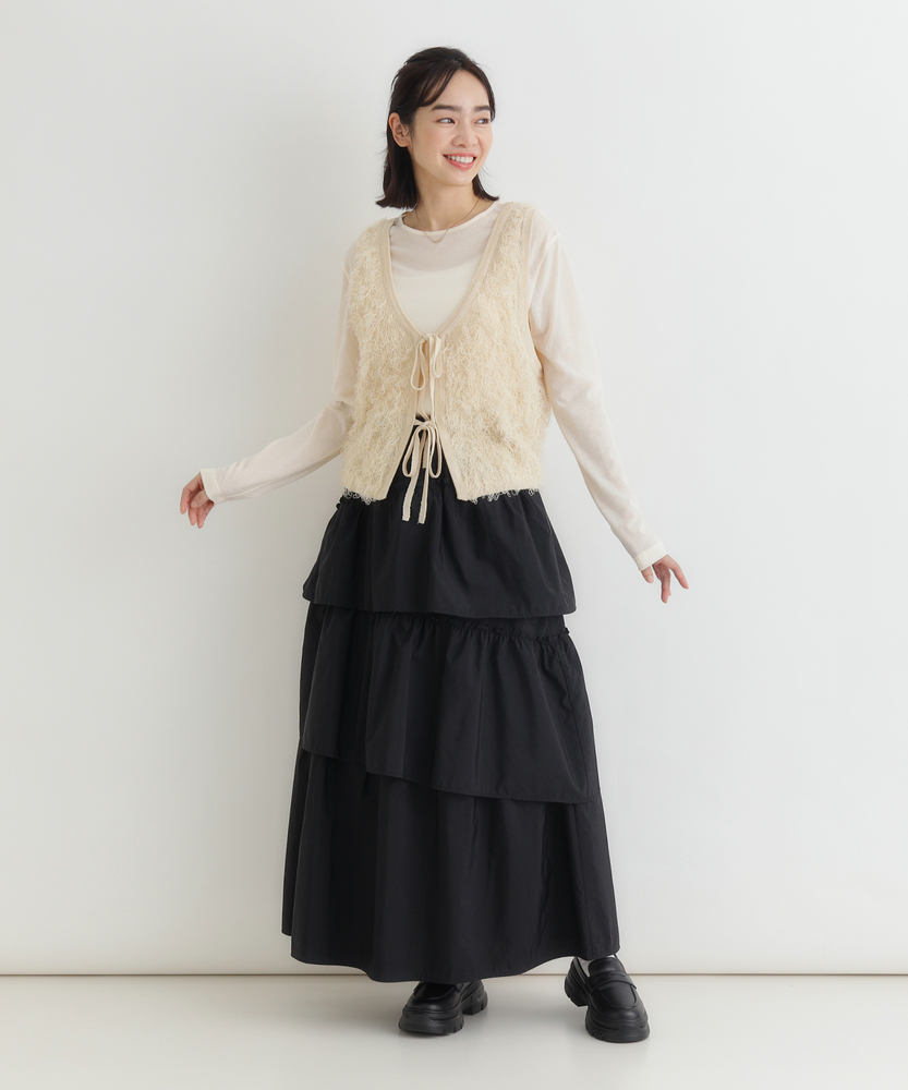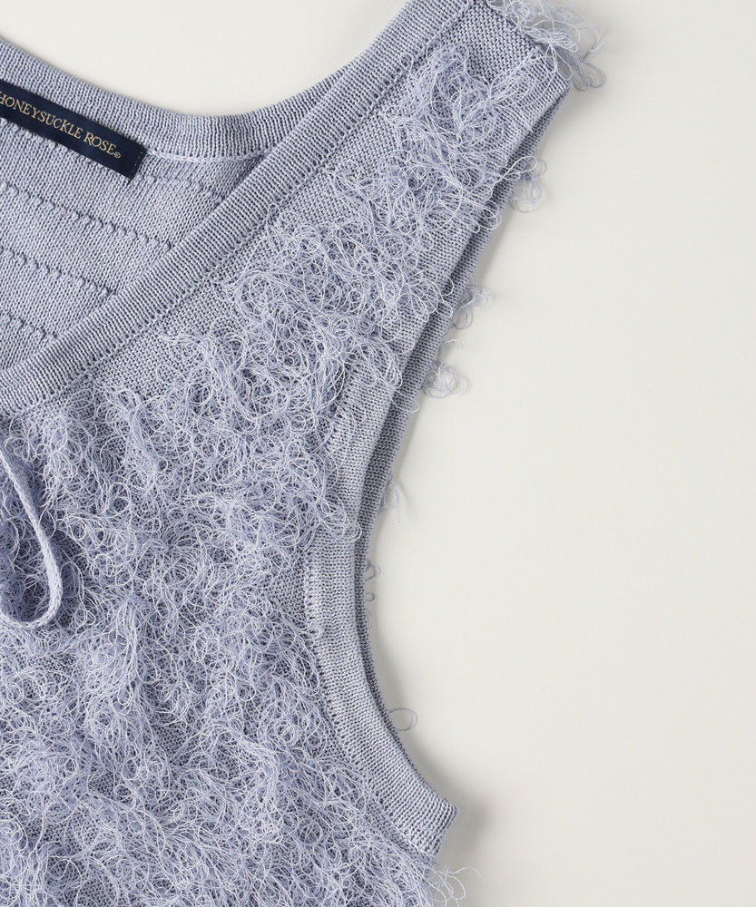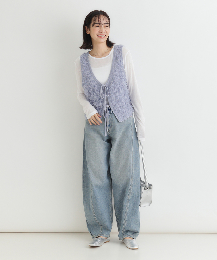 「重ねるだけで、旬顔。」前後2WAYフリンジベスト。 着回し力抜群、大人のレイヤードアイテム。 程よい甘さが香る、洗練されたデザイン。 ■Point ・前後で使える2WAY仕様 リボンを前にしてフェミニンに、後ろにしてすっきりとしたプルオーバー風に。 その日の気分で表情を変えられます。 ・トレンド感溢れるフリンジ 立体感のあるシャギーな質感が、コーディネートに華やかさと奥行きをプラスします。 単調になりがちな装いのアクセントに。 ・スタイルアップを叶える丈感 コンパクトなショート丈が目線を上げ、脚長効果を演出。 どんなボトムスともバランス良く決まります。 ・大人の可愛げリボン フロントのダブルリボンがアクセント。 甘くなりすぎないデザインで、大人の抜け感を演出します。 ・シーズンレスなレイヤード Tシャツからタートルネックまで、インナーを変えれば長いシーズン活躍。 マンネリしがちなコーデの救世主に。 ・柔らかな着心地 素肌に触れてもチクチクしにくい、ふんわりとした優しい肌触り。 ストレスフリーにおしゃれを楽しめます。 【デザイン】 今季注目のフリンジ素材を使用した、存在感抜群のニットベストです。 最大の特徴は、前後どちらでも着用可能な2WAY仕様。 リボンをフロントにすればカーディガンライクなアクセントに、バックにすればシンプルなラウンドネックベストとして着用できます。 トレンドのショート丈は、ワンピースやハイウエストボトムとの相性が抜群で、スタイルアップ効果も期待できる優秀な一枚です。 【素材】 毛足の長いフリンジのようなジャガード編みが、空気を含んだようなふんわりとした表情を作り出します。 見た目のボリューム感に反して軽やかな着心地で、重ね着してもごわつきにくいのが特徴です。 肌あたりも優しく、季節の変わり目から本格的な冬のレイヤードまで幅広く対応する質感です。 【スタイリング】 シンプルなロンTやシャツに重ねるだけで、一気にトレンド感のあるスタイルが完成します。 デニムと合わせてカジュアルダウンさせるのはもちろん、ナロースカートやキャミワンピースの上に羽織れば、より女性らしい印象に。 ワントーンコーデの異素材アクセントとして取り入れるのも、こなれ感が出ておすすめです。