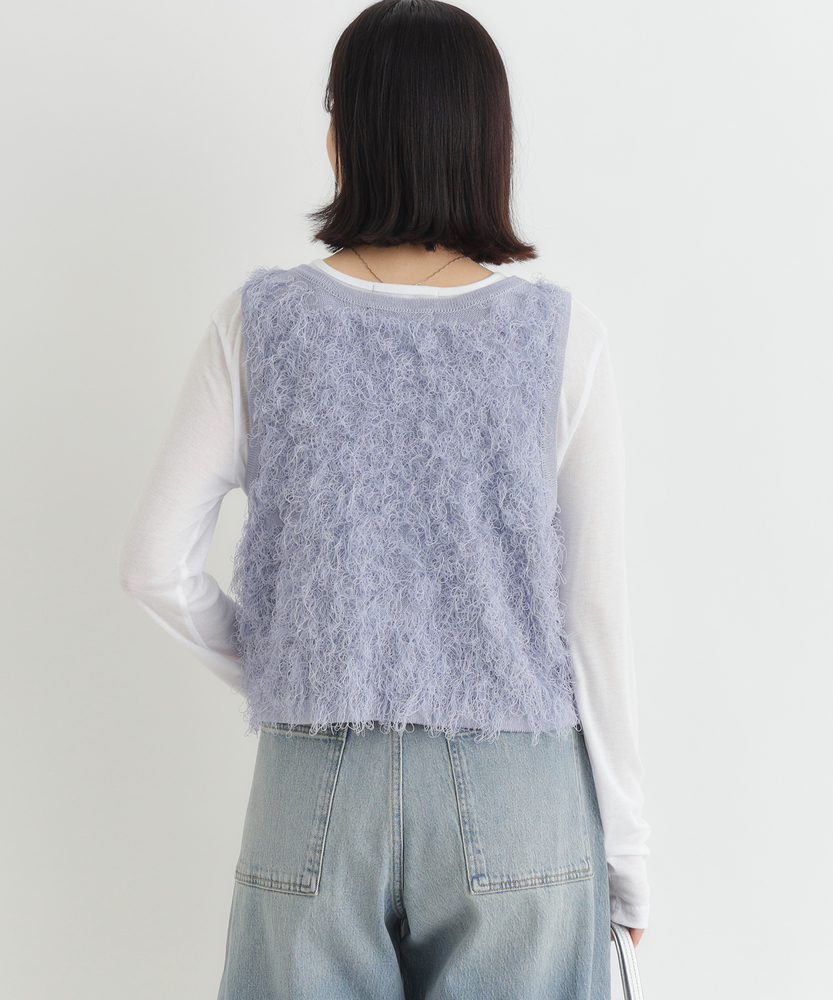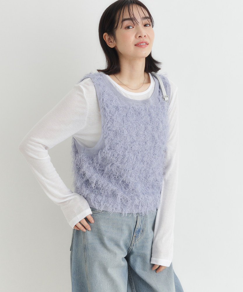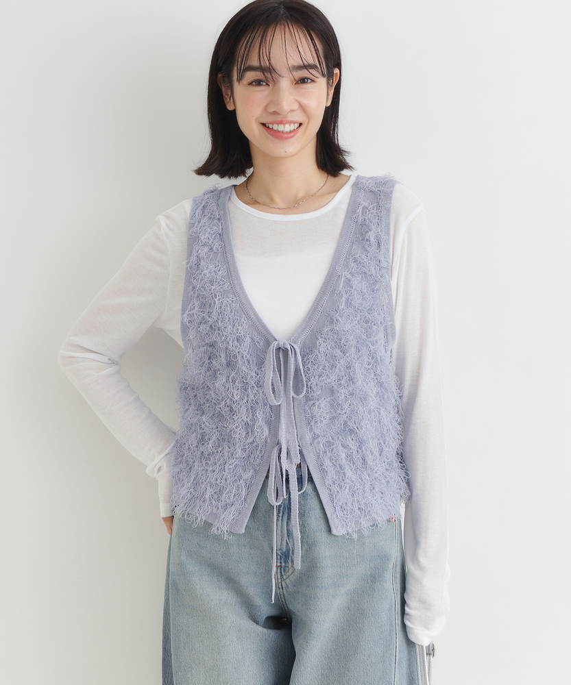 「重ねるだけで、旬顔。」前後2WAYフリンジベスト。着回し力抜群、大人のレイヤードアイテム。程よい甘さが香る、洗練されたデザイン。■Point・前後で使える2WAY仕様リボンを前にしてフェミニンに、後ろにしてすっきりとしたプルオーバー風に。その日の気分で表情を変えられます。・トレンド感溢れるフリンジ立体感のあるシャギーな質感が、コーディネートに華やかさと奥行きをプラスします。単調になりがちな装いのアクセントに。・スタイルアップを叶える丈感コンパクトなショート丈が目線を上げ、脚長効果を演出。どんなボトムスともバランス良く決まります。・大人の可愛げリボンフロントのダブルリボンがアクセント。甘くなりすぎないデザインで、大人の抜け感を演出します。・シーズンレスなレイヤードTシャツからタートルネックまで、インナーを変えれば長いシーズン活躍。マンネリしがちなコーデの救世主に。・柔らかな着心地素肌に触れてもチクチクしにくい、ふんわりとした優しい肌触り。ストレスフリーにおしゃれを楽しめます。【デザイン】今季注目のフリンジ素材を使用した、存在感抜群のニットベストです。最大の特徴は、前後どちらでも着用可能な2WAY仕様。リボンをフロントにすればカーディガンライクなアクセントに、バックにすればシンプルなラウンドネックベストとして着用できます。トレンドのショート丈は、ワンピースやハイウエストボトムとの相性が抜群で、スタイルアップ効果も期待できる優秀な一枚です。【素材】毛足の長いフリンジのようなジャガード編みが、空気を含んだようなふんわりとした表情を作り出します。見た目のボリューム感に反して軽やかな着心地で、重ね着してもごわつきにくいのが特徴です。肌あたりも優しく、季節の変わり目から本格的な冬のレイヤードまで幅広く対応する質感です。【スタイリング】シンプルなロンTやシャツに重ねるだけで、一気にトレンド感のあるスタイルが完成します。デニムと合わせてカジュアルダウンさせるのはもちろん、ナロースカートやキャミワンピースの上に羽織れば、より女性らしい印象に。ワントーンコーデの異素材アクセントとして取り入れるのも、こなれ感が出ておすすめです。