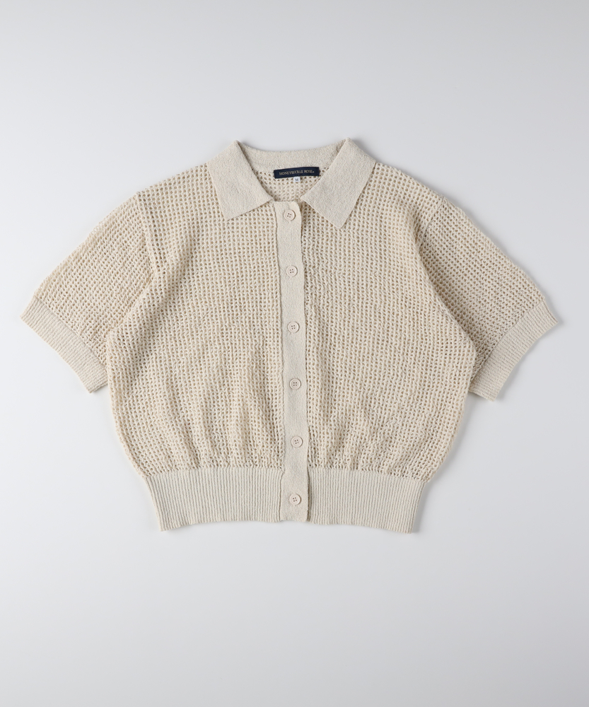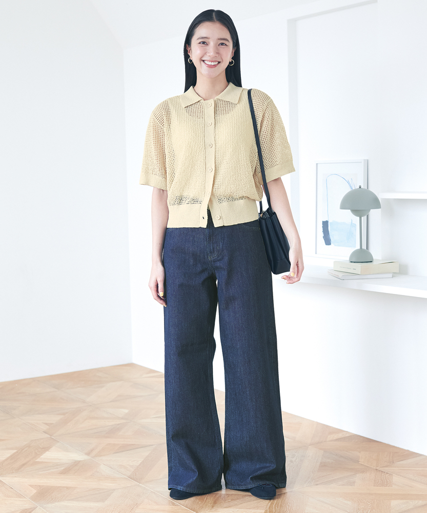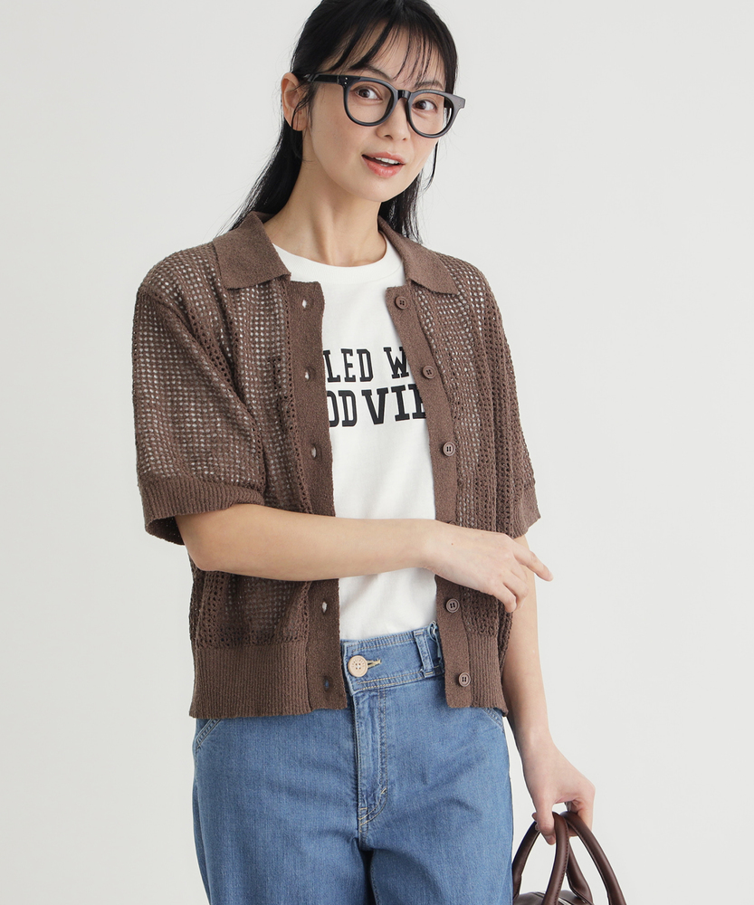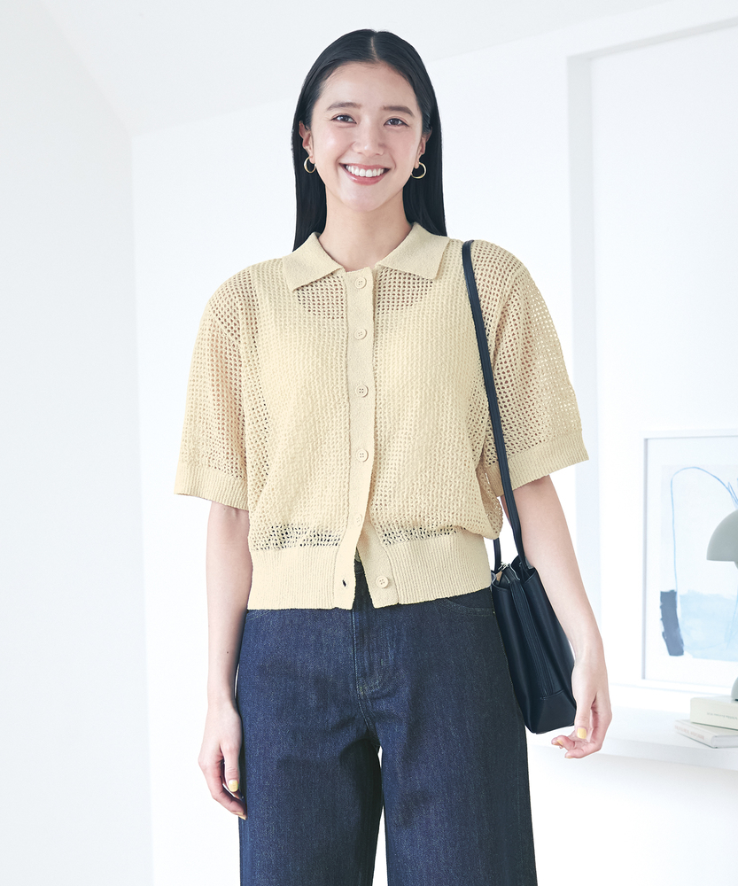 涼しげな透け感で、大人の抜け感を演出。羽織りとしても使える、万能ポロセーター。着るだけで決まる、旬なレイヤードスタイル。■Point・トレンド感漂うメッシュ編み涼しげな透け感が魅力のデザイン。インナー次第で様々な表情に変化。旬のレイヤードスタイルを楽しめます。・顔周りを彩る上品なポロ襟カジュアルすぎない、大人のきちんと感。顔周りをスッキリと見せてくれます。日常の着こなしに程よいアクセントを。・着回し広がるフロントボタンボタンを留めてプルオーバーとして。サッと羽織れるカーディガンとしても。気温の変化に合わせて使い分け可能。・スタイルアップ叶うコンパクト丈ハイウエストボトムスと好相性。太めの裾リブがメリハリをプラス。自然な脚長効果を叶えてくれます。・体型をカバーするゆったり設計程よくゆとりのある身幅と袖丈。気になる二の腕やボディラインをカバー。リラクシーで快適な着心地を実現します。・デイリーに使えるベーシック色着回しやすい落ち着いたカラー展開。手持ちのアイテムともスッと馴染みます。大人のワードローブの頼れる味方に。【仕様】涼しげなメッシュ編みと、クラシカルなポロ襟の組み合わせが新鮮なセーターです。ゆとりを持たせた身幅に対し、裾と袖口のリブがシルエットにメリハリをプラス。コンパクトな着丈はハイウエストボトムスと相性が良く、自然な脚長効果を叶えます。フロントボタンを開ければ羽織りとしても着用できる便利な仕様です。【素材】軽やかな透け感が特徴のメッシュ編みで、見た目にも涼しげな印象を与えてくれます。重ね着してもごわつきにくい、柔らかな風合いが魅力。季節の変わり目から、夏の冷房対策まで快適に着用いただけます。合わせるインナー次第で、様々な表情の着こなしを楽しめるデイリーユースにぴったりな素材感です。【スタイリング】キャミソールやタンクトップに重ねるだけで、こなれた大人のレイヤードスタイルが完成します。ハイウエストのワイドパンツやデニムと合わせれば、バランスの良いスタイルアップコーデに。ボタンを開けて、ワンピースの上からサッと羽織るアレンジもおすすめ。オンオフ問わず、幅広いシーンで活躍する一枚です。