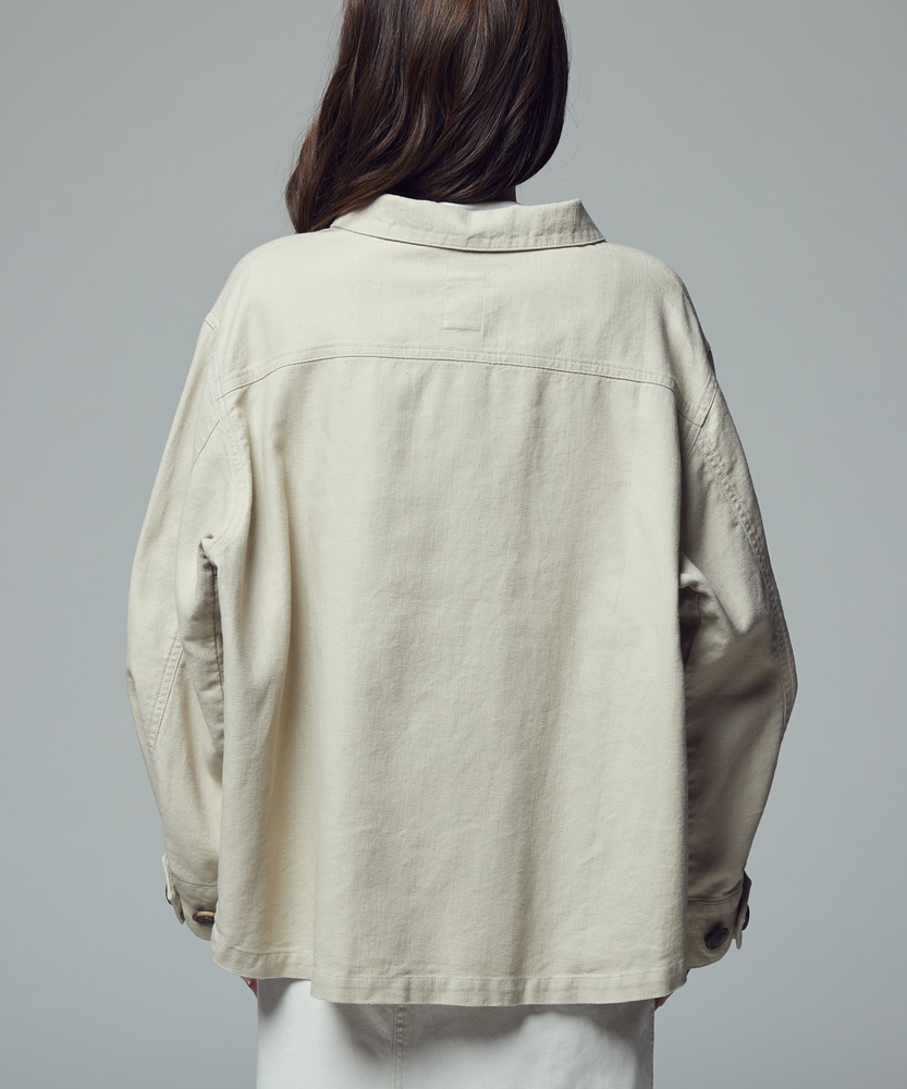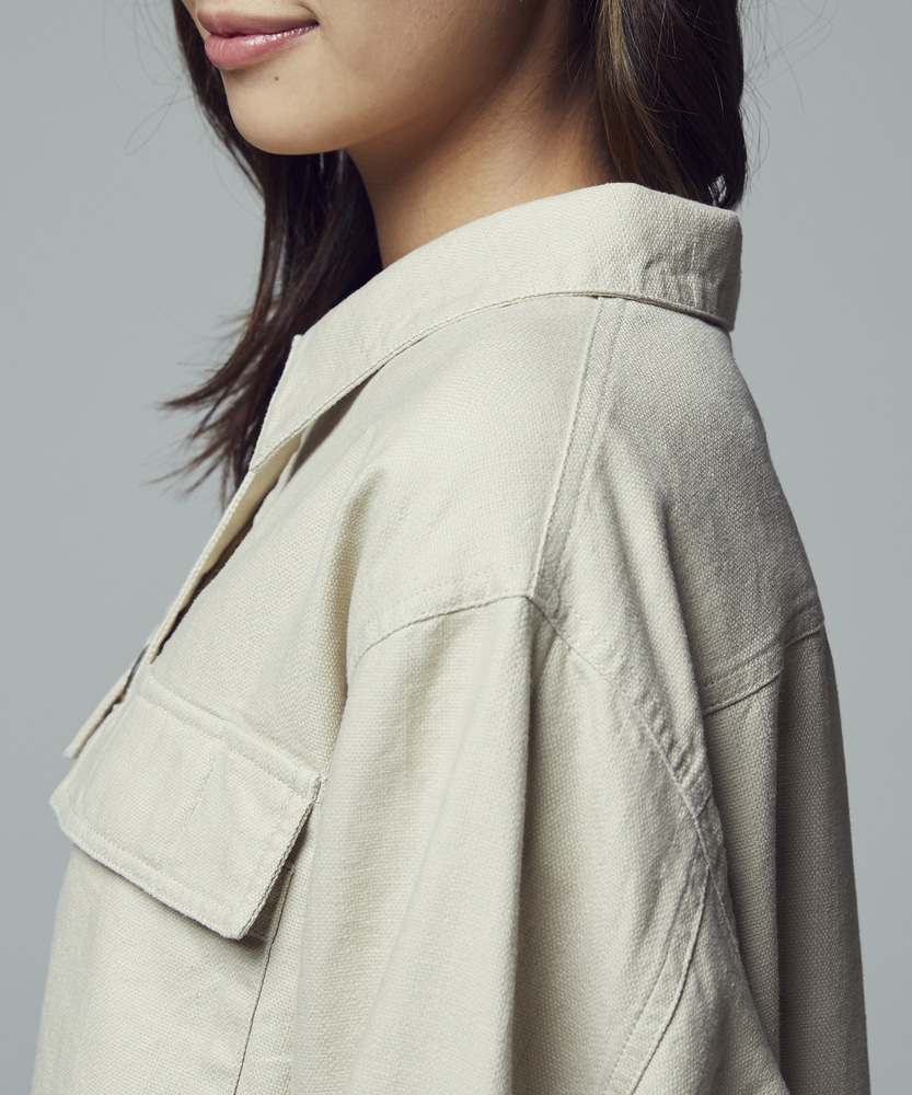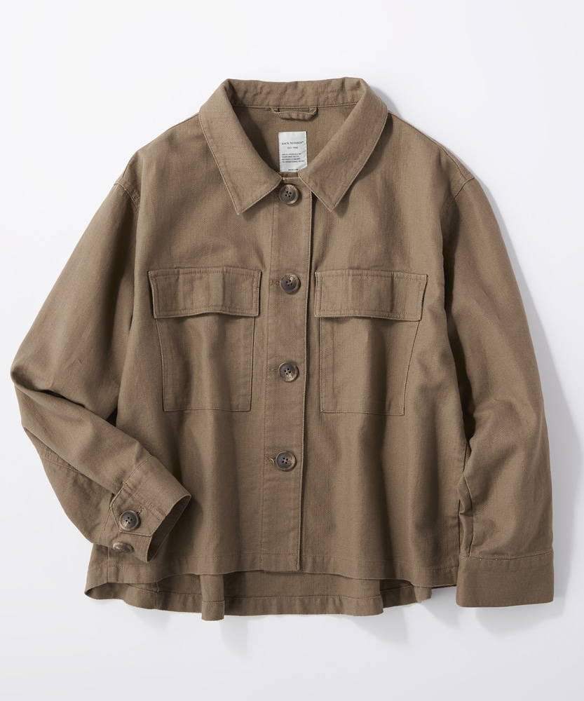 ライトオン オリジナルブランド BACK NUMBER(バックナンバー)のワークジャケット。プリペラ織という、少し凹凸のある独特な織り方の麻混生地を使った清涼感のあるワークジャケットです。ゆったりとした肩幅と身幅に対して、やや短めにした着丈のバランスが絶妙な仕上がり。アームから裾までハギを入れて立体的なルーズシルエットにしています。大き目のエリやパッチ&フラップの胸ポケットのデザインが女性らしい雰囲気を醸し出します。スリムからワイドまで様々なシルエットに合わせやすく、スカートにもワンピースの羽織りとしても活躍しそう。※シャリ感がありながら、硬くない素材感です。