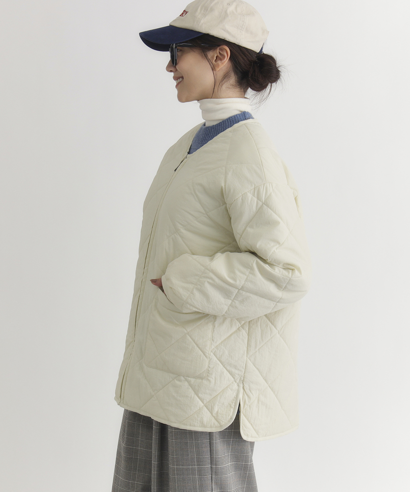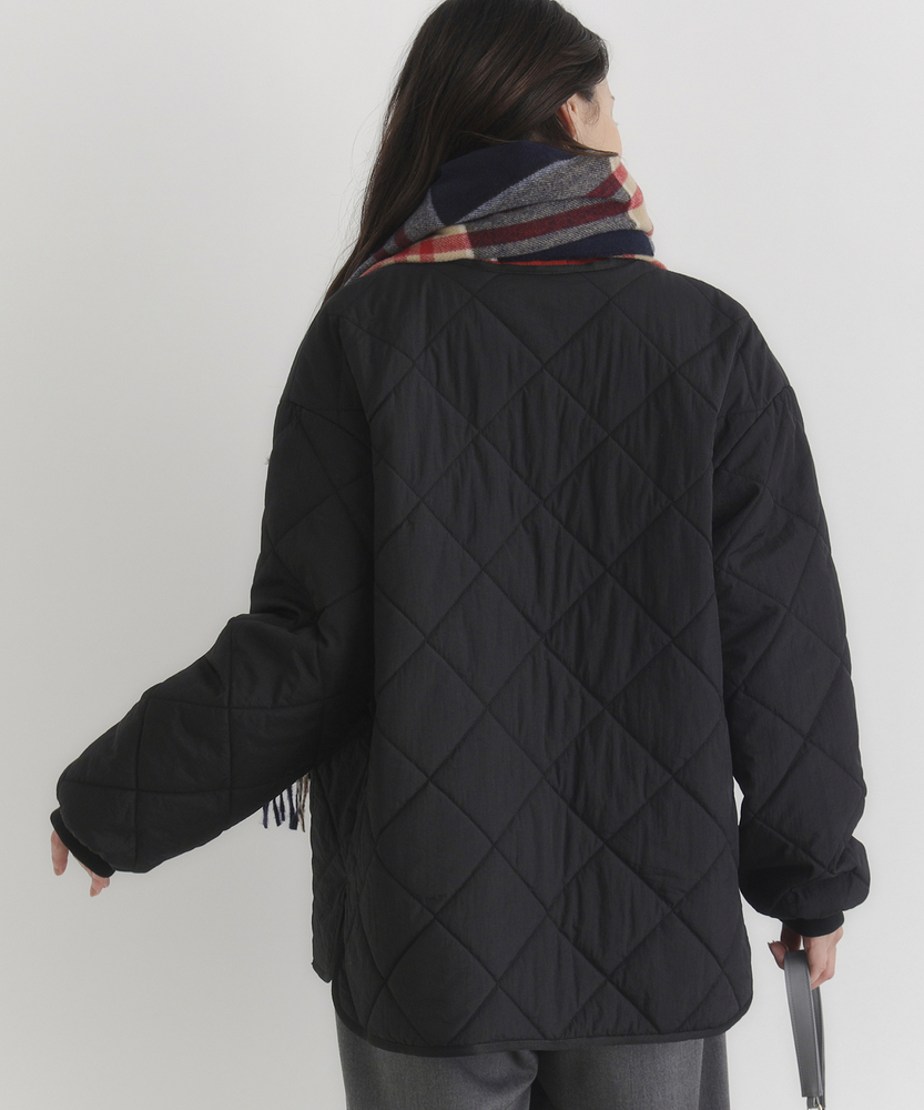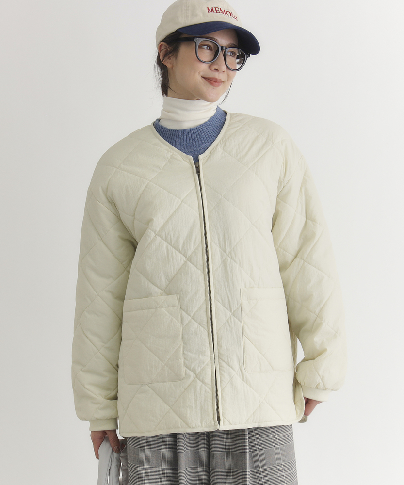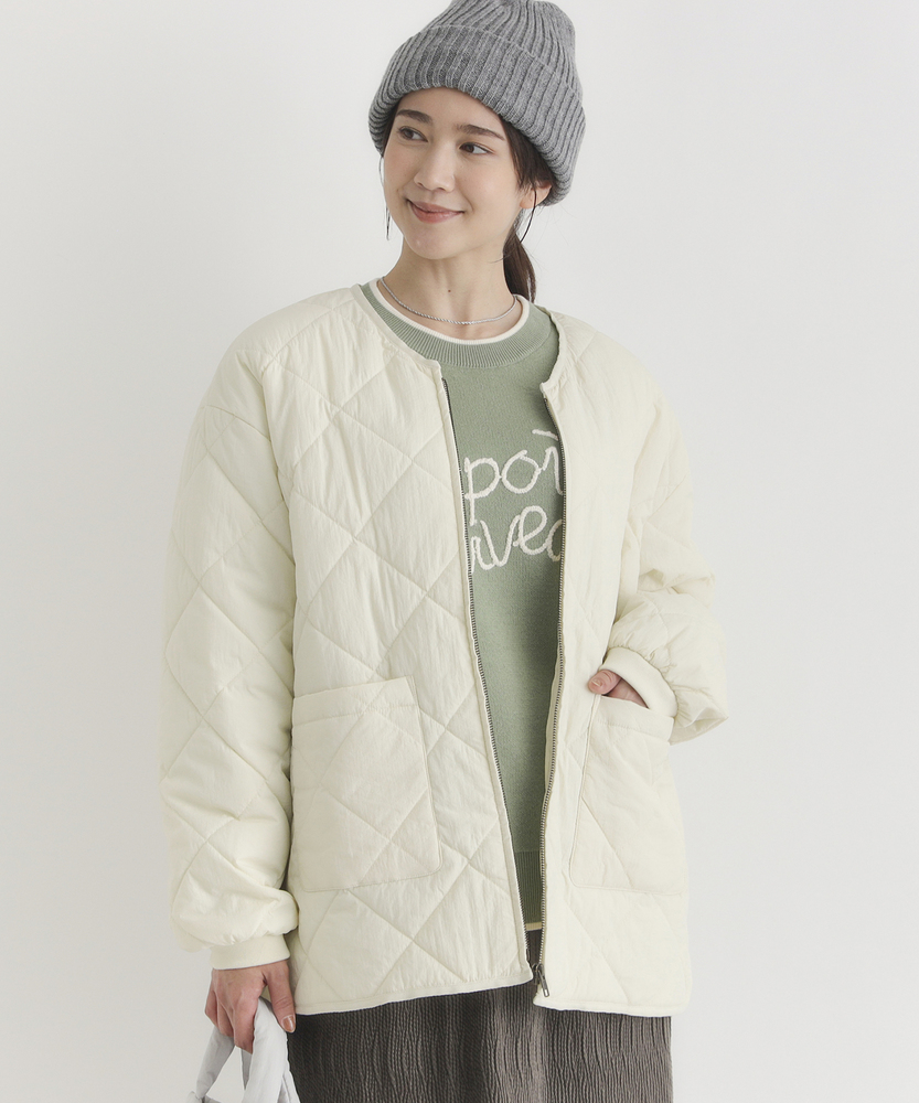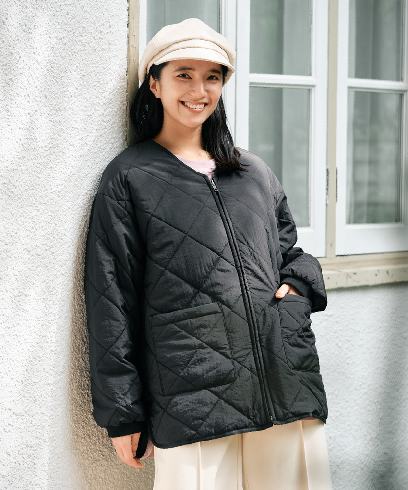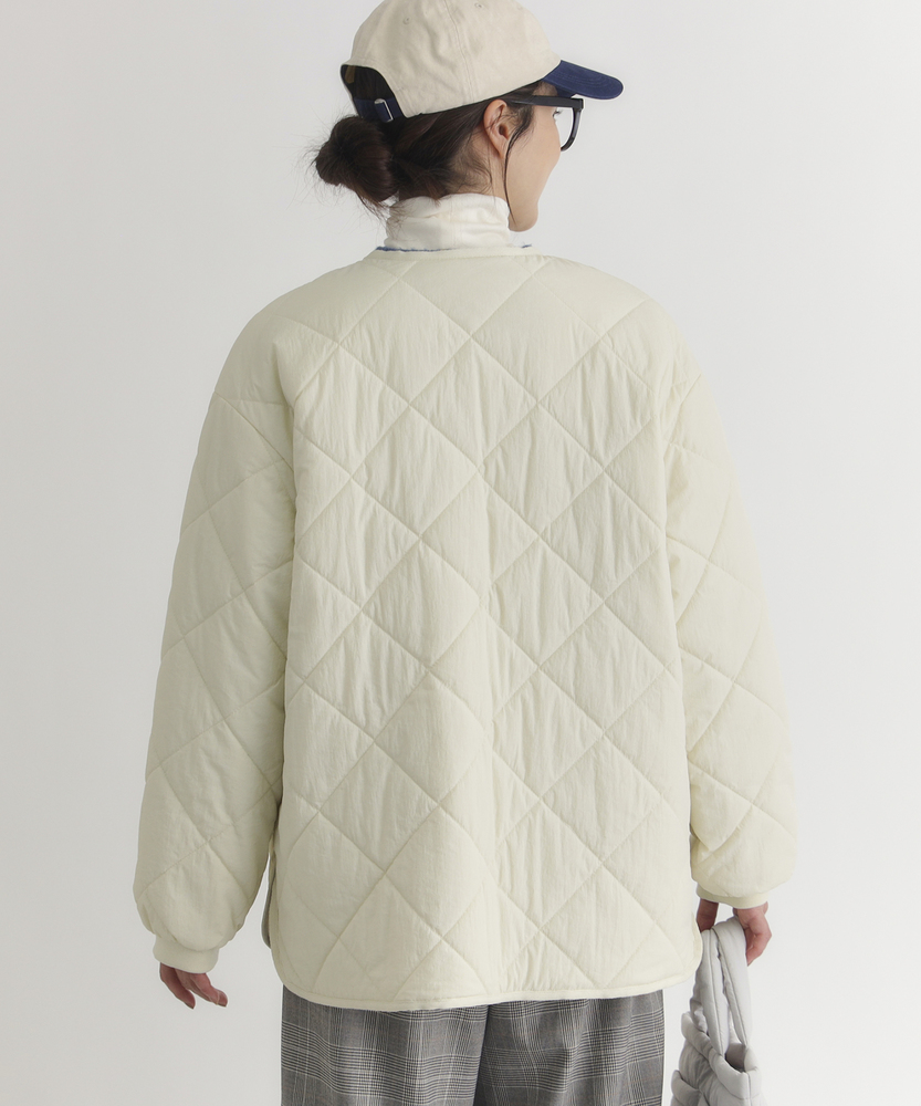 お尻にかかるくらいの着丈で気になる部分もカバー。とにかく軽量で快適な着心地。薄中綿素材で長いシーズン使える便利なアウター。【仕様】ベーシックな中綿入りキルティングジャケットは、シンプルかつコーディネートしやすいデザインが特徴。ややゆったりしたシルエットが動きやすさを提供し、フロントの大きめなポケットがアクセントに。どんなスタイルにも合わせやすく、デイリー使いに最適です。【素材】 100%ポリエステル製のため、軽量でありながら保温性にも優れています。肌触りがよく、ストレスなく着用できるため、春先や秋のはおりにもぴったり。普段使いからお出かけまで、幅広いシーンで活躍するアイテムです。 【スタイリング】 カジュアルなTシャツやタートルネックと合わせて、リラックスしたスタイルを楽しむのがオススメ。スキニーパンツやワイドパンツとの相性も良く、レイヤードスタイルでも活躍。スニーカーやブーツで足元をまとめると、クリーン感が引き立って、スタイリッシュな印象になります。