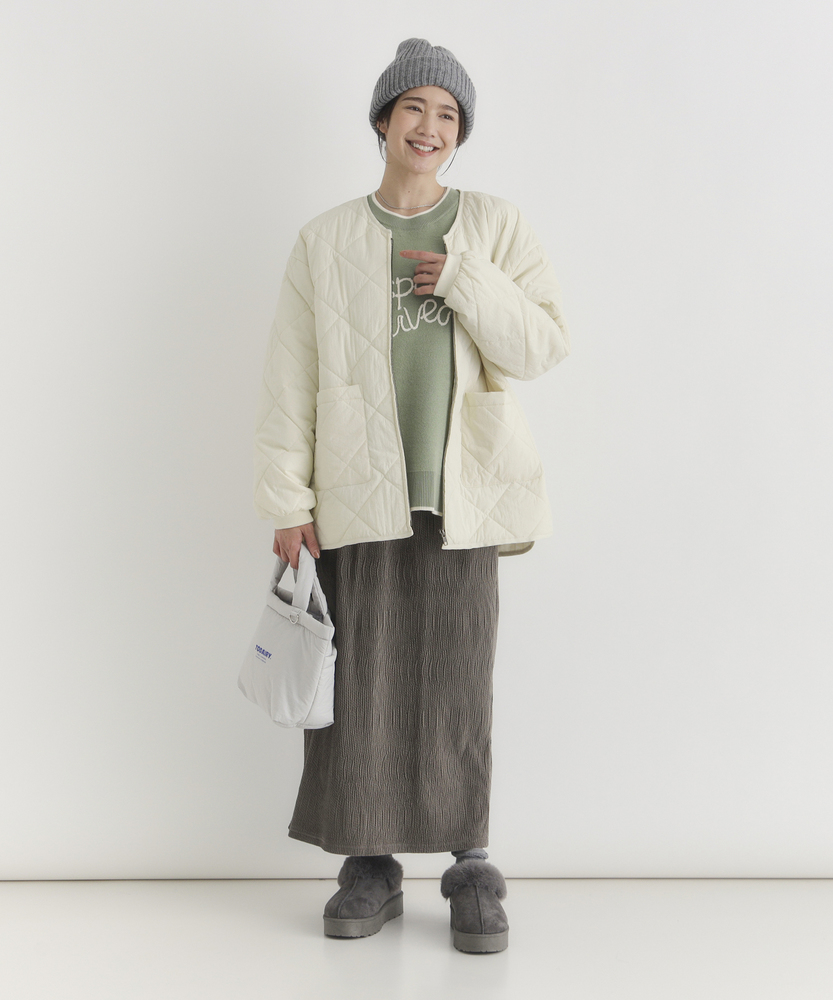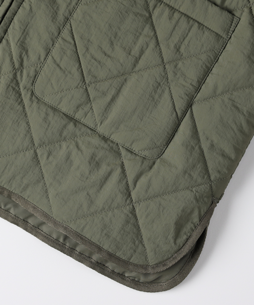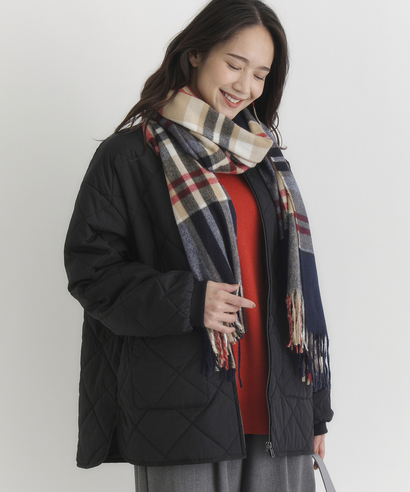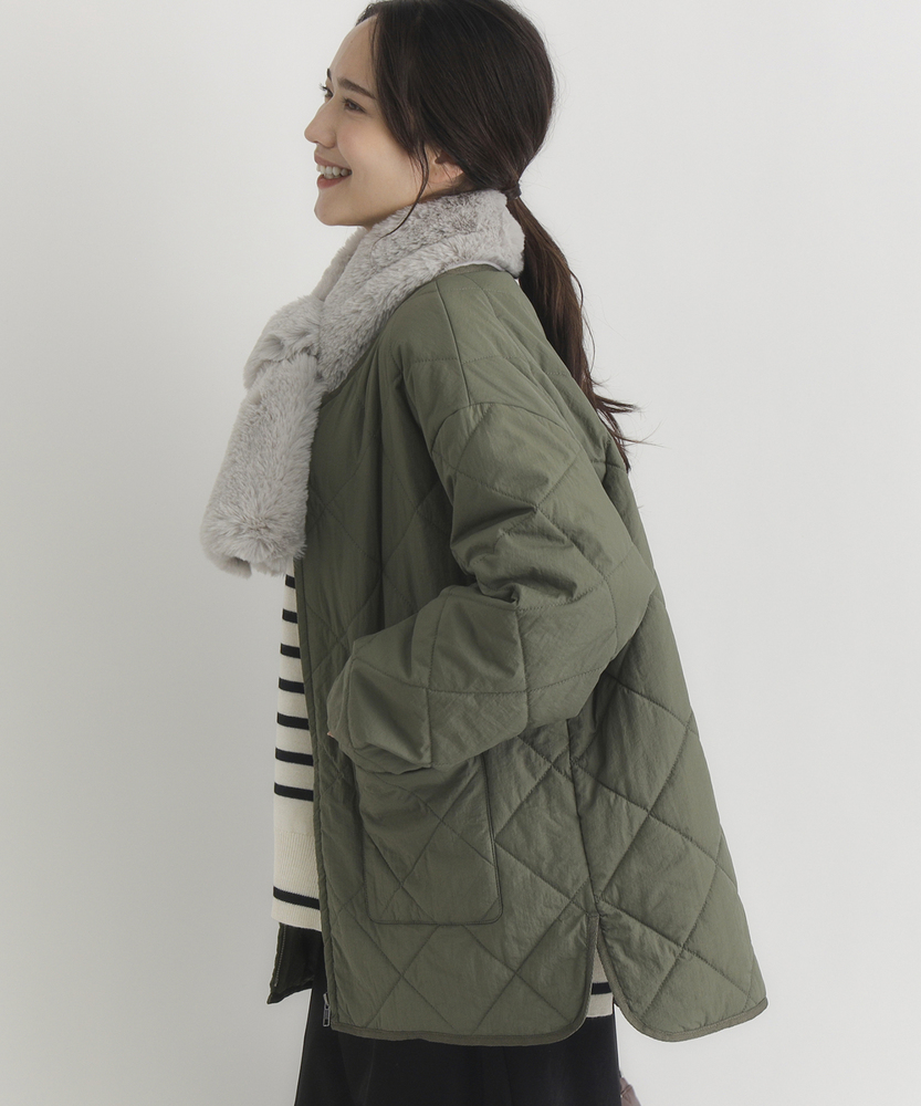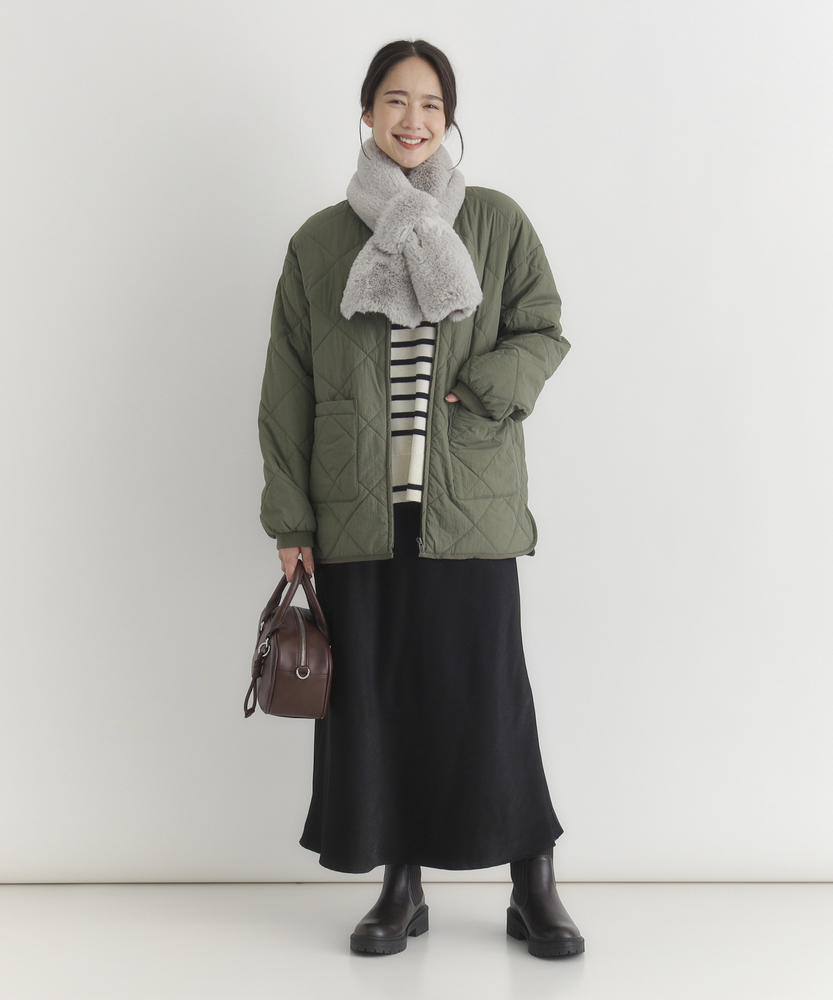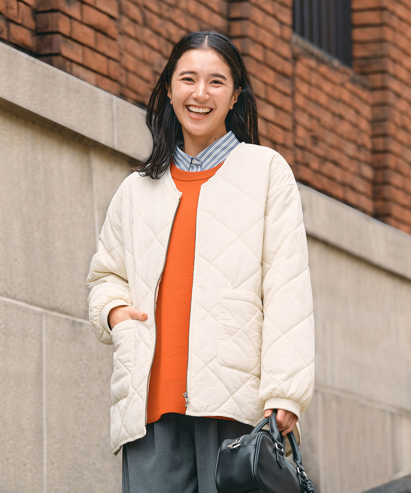 お尻にかかるくらいの着丈で気になる部分もカバー。とにかく軽量で快適な着心地。薄中綿素材で長いシーズン使える便利なアウター。【仕様】ベーシックな中綿入りキルティングジャケットは、シンプルかつコーディネートしやすいデザインが特徴。ややゆったりしたシルエットが動きやすさを提供し、フロントの大きめなポケットがアクセントに。どんなスタイルにも合わせやすく、デイリー使いに最適です。【素材】 100%ポリエステル製のため、軽量でありながら保温性にも優れています。肌触りがよく、ストレスなく着用できるため、春先や秋のはおりにもぴったり。普段使いからお出かけまで、幅広いシーンで活躍するアイテムです。 【スタイリング】 カジュアルなTシャツやタートルネックと合わせて、リラックスしたスタイルを楽しむのがオススメ。スキニーパンツやワイドパンツとの相性も良く、レイヤードスタイルでも活躍。スニーカーやブーツで足元をまとめると、クリーン感が引き立って、スタイリッシュな印象になります。