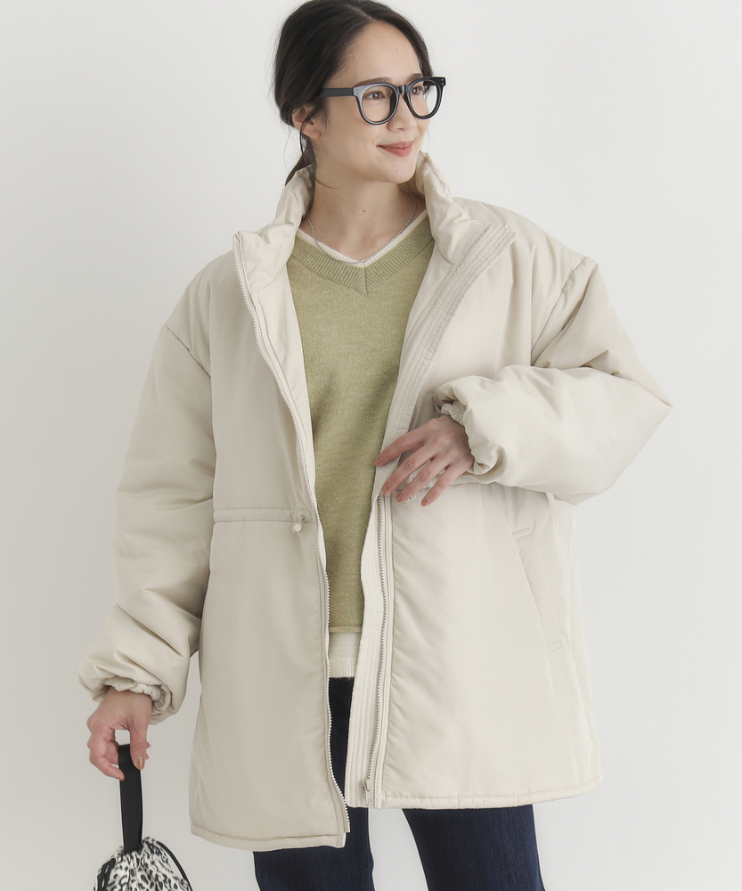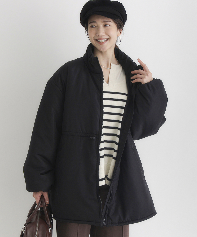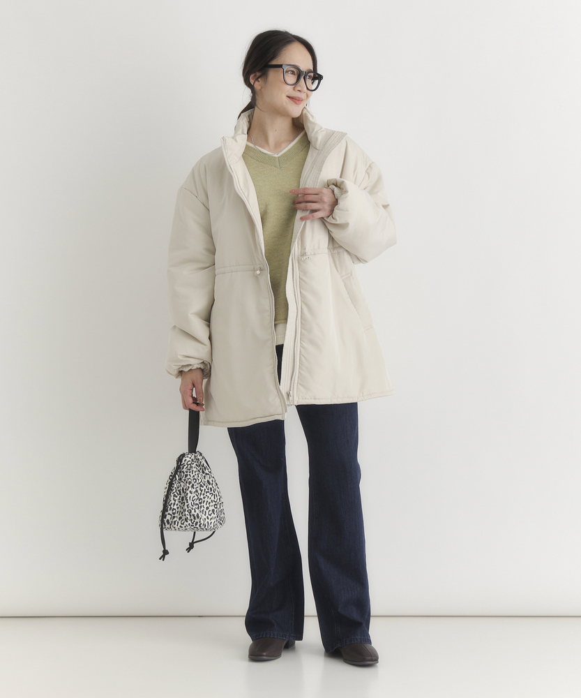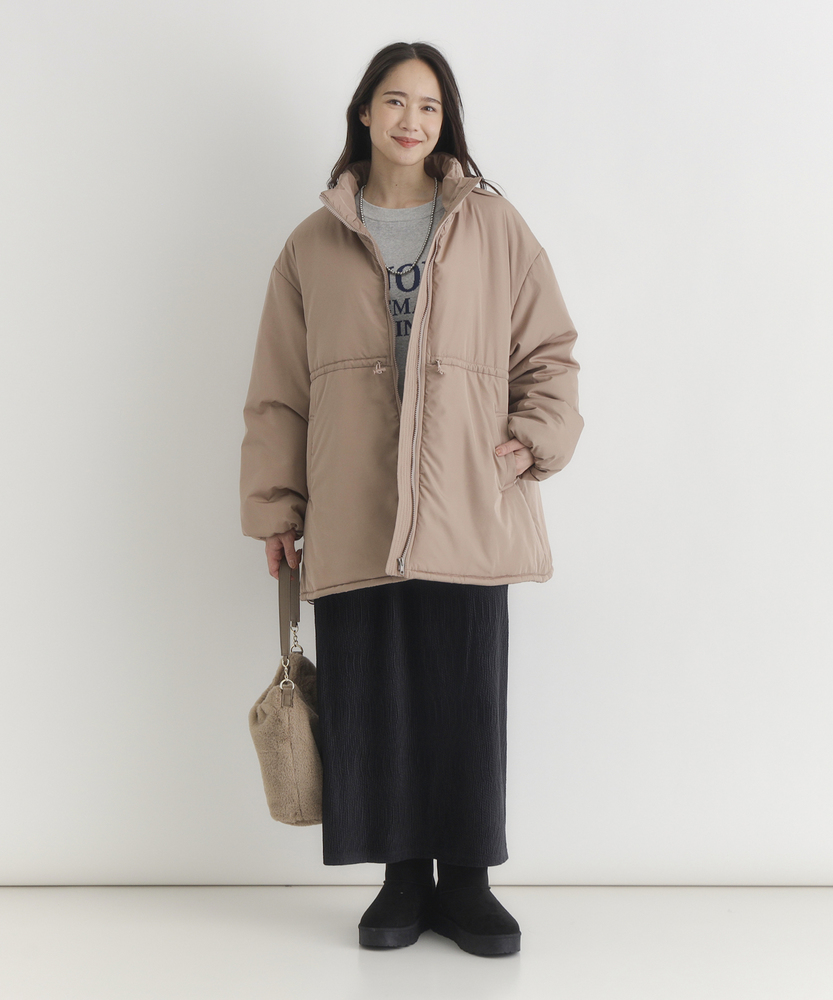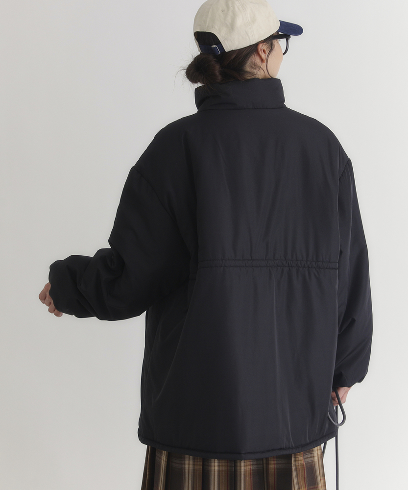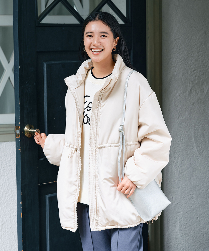 【仕様】スッキリとしたシルエットに拘った中綿ショートジャケットです。お尻まで隠れるミドル丈仕様となっており、ウエストのドロストで調整も可能です。フードは取り外しが可能で、シーンに応じた着こなしができるのもポイント。【素材】 ポリエステル100%の中綿が、軽量でありながら確かな保温性を提供。柔らかいタッチとしなやかな風合いが特徴で、着心地の良さを追求しています。外部からの風をしっかりと防ぎ、快適な温かさを保ちながらも、動きやすさも兼ね備えた機能的な素材です。 【スタイリング】 カジュアルなパンツやリブパンツと合わせて、休日のカジュアルスタイルにぴったり。レイヤードスタイルでタートルネックや薄手のニットを重ねると、シーズン感を楽しむことができます。シンプルなボトムに羽織るだけで、スタイリッシュでありながらも楽に過ごせるコーディネートを実現します。
