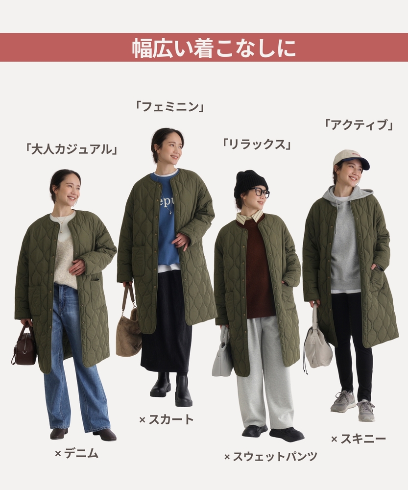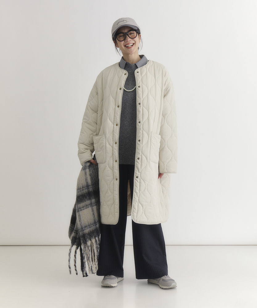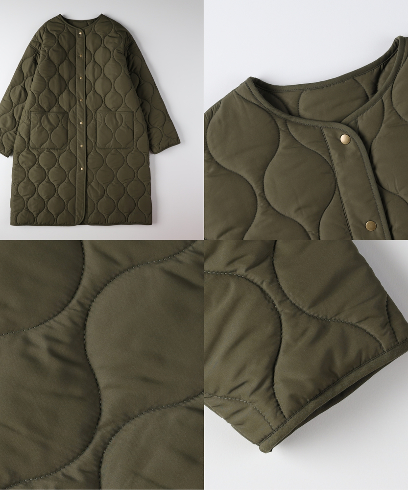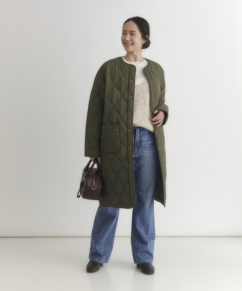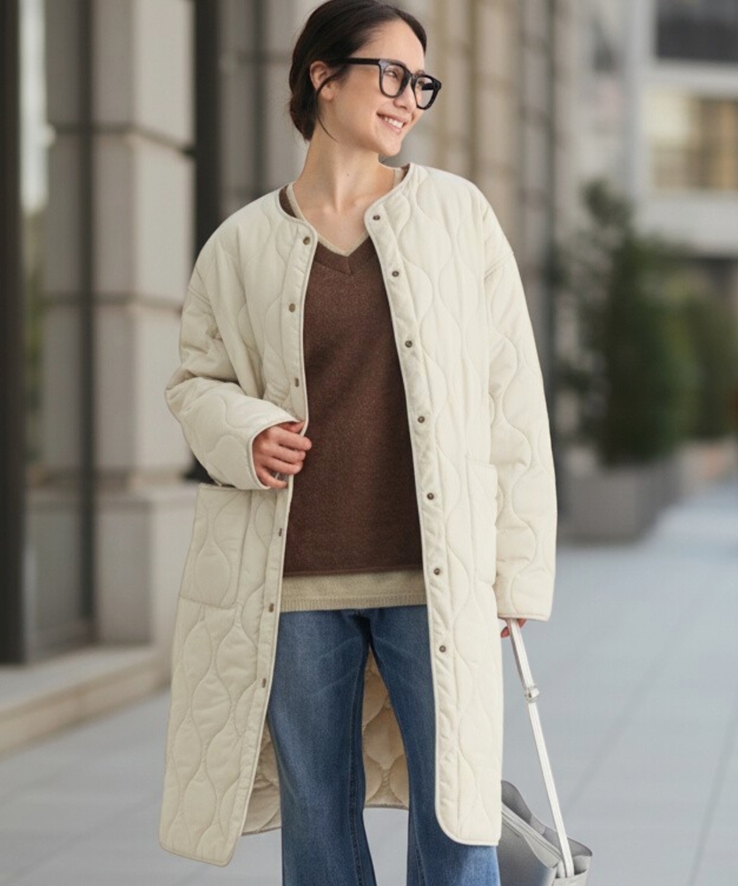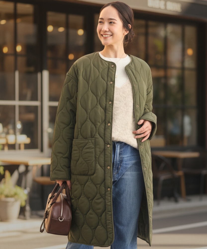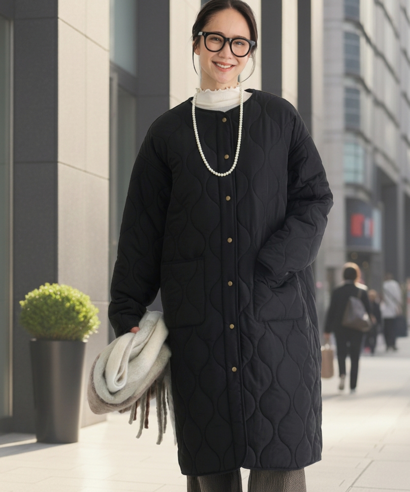 コスパ◎「結局、コレがいい。」羽織るだけでこなれ感。大人のキルティングコート。膝まで隠れる、安心のロング丈。気になる部分を"丸ごと"カバー。■Point・膝まで隠れる、安心のロング丈。気になるお尻や太もも周りを"丸ごと"カバー。寒い日のちょっとした外出でも、1枚でコーデが決まる&腰までしっかり暖かさをキープします。楽ちんなのに「手抜き感ゼロ」を叶えます。・「気楽に着れる」"丁度いい"厚さの中綿コート。厚すぎず、薄すぎない。気楽にサッと羽織れるのが魅力的。・「着ぶくれしにくい」改良されたシルエット。羽織るだけでOK。「野暮ったさ」とは無縁に。インナーを着込む日もきれいなシルエットに。・「軽い」から快適。長時間のお出かけや、お子様を抱っこする日もノーストレス。荷物が多くなりがちな日も、この軽さが味方になります。・ラフに使える大きめポケット大きめな仕様にする事で、小物もラクラク収納。・艶感を抑えたカジュアルコーデに馴染むボタン。普段使いし易いようにボタンの艶感を出来る限り抑えました。・マフラーも、パーカーも。自在に楽しむノーカラー。顔周りがすっきり見えるノーカラー仕様。冬の必需品であるマフラーやストールを巻いても"もたつかず"、パーカーとの重ね着もきれいに決まります。【仕様】洗練されたシルエットが特徴のキルティングロングコート。すっきりとした着丈は、ゆったりとしたサイズ感ながらも女性らしさを引き立て、どんなスタイリングにも合わせやすい万能な一枚です。フロントポケットが実用的でありながら、全体にマットな質感を持つため、落ち着いた印象を与えます。【素材】 軽量で暖かいキルティング生地を使用し、中に着込んでもスマートに見えるのが魅力。ポリエステル素材は、日常使いに最適な耐久性を兼ね備え、長く愛用できるアイテムに仕上がっています。落ち着いたトーンの色味が、シンプルながらも上品さを感じさせます。 【スタイリング】 スリムなパンツやスカートと合わせることで、全体のバランスを整え都会的な雰囲気を楽しめます。シンプルなニットやカジュアルなシャツと組み合わせれば、レイヤリングもおしゃれに決まります。印象的なカラーと質感を活かしたコーディネートで、洗練されたデイリースタイルを完成させましょう。 ※こちらの商品はオンラインショップ、一部店舗での限定展開となります。また店頭での発売日と前後する可能性がございます。予めご了承下さい。