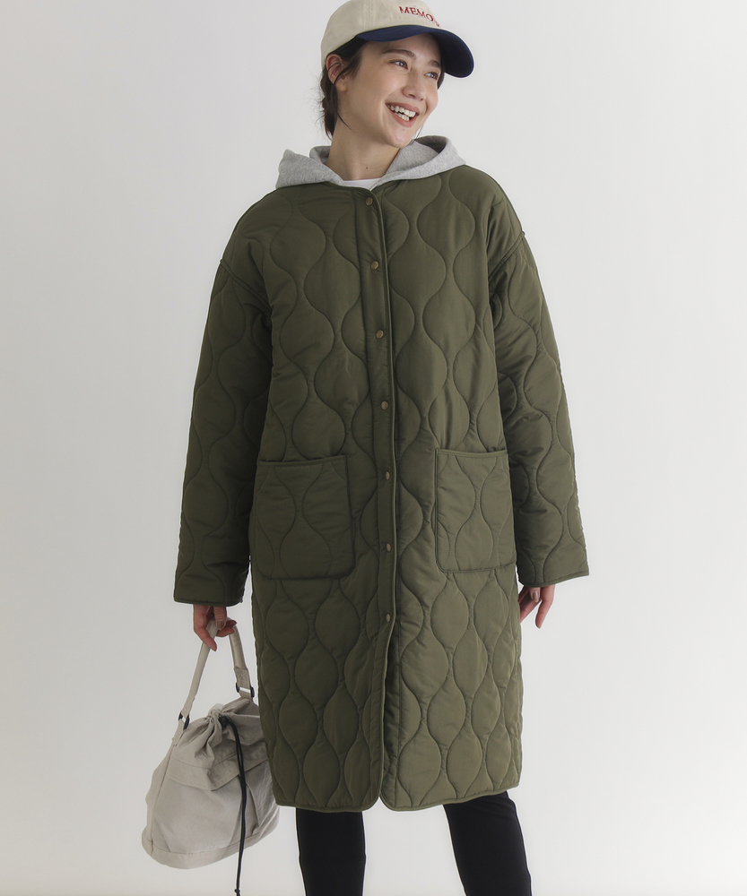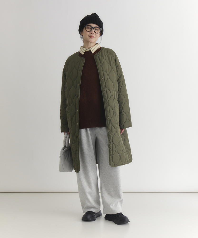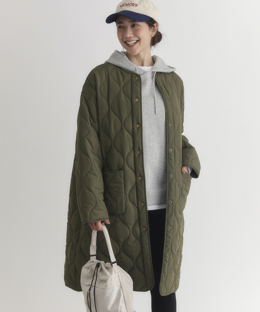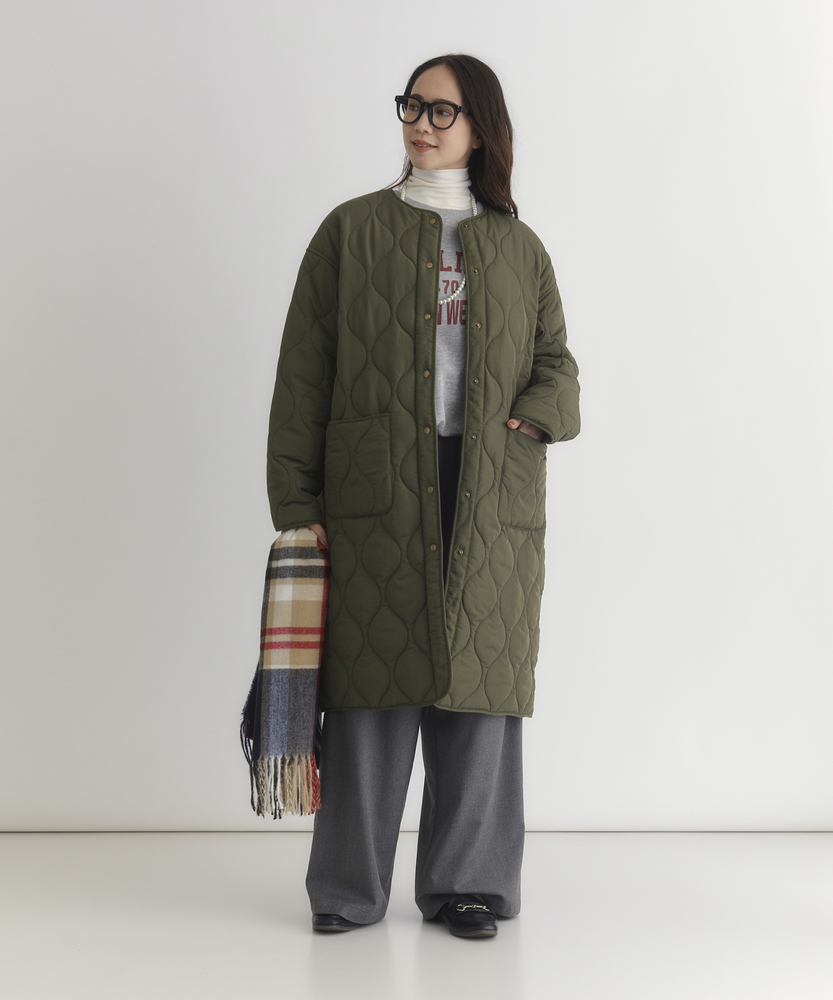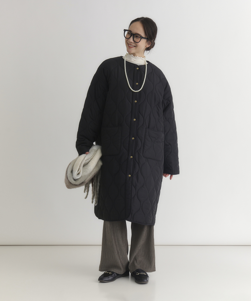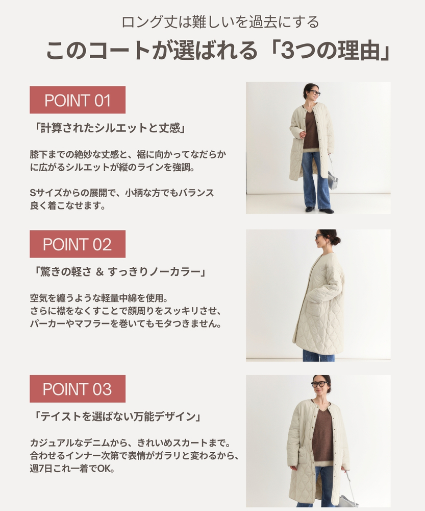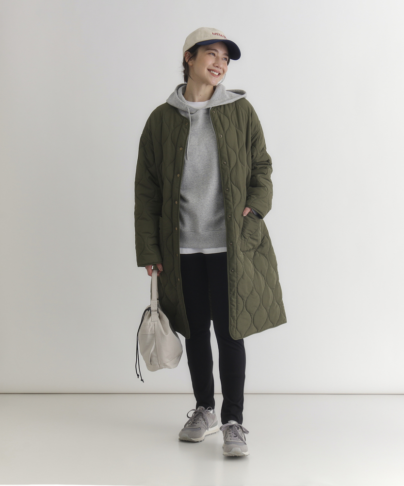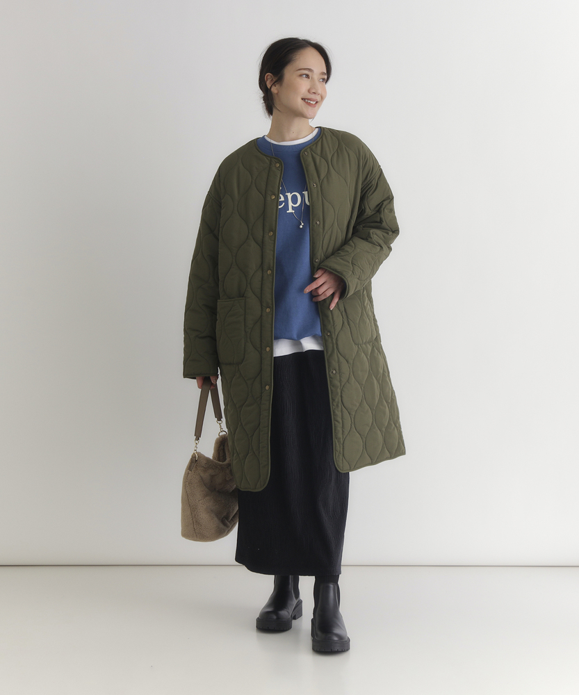 コスパ◎「結局、コレがいい。」羽織るだけでこなれ感。大人のキルティングコート。膝まで隠れる、安心のロング丈。気になる部分を"丸ごと"カバー。■Point・膝まで隠れる、安心のロング丈。気になるお尻や太もも周りを"丸ごと"カバー。寒い日のちょっとした外出でも、1枚でコーデが決まる&腰までしっかり暖かさをキープします。楽ちんなのに「手抜き感ゼロ」を叶えます。・「気楽に着れる」"丁度いい"厚さの中綿コート。厚すぎず、薄すぎない。気楽にサッと羽織れるのが魅力的。・「着ぶくれしにくい」改良されたシルエット。羽織るだけでOK。「野暮ったさ」とは無縁に。インナーを着込む日もきれいなシルエットに。・「軽い」から快適。長時間のお出かけや、お子様を抱っこする日もノーストレス。荷物が多くなりがちな日も、この軽さが味方になります。・ラフに使える大きめポケット大きめな仕様にする事で、小物もラクラク収納。・艶感を抑えたカジュアルコーデに馴染むボタン。普段使いし易いようにボタンの艶感を出来る限り抑えました。・マフラーも、パーカーも。自在に楽しむノーカラー。顔周りがすっきり見えるノーカラー仕様。冬の必需品であるマフラーやストールを巻いても"もたつかず"、パーカーとの重ね着もきれいに決まります。【仕様】洗練されたシルエットが特徴のキルティングロングコート。すっきりとした着丈は、ゆったりとしたサイズ感ながらも女性らしさを引き立て、どんなスタイリングにも合わせやすい万能な一枚です。フロントポケットが実用的でありながら、全体にマットな質感を持つため、落ち着いた印象を与えます。【素材】 軽量で暖かいキルティング生地を使用し、中に着込んでもスマートに見えるのが魅力。ポリエステル素材は、日常使いに最適な耐久性を兼ね備え、長く愛用できるアイテムに仕上がっています。落ち着いたトーンの色味が、シンプルながらも上品さを感じさせます。 【スタイリング】 スリムなパンツやスカートと合わせることで、全体のバランスを整え都会的な雰囲気を楽しめます。シンプルなニットやカジュアルなシャツと組み合わせれば、レイヤリングもおしゃれに決まります。印象的なカラーと質感を活かしたコーディネートで、洗練されたデイリースタイルを完成させましょう。 ※こちらの商品はオンラインショップ、一部店舗での限定展開となります。また店頭での発売日と前後する可能性がございます。予めご了承下さい。