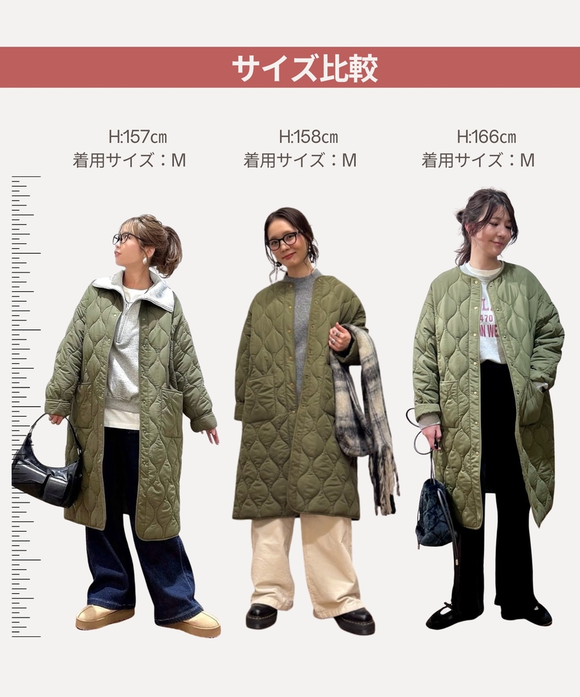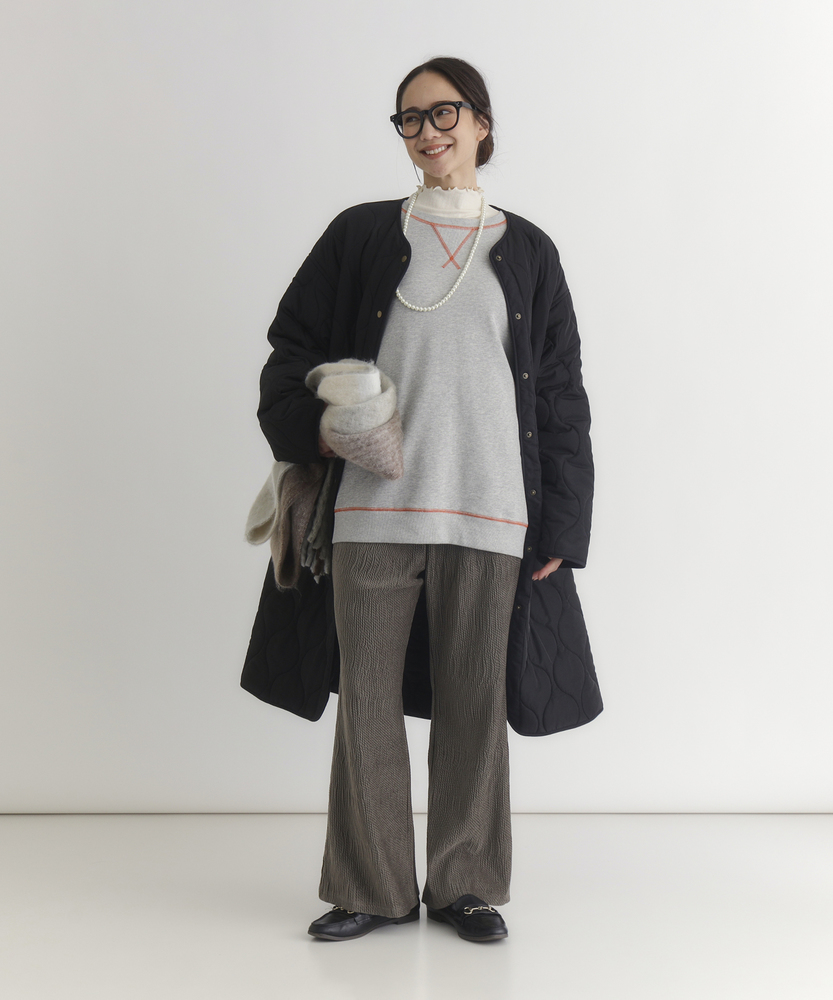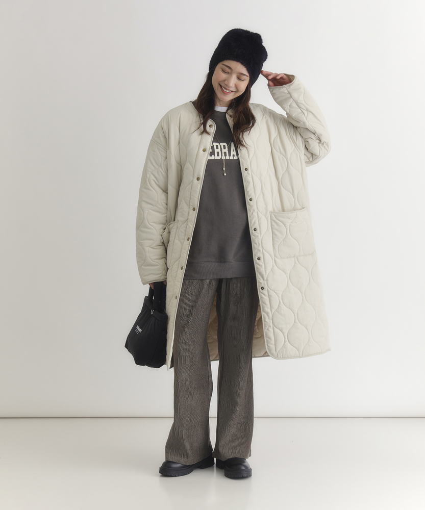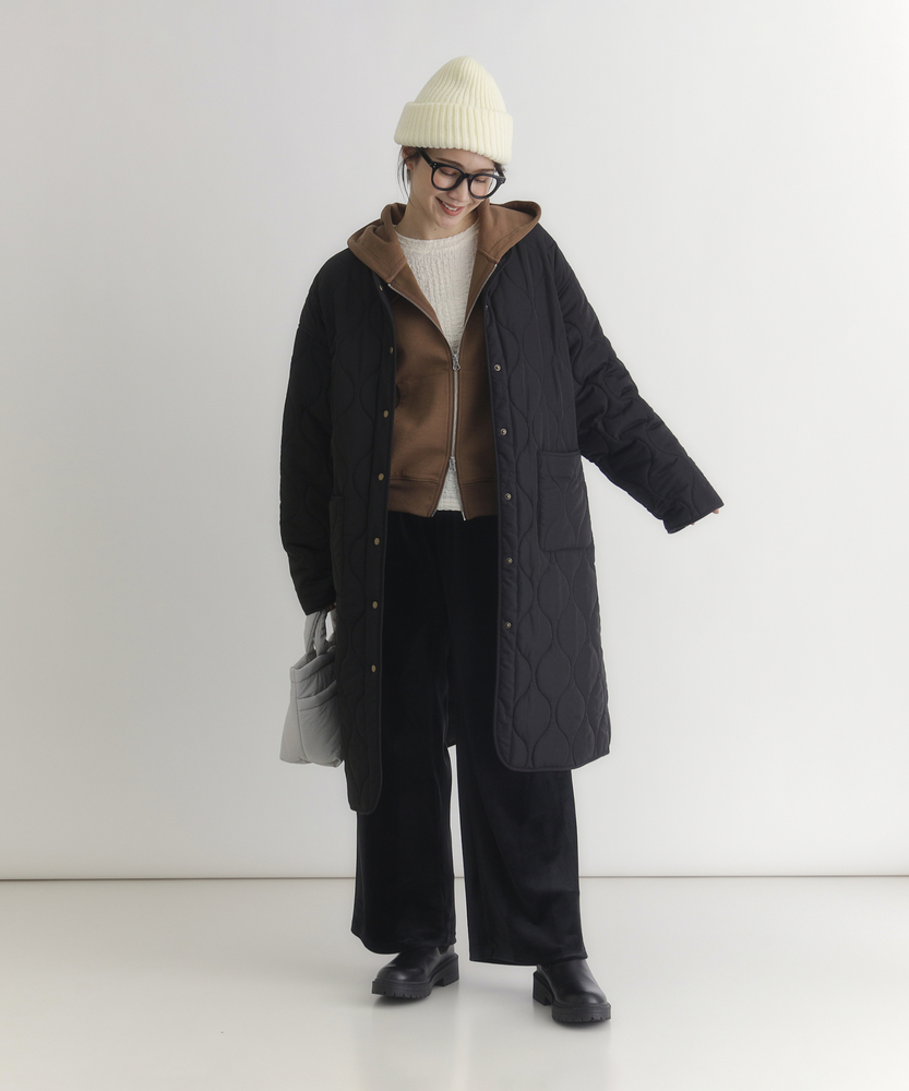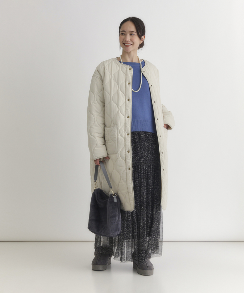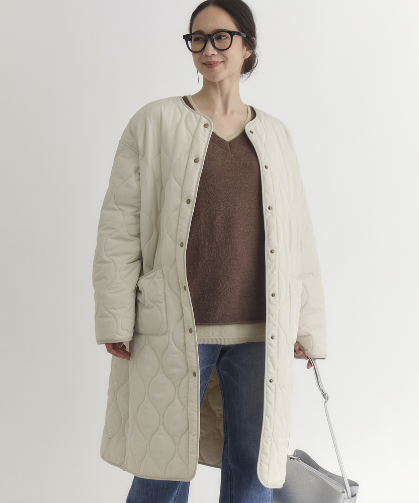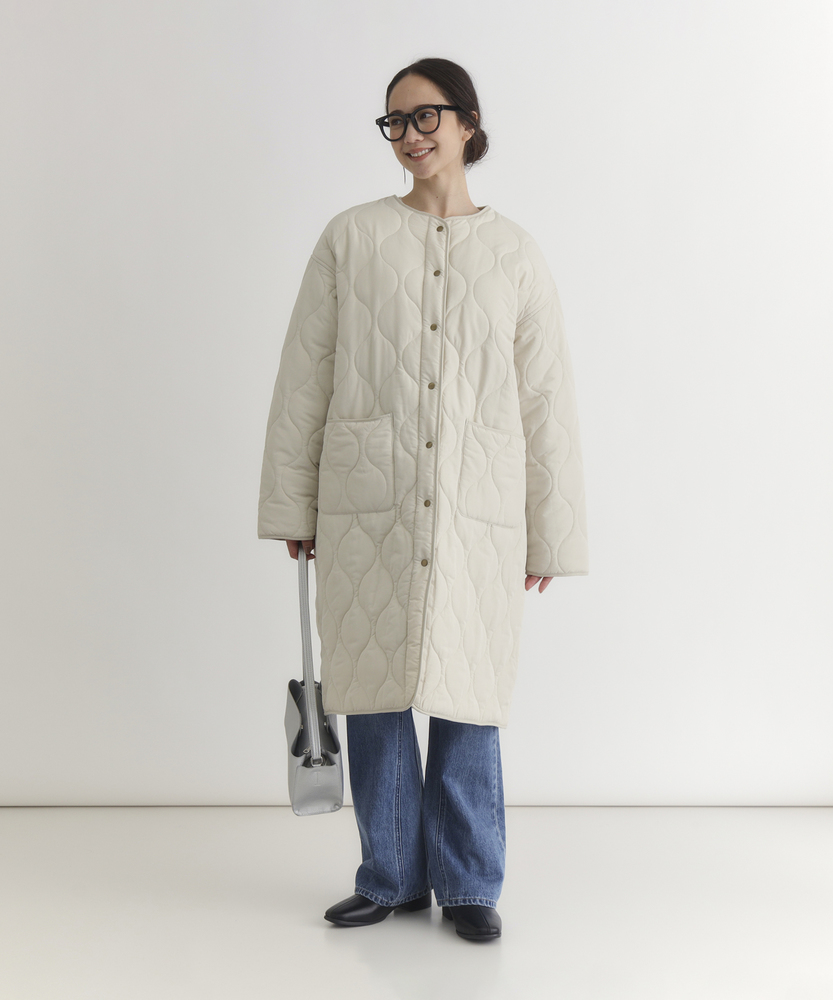コスパ◎「結局、コレがいい。」羽織るだけでこなれ感。大人のキルティングコート。膝まで隠れる、安心のロング丈。気になる部分を"丸ごと"カバー。■Point・膝まで隠れる、安心のロング丈。気になるお尻や太もも周りを"丸ごと"カバー。寒い日のちょっとした外出でも、1枚でコーデが決まる&腰までしっかり暖かさをキープします。楽ちんなのに「手抜き感ゼロ」を叶えます。・「気楽に着れる」"丁度いい"厚さの中綿コート。厚すぎず、薄すぎない。気楽にサッと羽織れるのが魅力的。・「着ぶくれしにくい」改良されたシルエット。羽織るだけでOK。「野暮ったさ」とは無縁に。インナーを着込む日もきれいなシルエットに。・「軽い」から快適。長時間のお出かけや、お子様を抱っこする日もノーストレス。荷物が多くなりがちな日も、この軽さが味方になります。・ラフに使える大きめポケット大きめな仕様にする事で、小物もラクラク収納。・艶感を抑えたカジュアルコーデに馴染むボタン。普段使いし易いようにボタンの艶感を出来る限り抑えました。・マフラーも、パーカーも。自在に楽しむノーカラー。顔周りがすっきり見えるノーカラー仕様。冬の必需品であるマフラーやストールを巻いても"もたつかず"、パーカーとの重ね着もきれいに決まります。【仕様】洗練されたシルエットが特徴のキルティングロングコート。すっきりとした着丈は、ゆったりとしたサイズ感ながらも女性らしさを引き立て、どんなスタイリングにも合わせやすい万能な一枚です。フロントポケットが実用的でありながら、全体にマットな質感を持つため、落ち着いた印象を与えます。【素材】 軽量で暖かいキルティング生地を使用し、中に着込んでもスマートに見えるのが魅力。ポリエステル素材は、日常使いに最適な耐久性を兼ね備え、長く愛用できるアイテムに仕上がっています。落ち着いたトーンの色味が、シンプルながらも上品さを感じさせます。 【スタイリング】 スリムなパンツやスカートと合わせることで、全体のバランスを整え都会的な雰囲気を楽しめます。シンプルなニットやカジュアルなシャツと組み合わせれば、レイヤリングもおしゃれに決まります。印象的なカラーと質感を活かしたコーディネートで、洗練されたデイリースタイルを完成させましょう。 ※こちらの商品はオンラインショップ、一部店舗での限定展開となります。また店頭での発売日と前後する可能性がございます。予めご了承下さい。