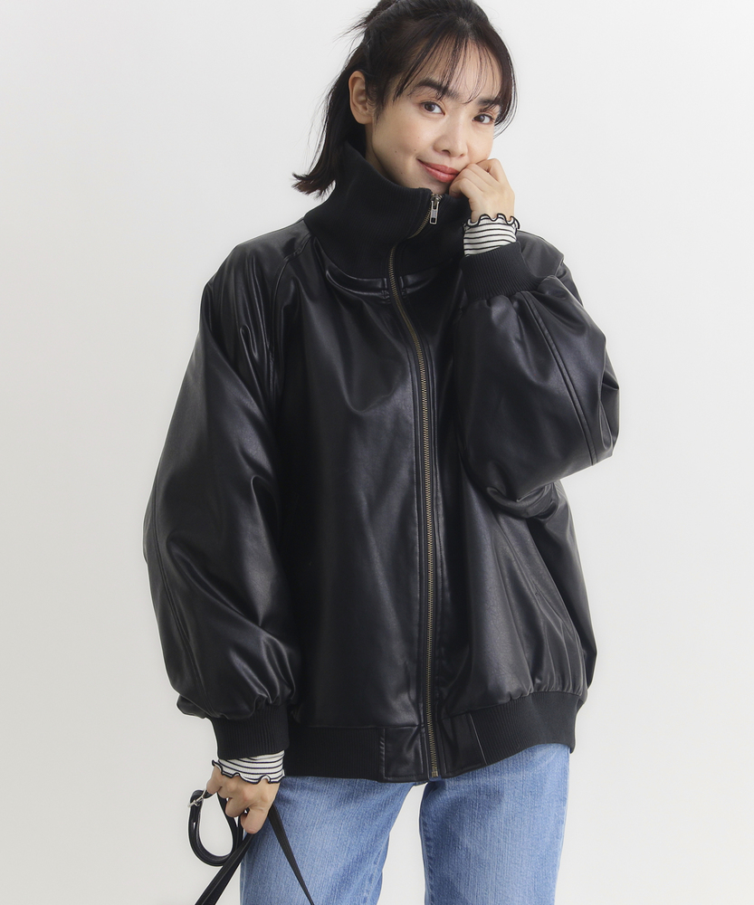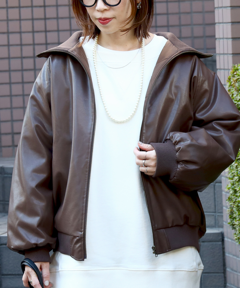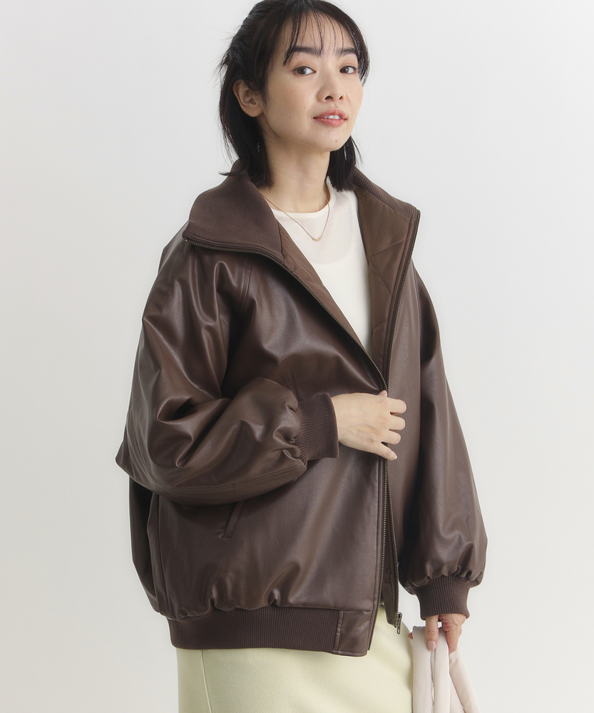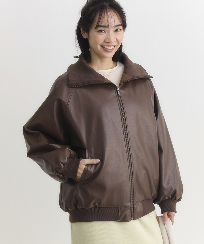 【仕様】シンプルなフロントジップデザインが特徴のフェイクレザーブルゾン。トレンド感を取り入れつつ、合わせやすいブラックとブラウンの色展開で、カジュアルからエレガントまで幅広いスタイルに対応します。【素材】 柔らかさと耐久性を兼ね備えた素材は、見た目の高級感を持ちながらも取り扱いが容易。シーズンを問わず、長く愛用できるアイテムです。 【スタイリング】 ゆったりとしたサイズ感で、ニットや薄手のインナーとの重ね着もすっきりと決まります。リブ仕様の衿ぐりが小顔効果を演出し、スタイリッシュなシルエットを引き立てます。使い勝手の良いシンプルなデザインとトレンドのレザー素材で、スタイルを選ばない一着。普段使いから特別なシーンまで、着まわしの効くアイテムとして活躍します。 ※こちらの商品はオンラインショップ、一部店舗での限定展開となります。また店頭での発売日と前後する可能性がございます。予めご了承下さい。