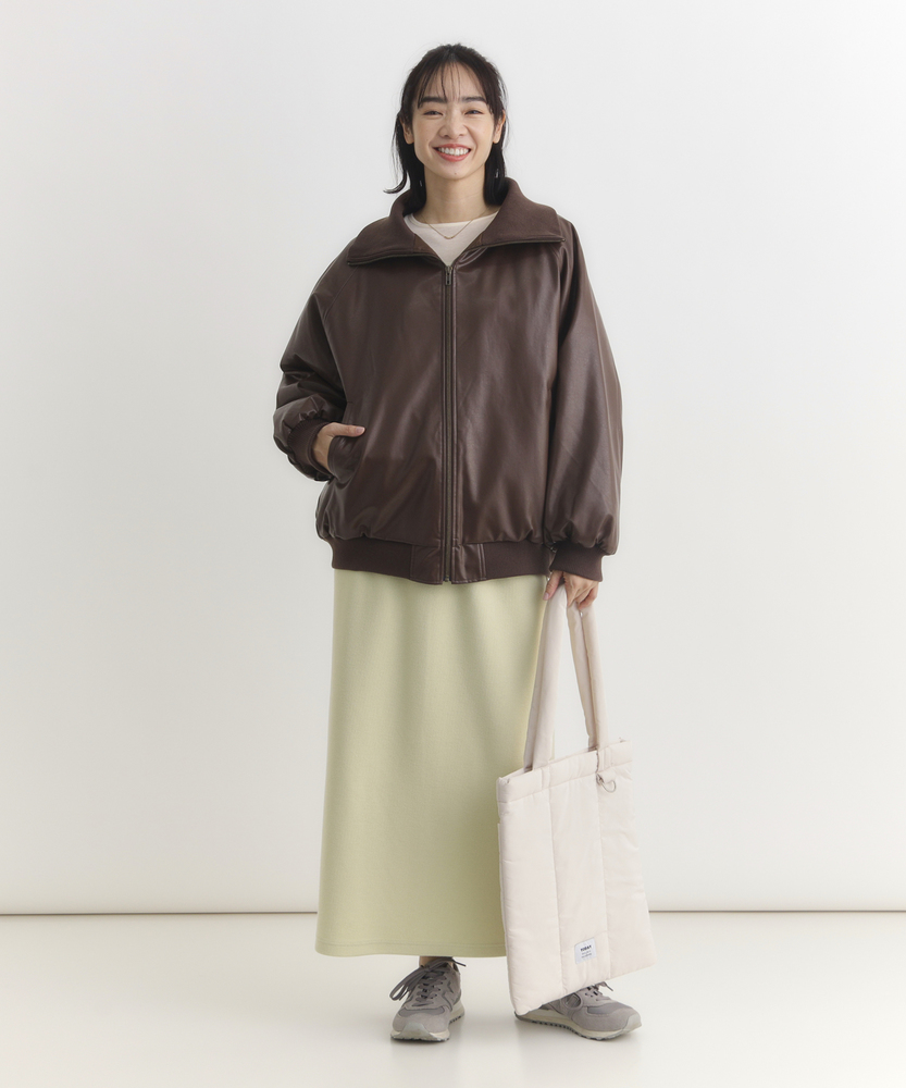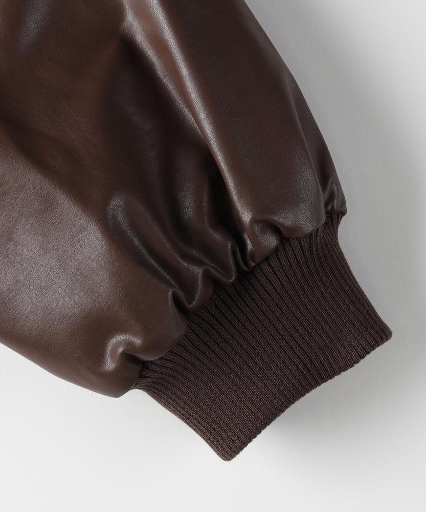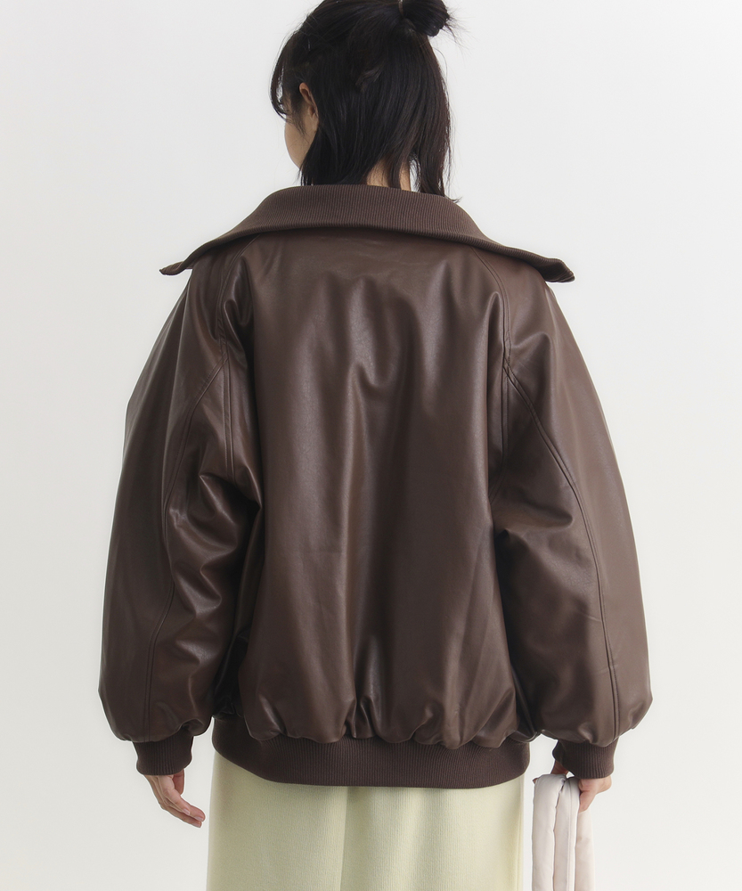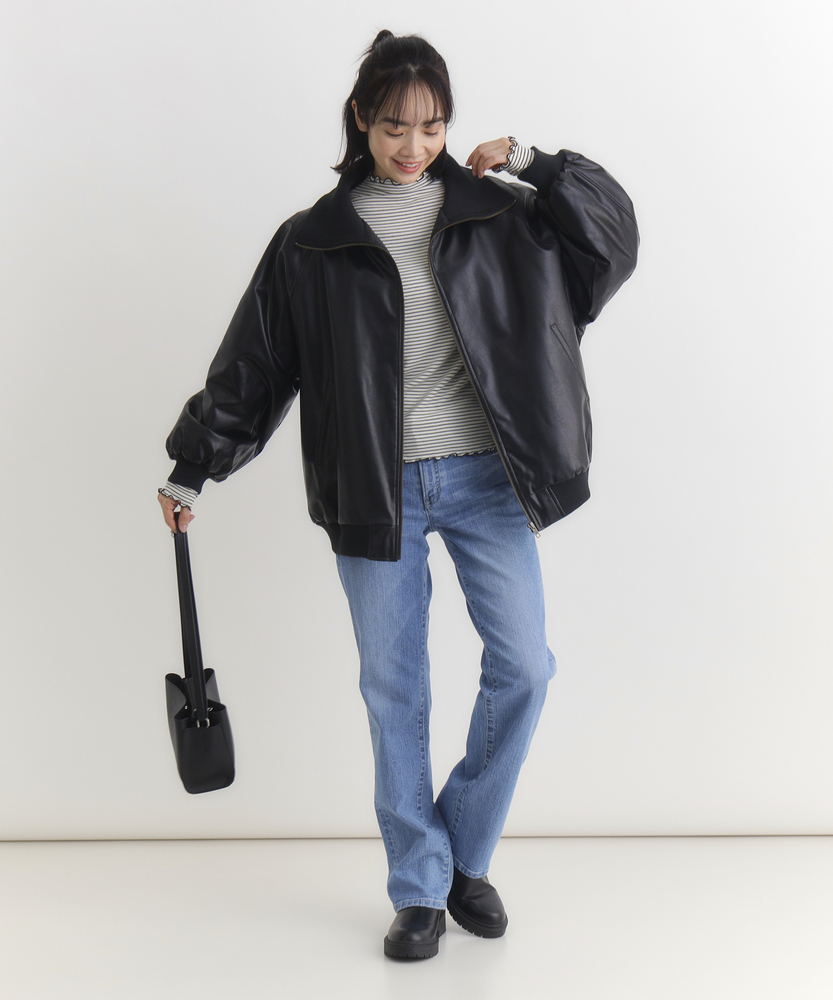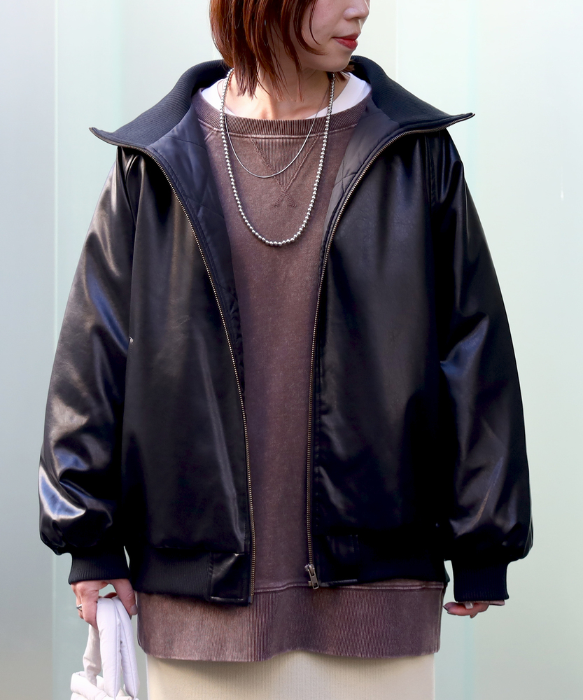 【仕様】シンプルなフロントジップデザインが特徴のフェイクレザーブルゾン。トレンド感を取り入れつつ、合わせやすいブラックとブラウンの色展開で、カジュアルからエレガントまで幅広いスタイルに対応します。【素材】 柔らかさと耐久性を兼ね備えた素材は、見た目の高級感を持ちながらも取り扱いが容易。シーズンを問わず、長く愛用できるアイテムです。 【スタイリング】 ゆったりとしたサイズ感で、ニットや薄手のインナーとの重ね着もすっきりと決まります。リブ仕様の衿ぐりが小顔効果を演出し、スタイリッシュなシルエットを引き立てます。使い勝手の良いシンプルなデザインとトレンドのレザー素材で、スタイルを選ばない一着。普段使いから特別なシーンまで、着まわしの効くアイテムとして活躍します。 ※こちらの商品はオンラインショップ、一部店舗での限定展開となります。また店頭での発売日と前後する可能性がございます。予めご了承下さい。