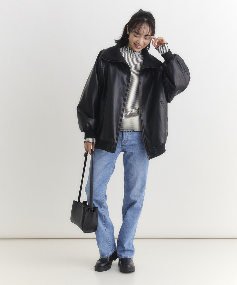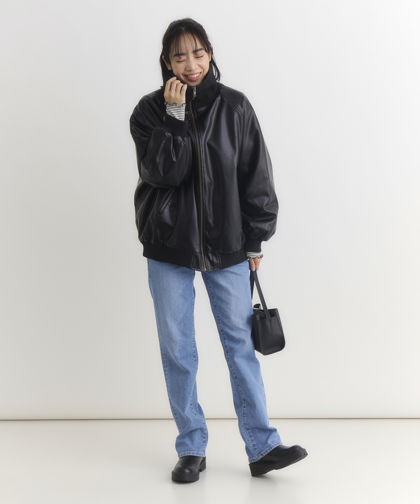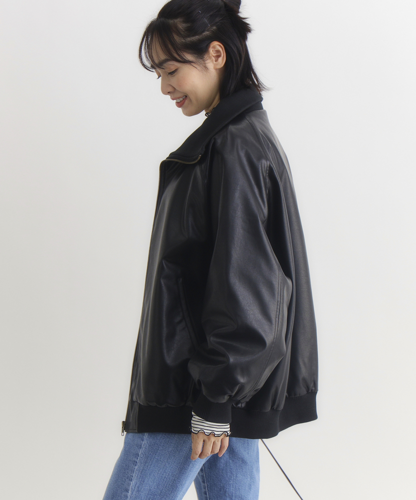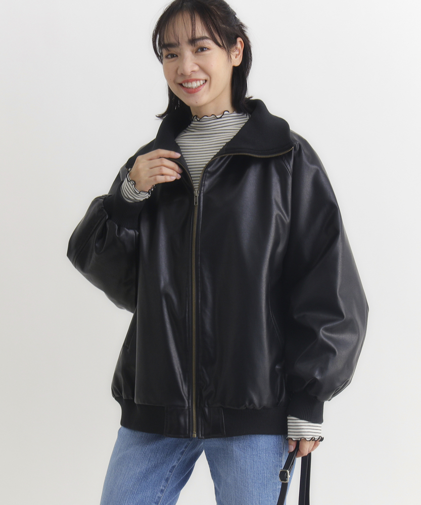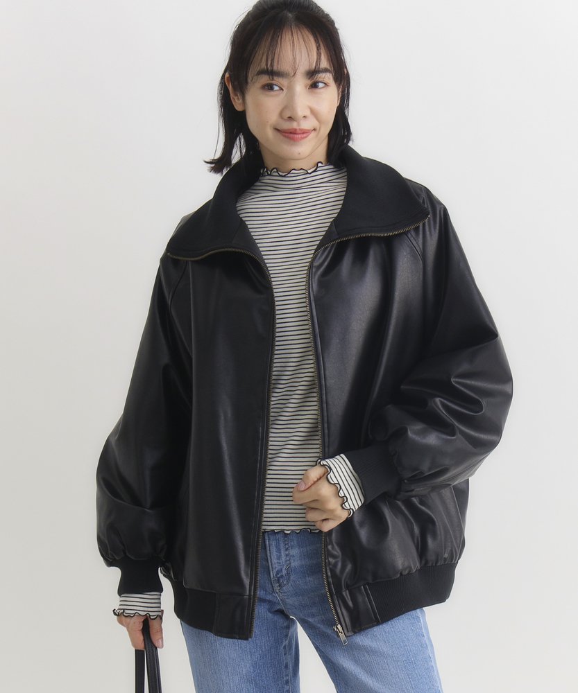 【仕様】シンプルなフロントジップデザインが特徴のフェイクレザーブルゾン。トレンド感を取り入れつつ、合わせやすいブラックとブラウンの色展開で、カジュアルからエレガントまで幅広いスタイルに対応します。【素材】 柔らかさと耐久性を兼ね備えた素材は、見た目の高級感を持ちながらも取り扱いが容易。シーズンを問わず、長く愛用できるアイテムです。 【スタイリング】 ゆったりとしたサイズ感で、ニットや薄手のインナーとの重ね着もすっきりと決まります。リブ仕様の衿ぐりが小顔効果を演出し、スタイリッシュなシルエットを引き立てます。使い勝手の良いシンプルなデザインとトレンドのレザー素材で、スタイルを選ばない一着。普段使いから特別なシーンまで、着まわしの効くアイテムとして活躍します。 ※こちらの商品はオンラインショップ、一部店舗での限定展開となります。また店頭での発売日と前後する可能性がございます。予めご了承下さい。