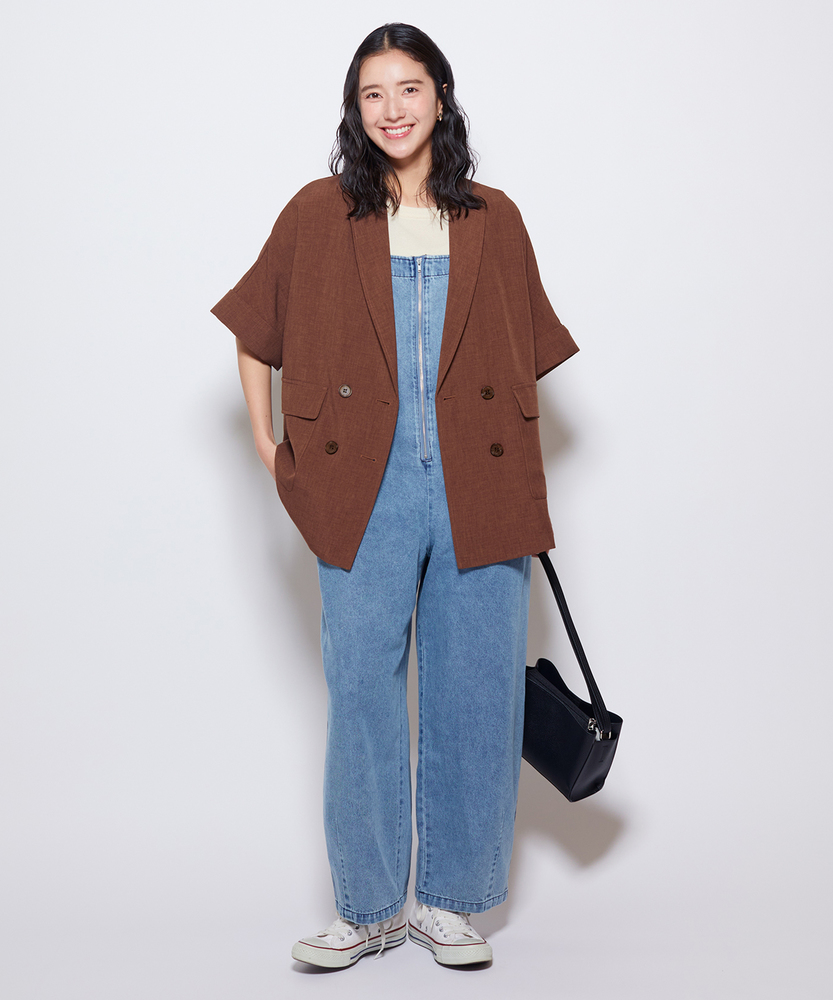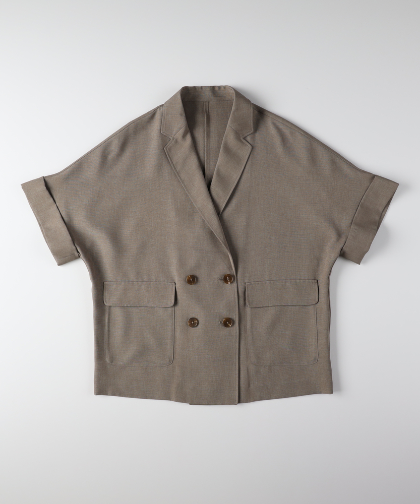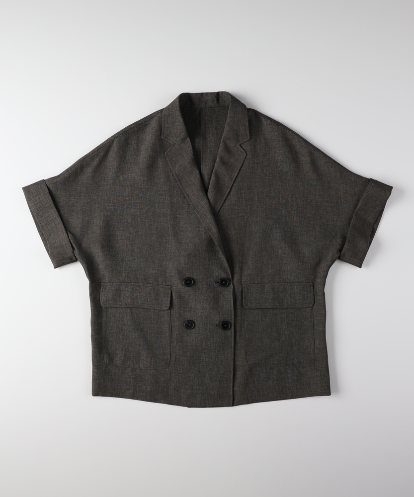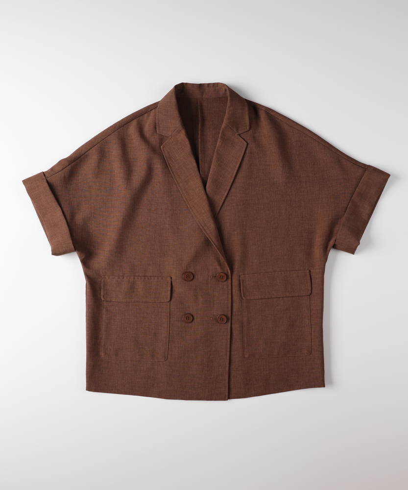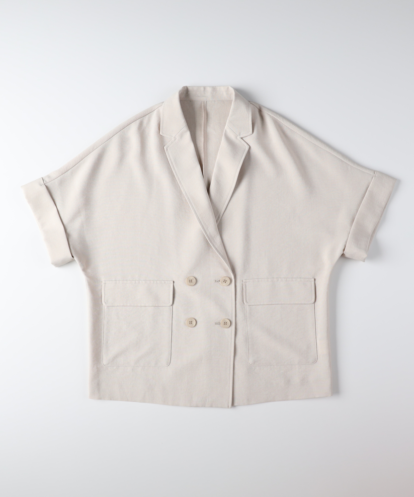 さっと羽織って、脱・無難。大人の「抜け感」ジャケット。二の腕を隠して、スタイルアップ。カーディガン感覚で使える軽やかさ。「きちんと」も「ラフ」も。オンオフ活躍する、ワードローブの新定番。■Point・二の腕すっきり「ハーフスリーブ」気になる二の腕をしっかりカバーする絶妙な袖丈。袖口を広めに設定することで、腕の華奢見え効果も。Tシャツ一枚では心許ない時の羽織りとして最適です。・大人の品格漂う「ダブルブレスト」クラシカルなダブルボタンが、コーデのアクセントに。マニッシュなデザインながら、短めの袖で女性らしさをプラス。羽織るだけで、いつものスタイルが洗練された印象へ。・身体が泳ぐ「リラックスシルエット」程よくゆとりを持たせた、ボクシーなライン。身体のラインを拾わず、ストレスフリーな着心地。インナーを選ばず、レイヤードもスムーズに決まります。・カーディガン感覚の「軽やかさ」ジャケット特有の堅苦しさを感じさせない、軽い仕上がり。冷房対策や、季節の変わり目の体温調節にも重宝します。気負わずデイリーに使える、頼れる一枚です。・こなれ感を演出する「袖口デザイン」袖口は折り返し仕様で、手元に表情をプラス。時計やブレスレットなどのアクセサリーも映えます。細部までこだわったディテールが、おしゃれ心をくすぐります。・さらりと快適な「ドライタッチ」見た目にも涼しげな、清涼感のある素材の表情。汗ばむ季節も肌に張り付かず、快適に過ごせます。シワになりにくい質感で、持ち運びにも便利。【仕様】テーラードジャケットのかっちり感を残しつつ、ハーフスリーブで軽やかに仕上げた一着です。ダブルブレストのクラシカルな表情と、ゆったりとしたオーバーサイズ気味のシルエットが、トレンド感のある「大人の抜け感」を演出。大きめのフラップポケットが実用性とデザインのアクセントを兼ね備えています。【素材】リネンのようなナチュラルな風合いと、ドライな肌触りを併せ持つ素材を使用しています。適度なハリ感がありながらも柔らかく、落ち感があるためシルエットが綺麗に出ます。通気性が良くさらりとしているので、春先から初秋までロングシーズン快適に着用いただけます。【スタイリング】ロゴTシャツにデニムやサロペットを合わせた、大人のカジュアルダウンスタイルがおすすめ。袖を通さず肩掛けすれば、こなれ感たっぷりの装いに。同系色のボトムスと合わせてセットアップ風に着こなせば、オフィスカジュアルやちょっとしたお出かけにも対応します。ワンピースの羽織りとしてもバランス良く決まります。 【セットアップで着用可能なアイテムはこちら】HR26102200011 【そよラク】コクーンパンツ/セットアップ対応
